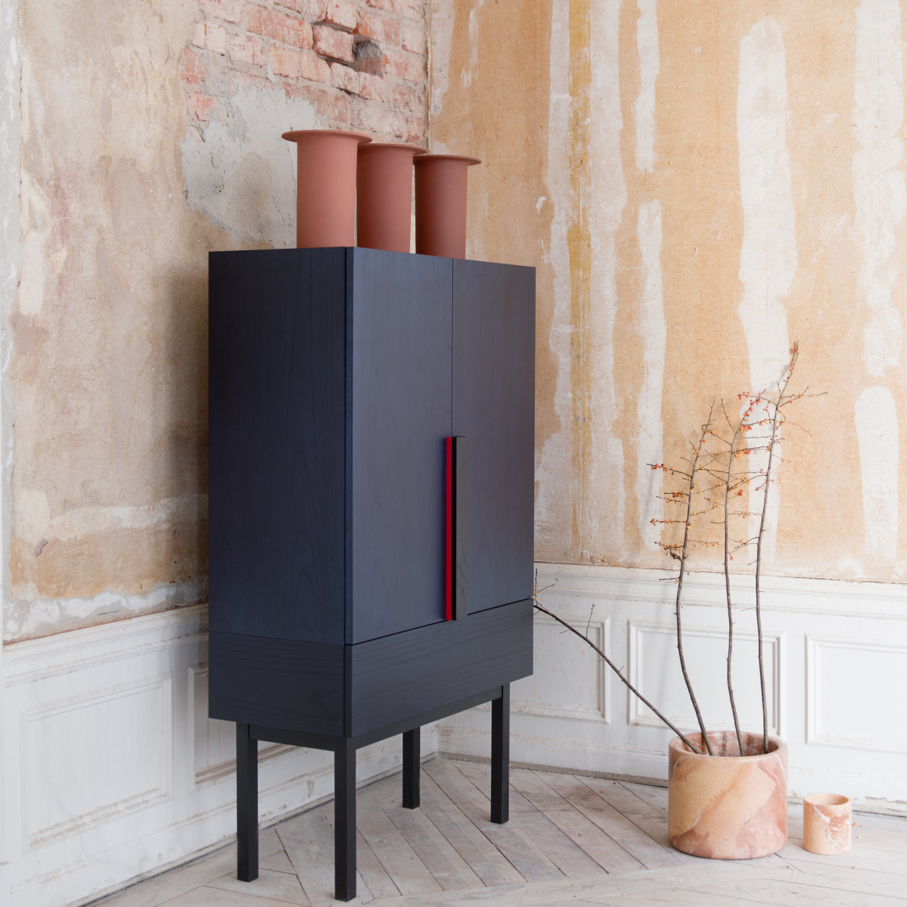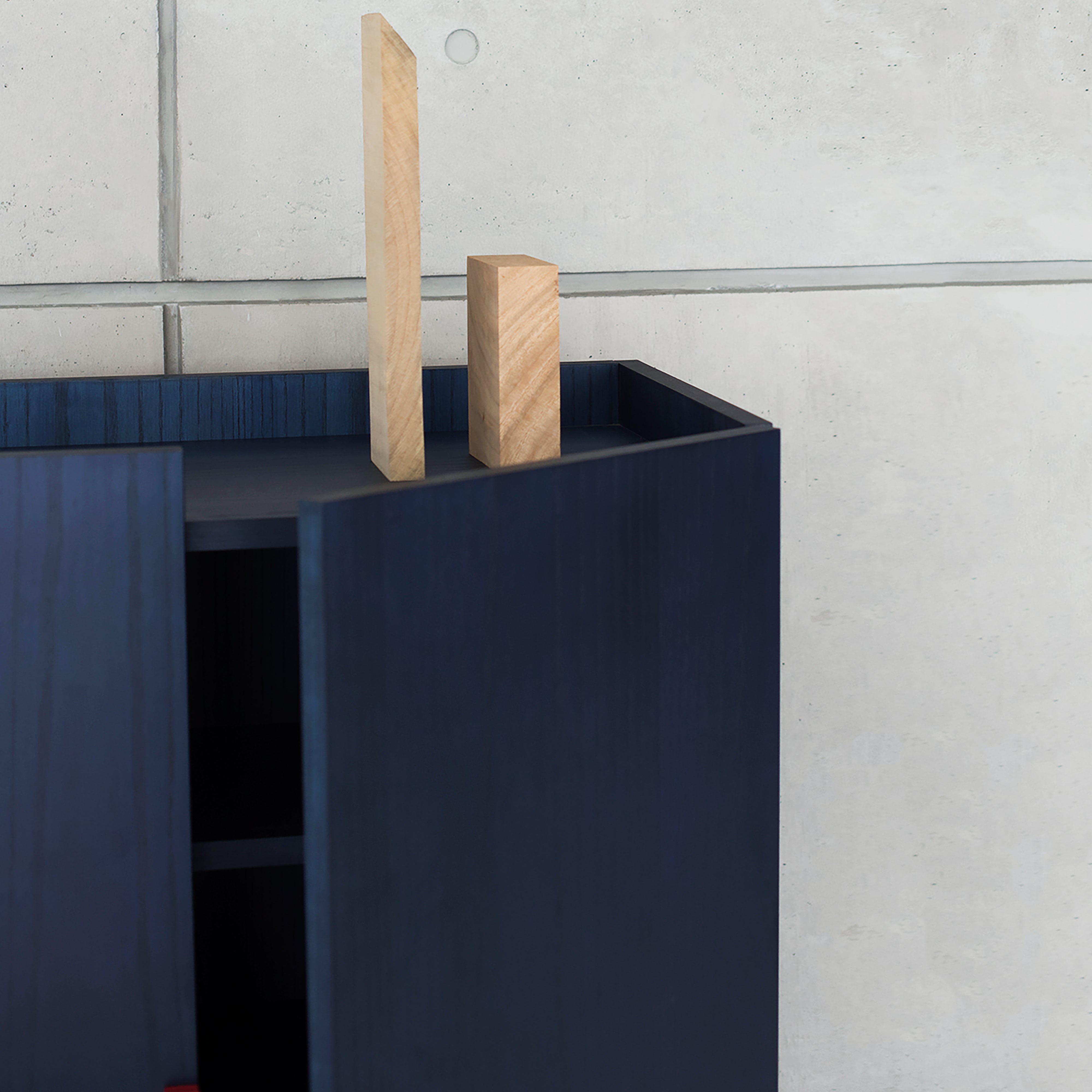 Named for Japanese indigo, Aizome Wardrobe provides ample storage for clothing and other soft-goods and includes a concealed second handle and a recessed top surface for additional items. Designer Zoe Mowat puts a modern slant on traditional Japanese colors with the cabinet’s finishes that incorporate sumi ink, red dye, and 2 shades of indigo.