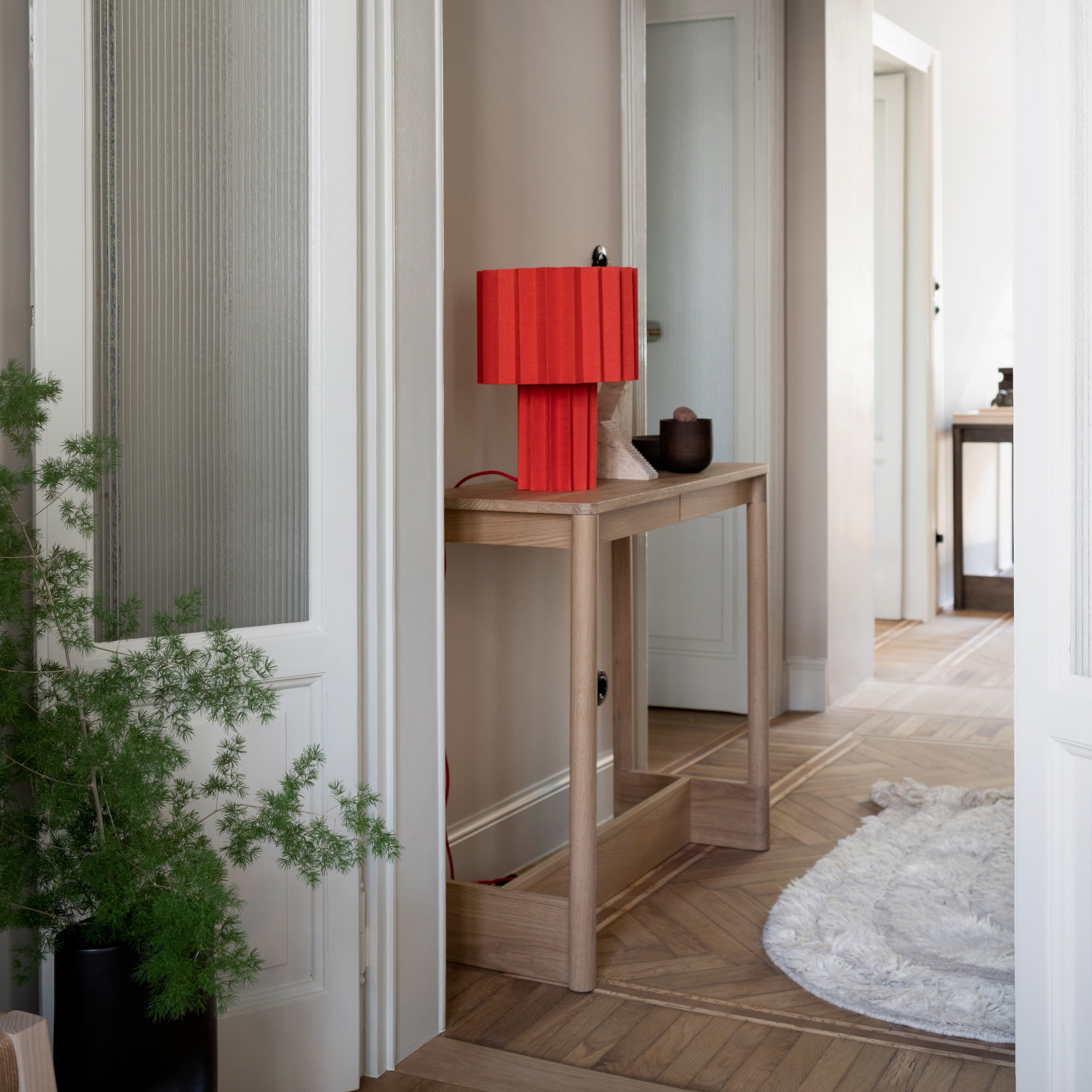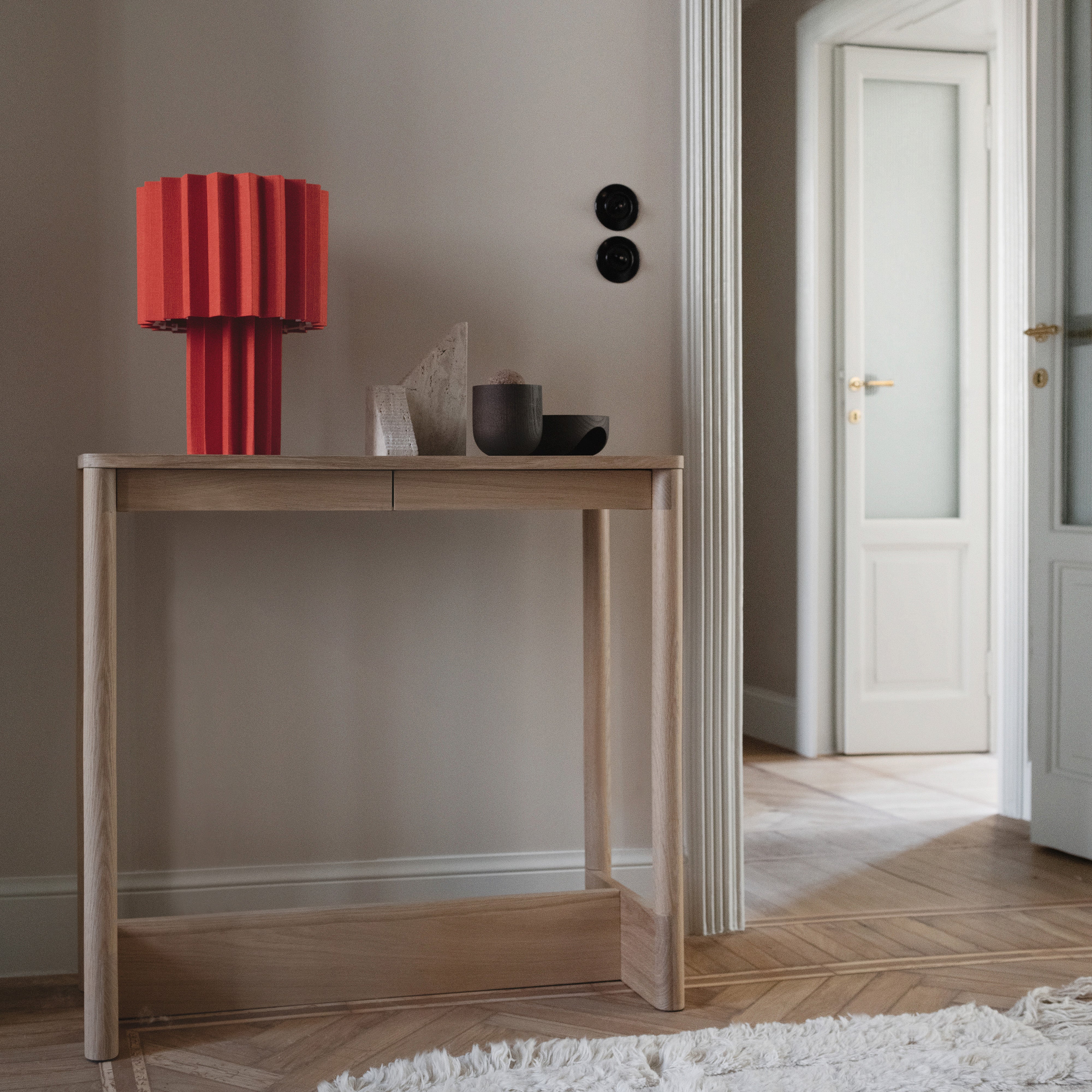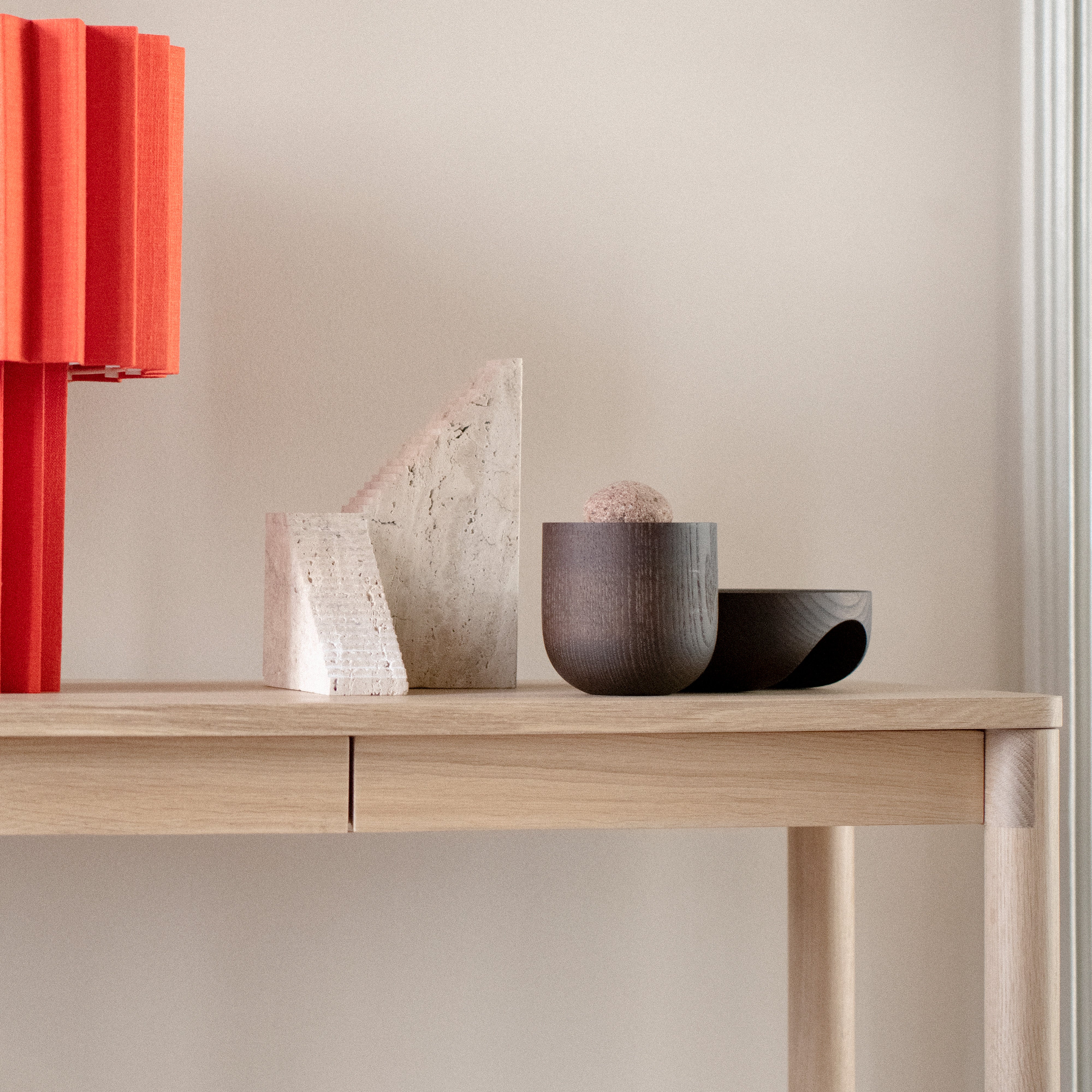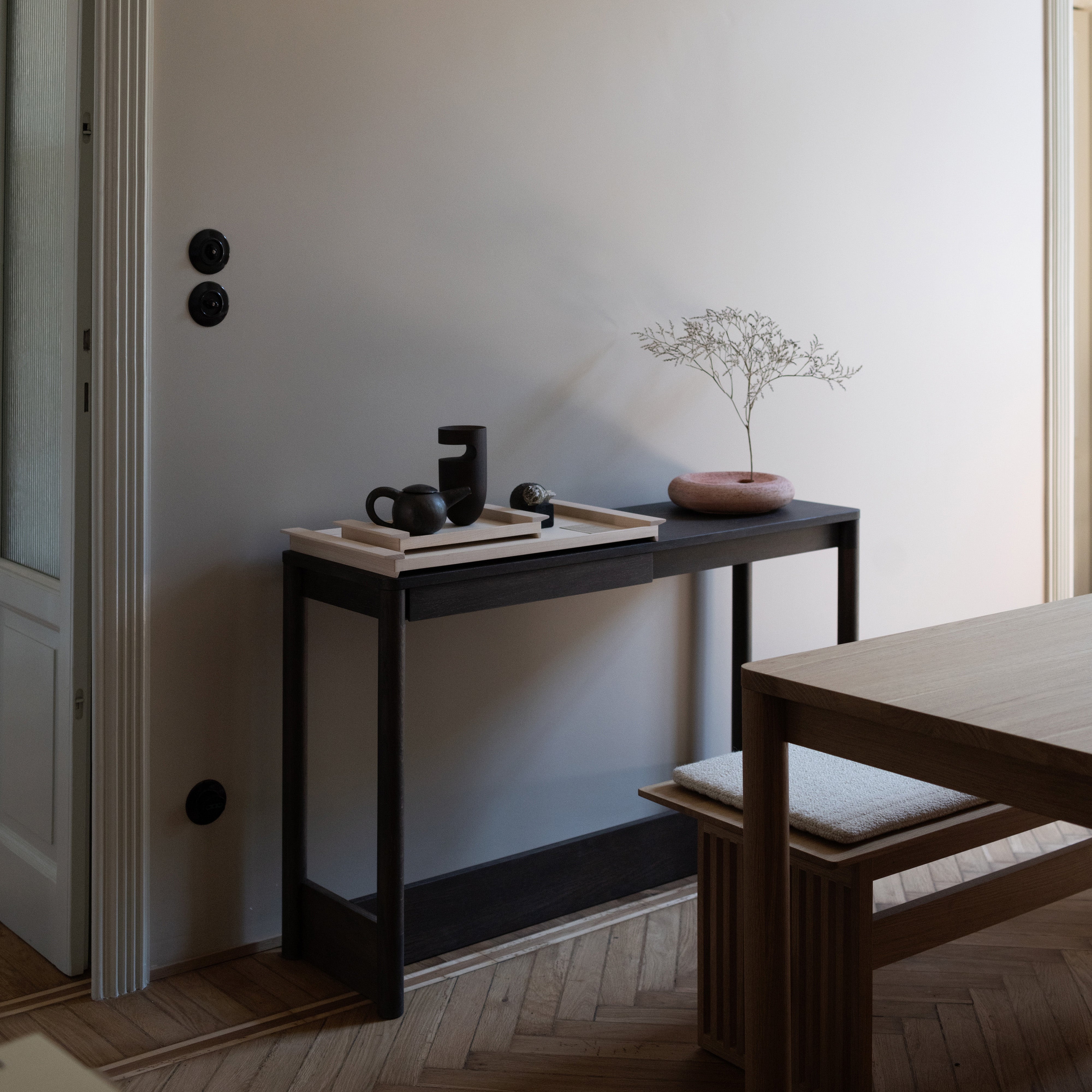 Koyabari means “roof beam“ in Japanese and Ariake’s console is likewise suggested by traditional joinery techniques, with a thick beam positioned close to the ground for maximum stability. Gabriel Tan’s design, rendered in varied oak or ash wood finishes, also exudes a satisfyingly punch of visual geometry.