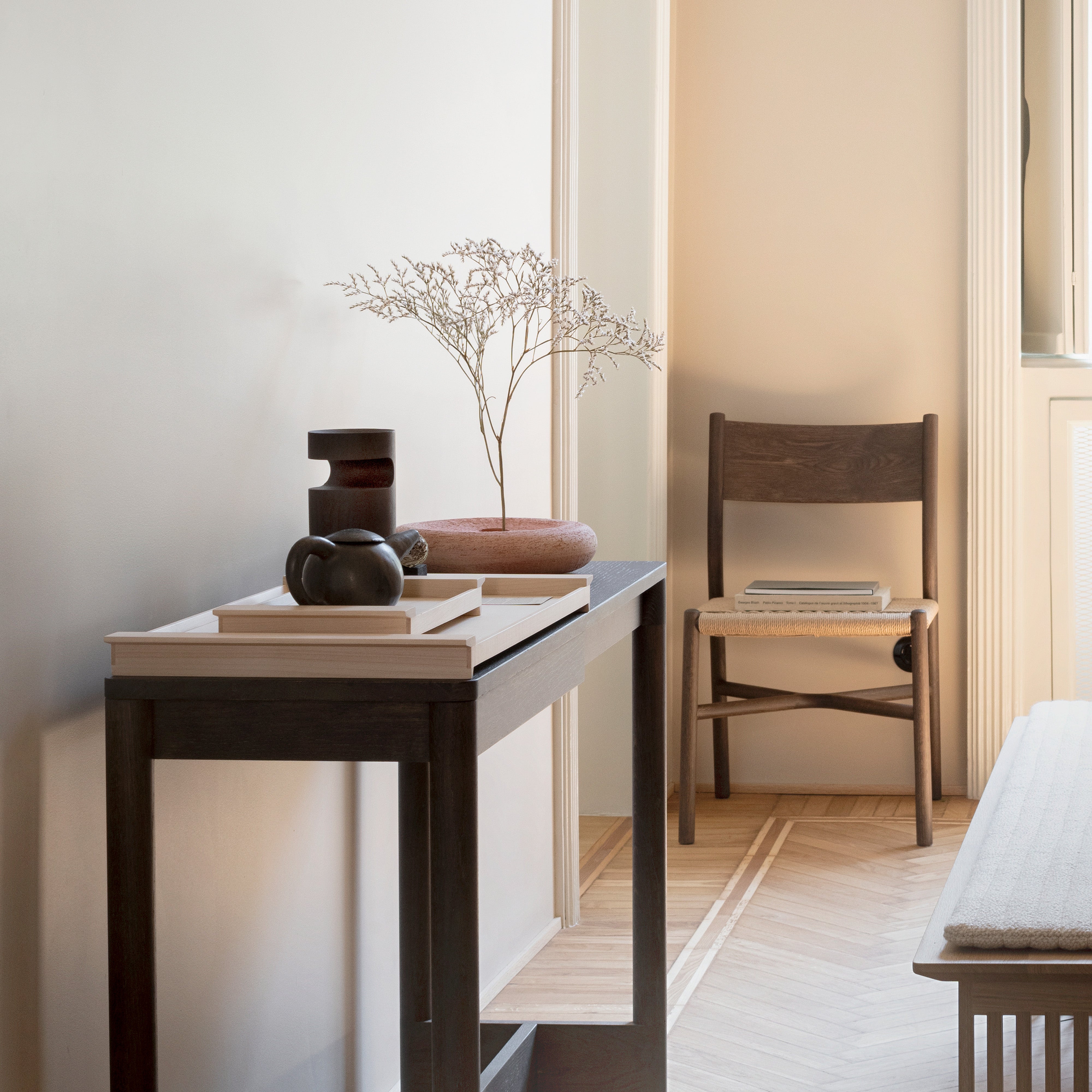 First conceived when a group of the designers gathered for an intensive design workshop that took place in the small town of Morodomi in southern Japan, the expanded collection employs tactile natural materials and rich finishes. Superbly crafted furnishings are fashioned in oak, ash, hinoki and cedar woods; buttery leather; paper cord and fine upholstery fabrics; as well as unique Japanese-inflected finishes. Each piece is crafted in Morodomi, from Mowat’s Aiizome storage cabinet painted with sumi ink, red dye and two shades of Japanese indigo, to Ashizawa’s evocative plumply cushioned Raft platform sofa, to Anderssen & Voll’s sculpted-wood Blest side chair with its curved back reminiscent of a sail.