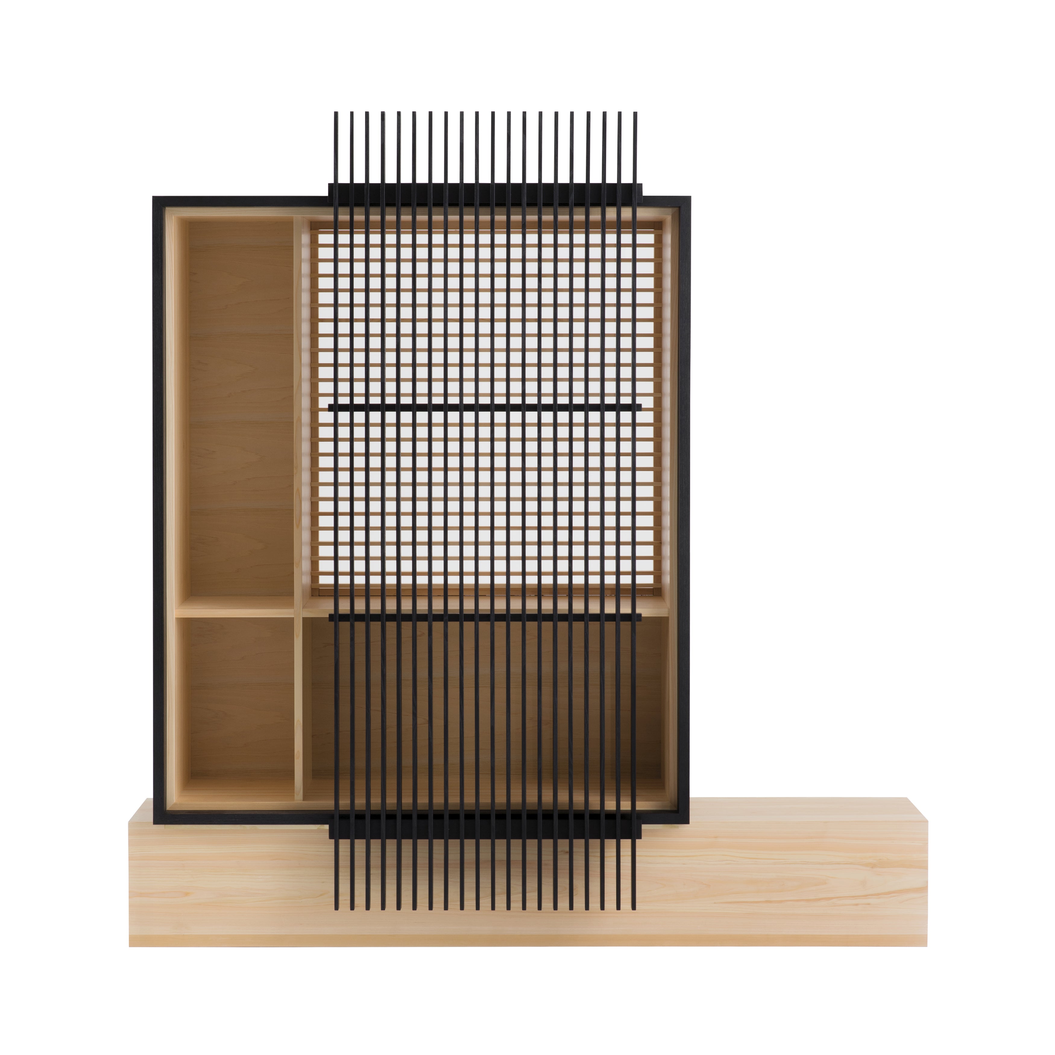 Created by Swedish designer Staffan Holm for the Japanese brand Ariake, this cabinet is inspired by the traditional Japanese kumiko technique, which involves assembling wooden pieces without nails to create intricate geometric patterns. These cabinets feature semi-transparent kumiko screens, which can be both ornamental and functional as privacy screens. The delicate lattice work allows light to pass through, creating a warm and inviting atmosphere, almost like a lamp when lit from within.