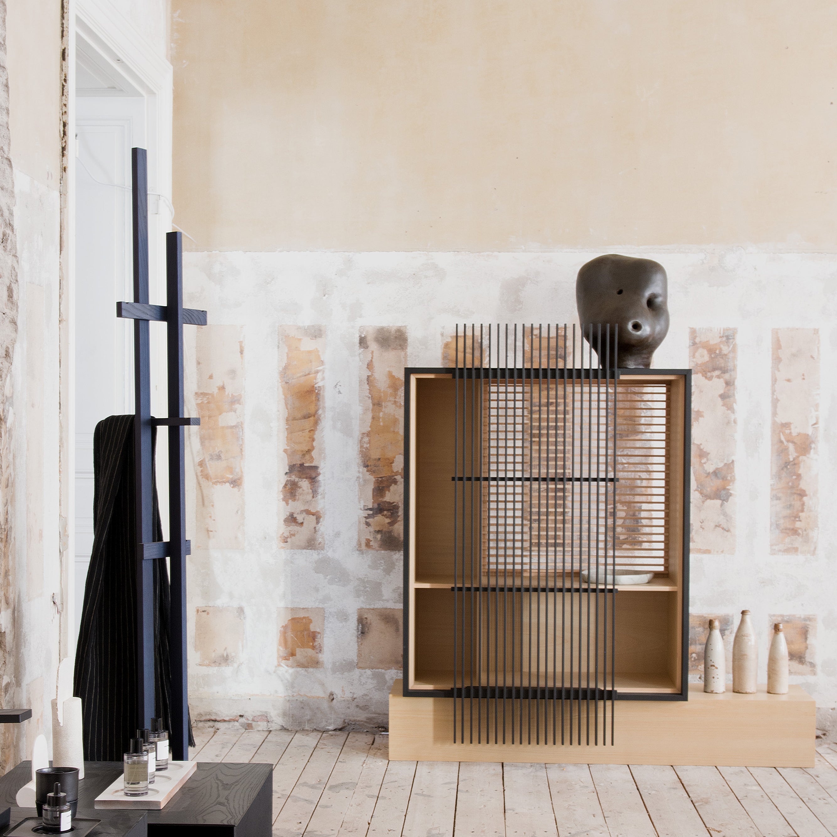 First conceived when a group of the designers gathered for an intensive design workshop that took place in the small town of Morodomi in southern Japan, the expanded collection employs tactile natural materials and rich finishes. Superbly crafted furnishings are fashioned in oak, ash, hinoki and cedar woods; buttery leather; paper cord and fine upholstery fabrics; as well as unique Japanese-inflected finishes. Each piece is crafted in Morodomi, from Mowat’s Aiizome storage cabinet painted with sumi ink, red dye and two shades of Japanese indigo, to Ashizawa’s evocative plumply cushioned Raft platform sofa, to Anderssen & Voll’s sculpted-wood Blest side chair with its curved back reminiscent of a sail.