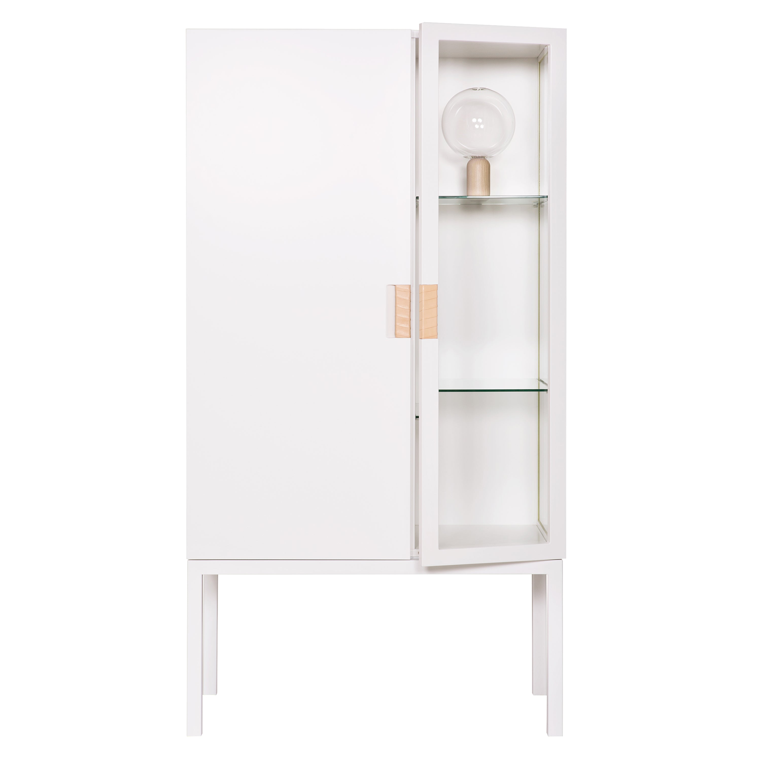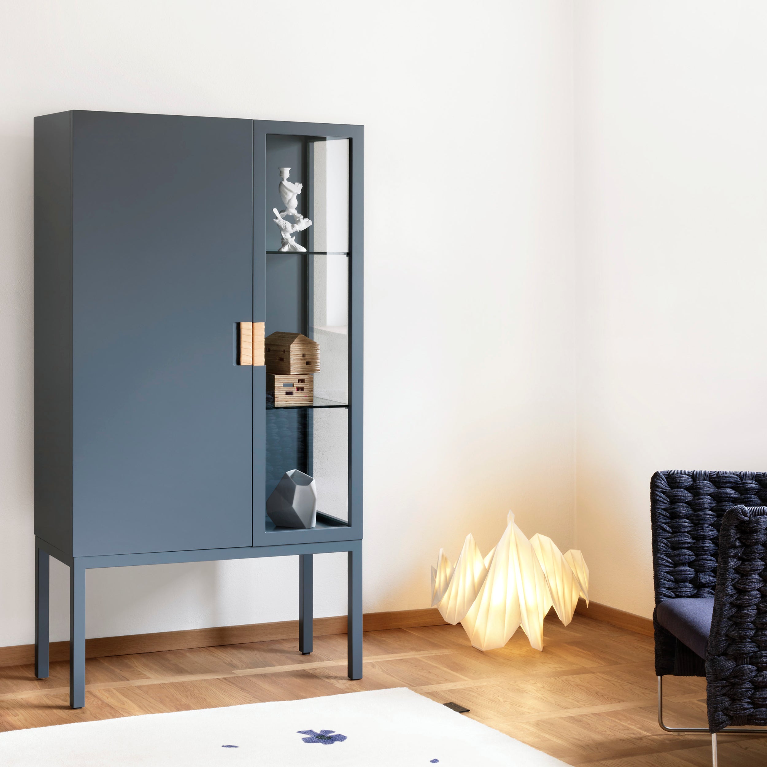 Stockholm-based Asplund’s Semi Cabinet variation of Frame features an asymmetric storage and display configuration, fashioned in lacquered MDF with a matching metal stand in a range of appealing hues. On the left, a solid door conceals 2 metal shelves while the right door’s glass pane reveals glass shelves inside. Anya Sebton and Eva Lilja Löwenhielm complete their design with the series' signature leather handles and adjustable feet and hinges in stainless steel.