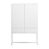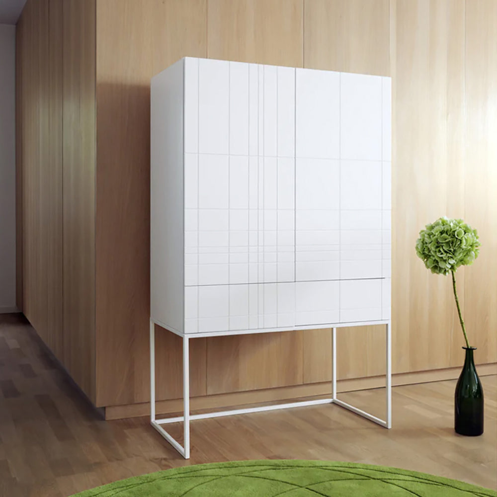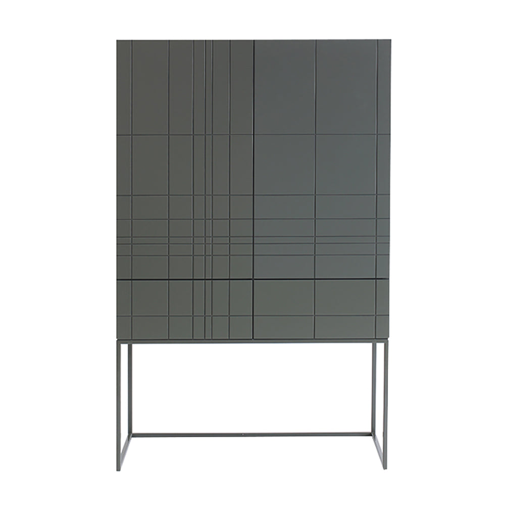 Swedish maker Asplund adds a vertically oriented cabinet to its striking Kilt Light series by Claesson Koivisto Rune. Concealing generous storage behind 2 doors, 90 also adds 2 side-by-side drawers at the bottom. Expressly made in Sweden, the lacquered MDF unit is available in a range of Nordic hues with a geometric pattern that riffs on a classic tartan. The powder-coated metal base is available either to match or in a contrasting color.
