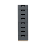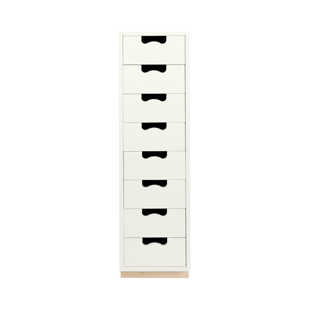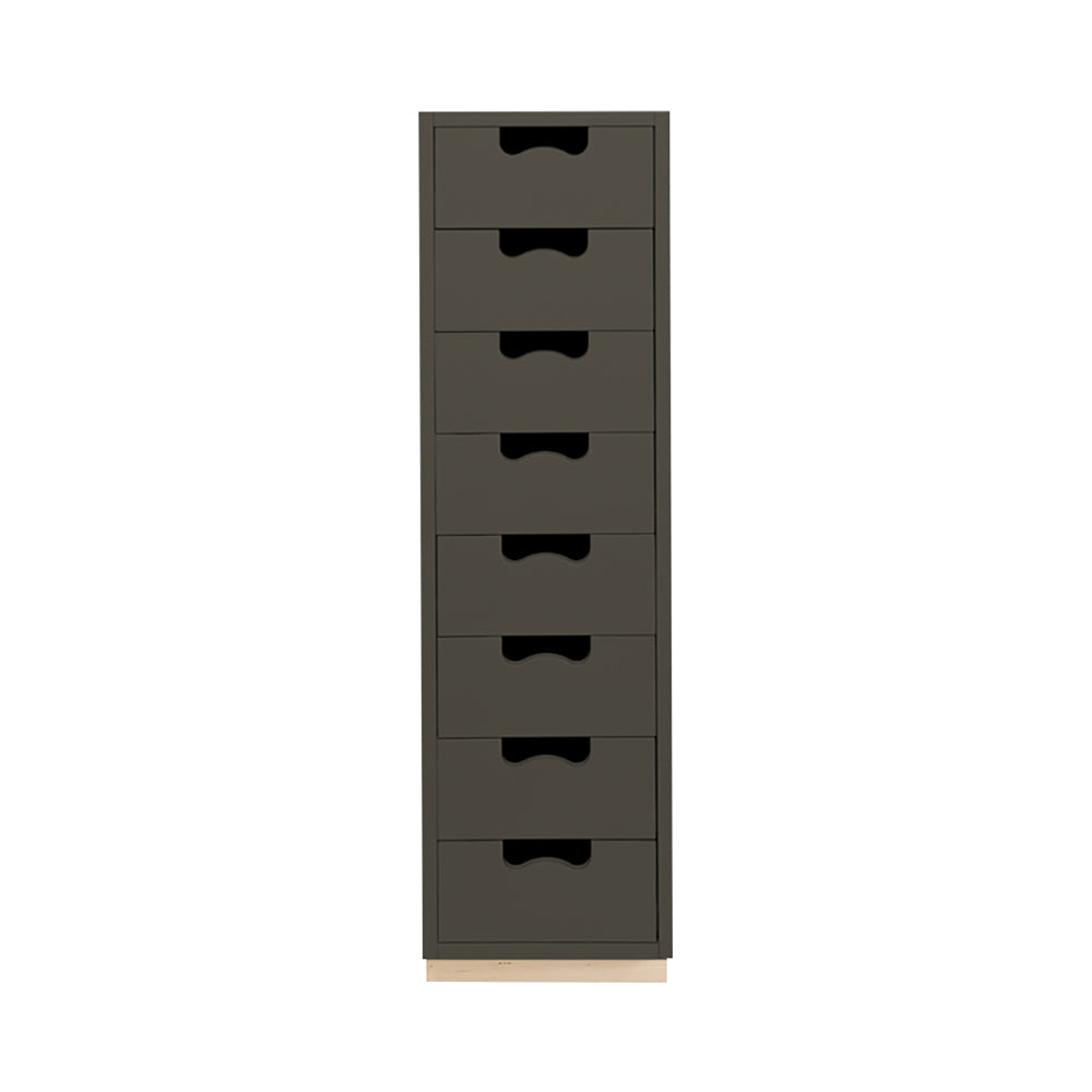 A tall unit with deep storage drawers, Snow J follows the template of Asplund's storage collection considered as a 20th century Swedish classic. Thomas Sandell and Jonas Bohlin's concept is strikingly simple, signified by the cutout handles used as both a decorative element and to give a comfortable grip. The lacquered MDF cabinet with soft-closing drawers comes in a select range of Nordic-influenced tones set on a contrasting natural birch base. Handcrafted and made to order in the small town of Tibro in southern Sweden, with its long furniture-making tradition, and meant to last for generations; affixing unit to the wall is recommended.