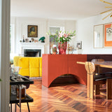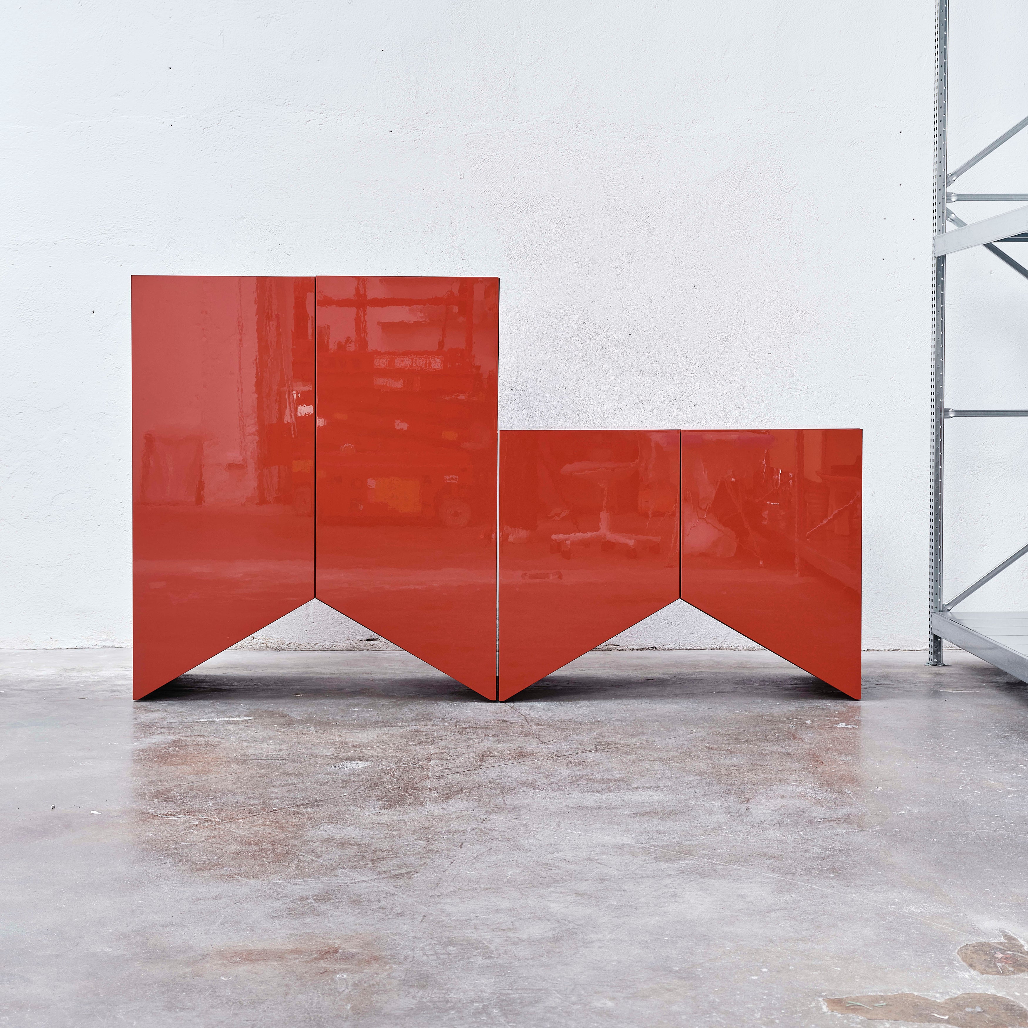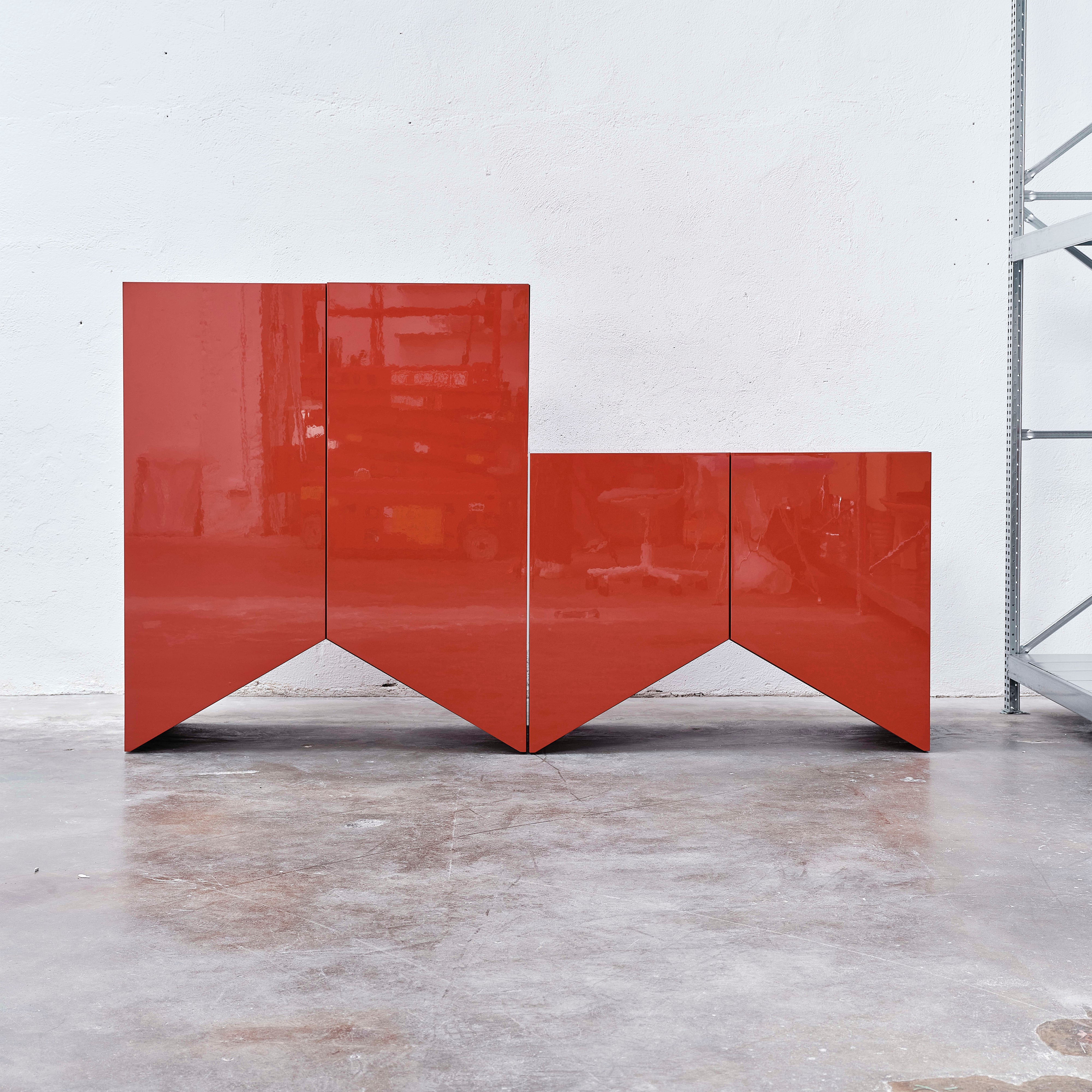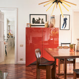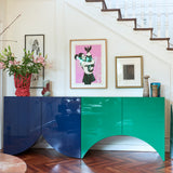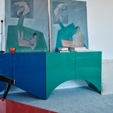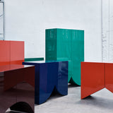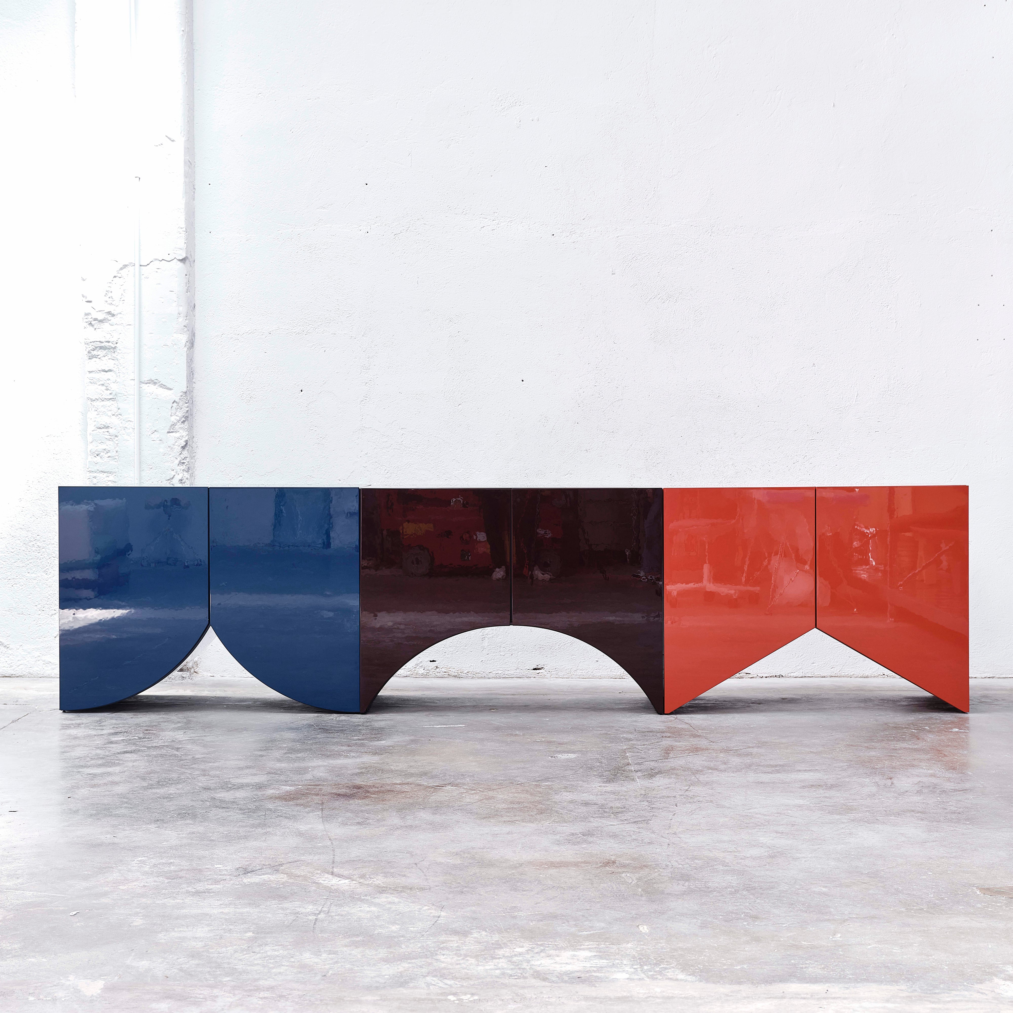 Designed by the Belgian duo Muller Van Severen, this collection of cabinets evolved from their series of 'Wave' vases, incorporating the vase silhouettes into handmade cabinets with distinctive cutout bases. The cabinets stand out with their refined colors and glossy finishes, adding a sculptural beauty to any space. Each piece in the Bridges collection can function alone or combine to create a vibrant and spacious architectural element full of personality.