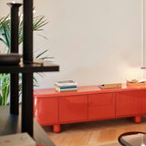 The (small) Explorer Cabinet features a playful, fluid shape inspired by whimsical forms. Its glossy lacquered exterior, combined with a matte interior, creates a dynamic contrast, while the sturdy wooden legs elevate its presence. Crafted from durable MDF and solid alder, it offers both open and closed storage options. This compact piece is easy to move and adapt, perfect for adding a pop of color and creativity to any room. Its detachable design ensures it fits seamlessly into various environments.