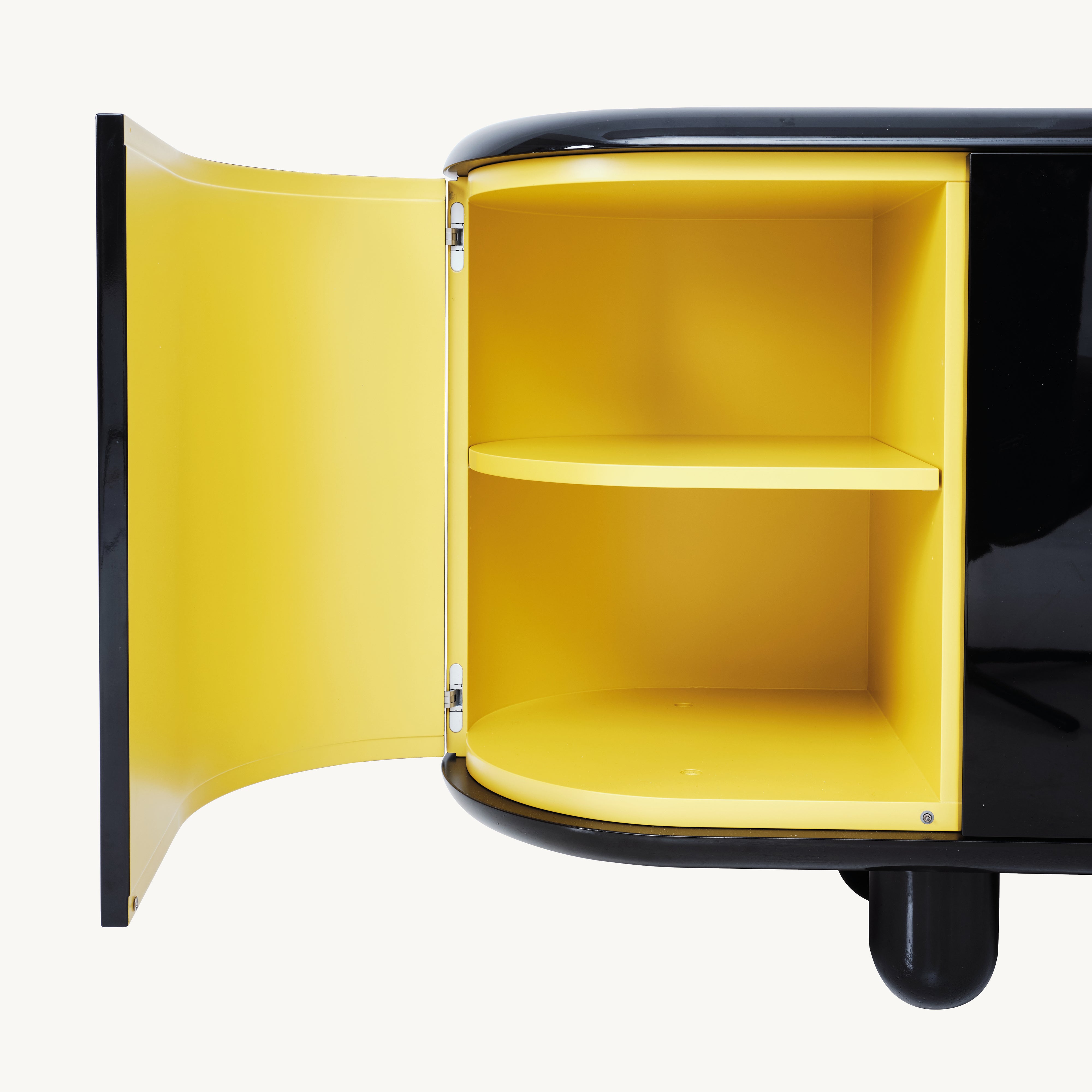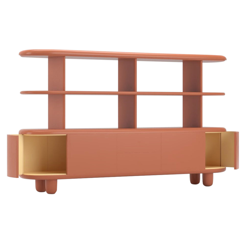 Playful wunderkind Jaime Halon adds a striking tall storage cabinet to his Explorer series, with open shelves atop a base unit that features both cabinets and drawers. A glossy lacquered finish heightens the curves of his organic design and contrasting matte colors on the interior surfaces add to the visual delight that comes straight from Hayon’s own cosmos.