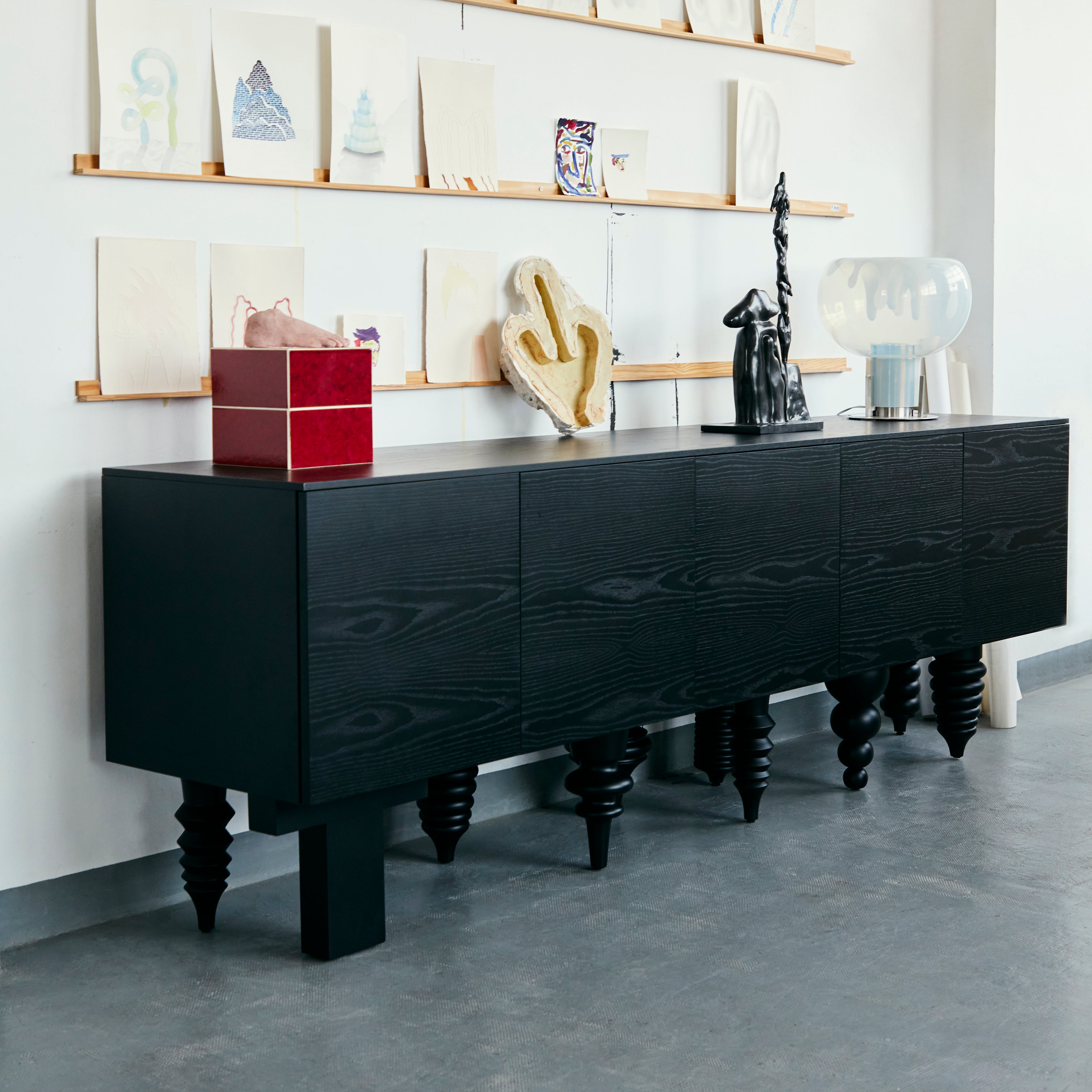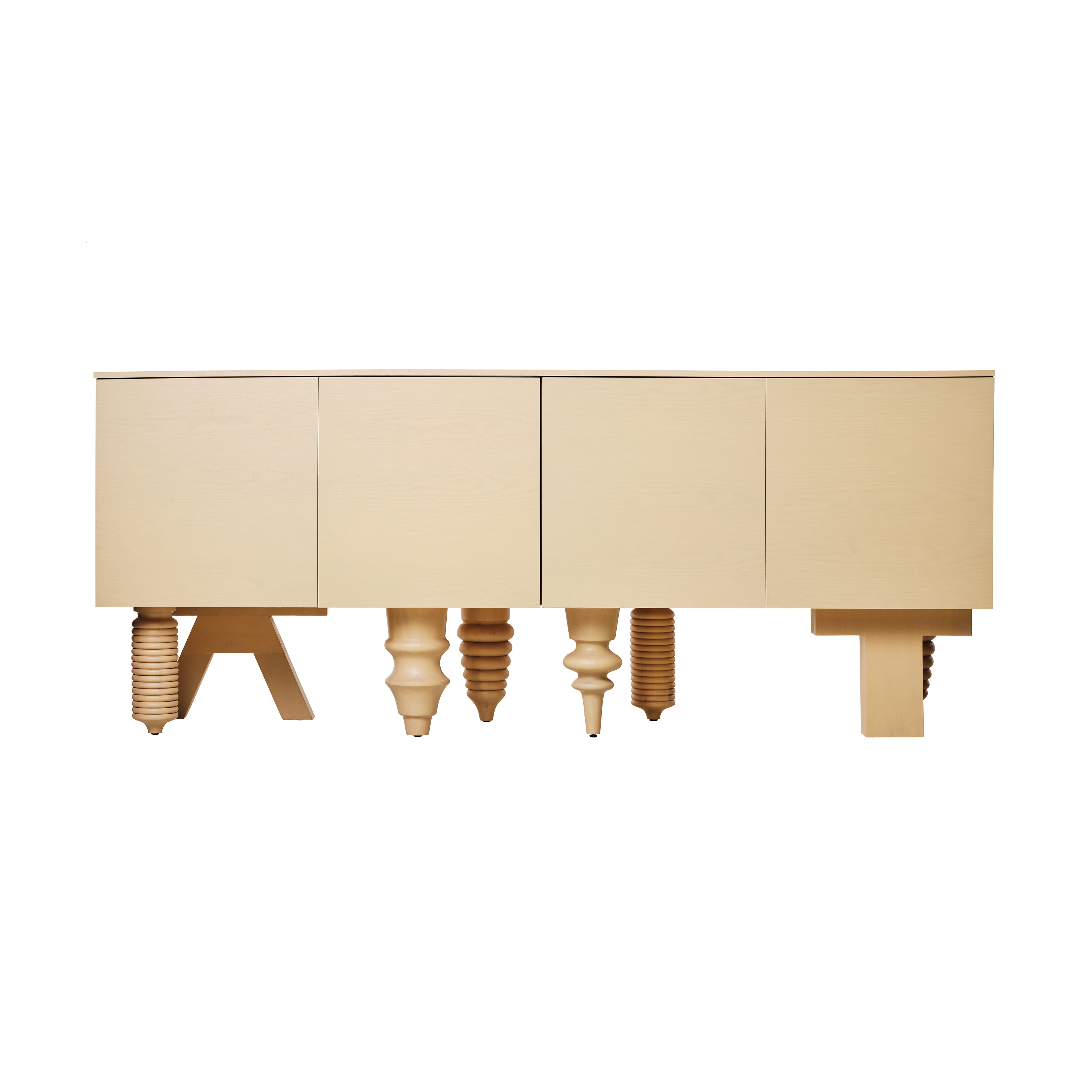 Jaime Hayon gets a leg up—actually up to a dozen of them—with his streamlined low storage cabinet, warmly veneered in a varnished Ash finish with matte veneer on the interior. Multileg lives up to its name, resting on 4 to 12 individual supports depending on the unit’s size, each bearing a different shape, in solid turned alder wood stained in a matching Ash color that also matches the cabinet’s cleanly handsome doors and drawer-fronts.