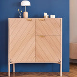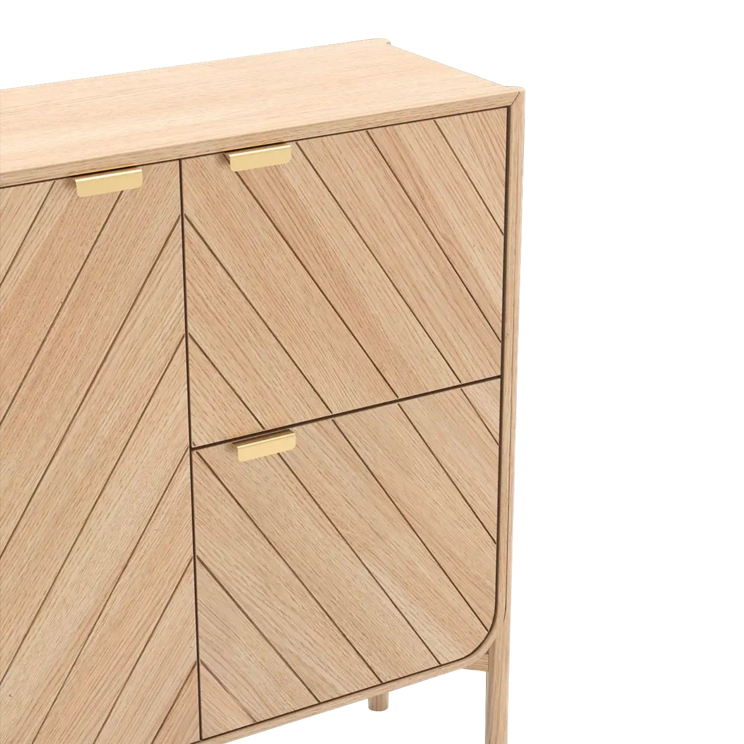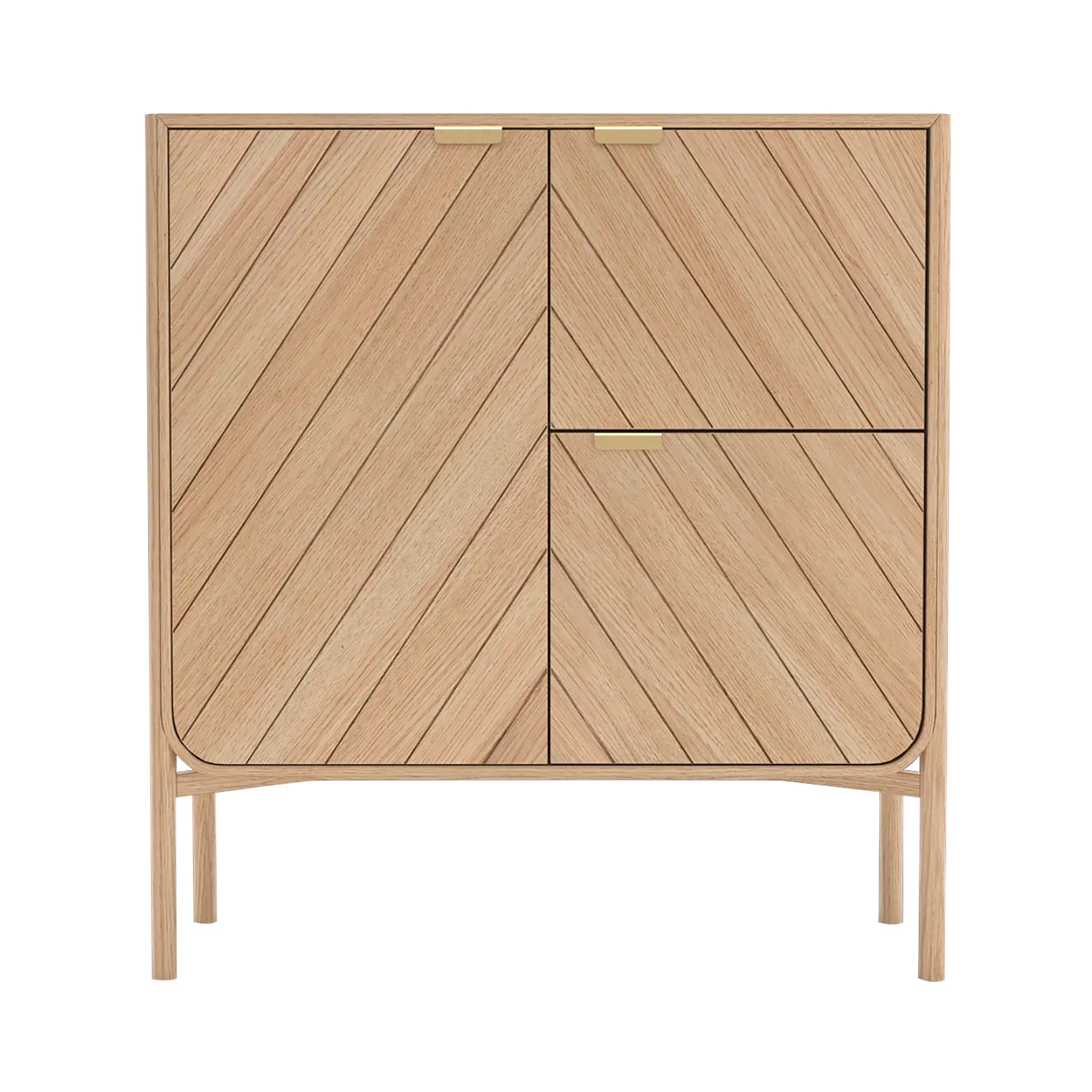 Marius Dresser is a multifunctional storage piece with a pair of doors and a flip-down drawer that reveal 6 shelves for clothes, books or tableware. From French design brand Hartô, Pierre-Franois Dubois gives it a nautical air with curved oak lines and a diagonal front motif resembling sails. In airy natural oak or with contrasting door fronts in light grey or petrol blue.