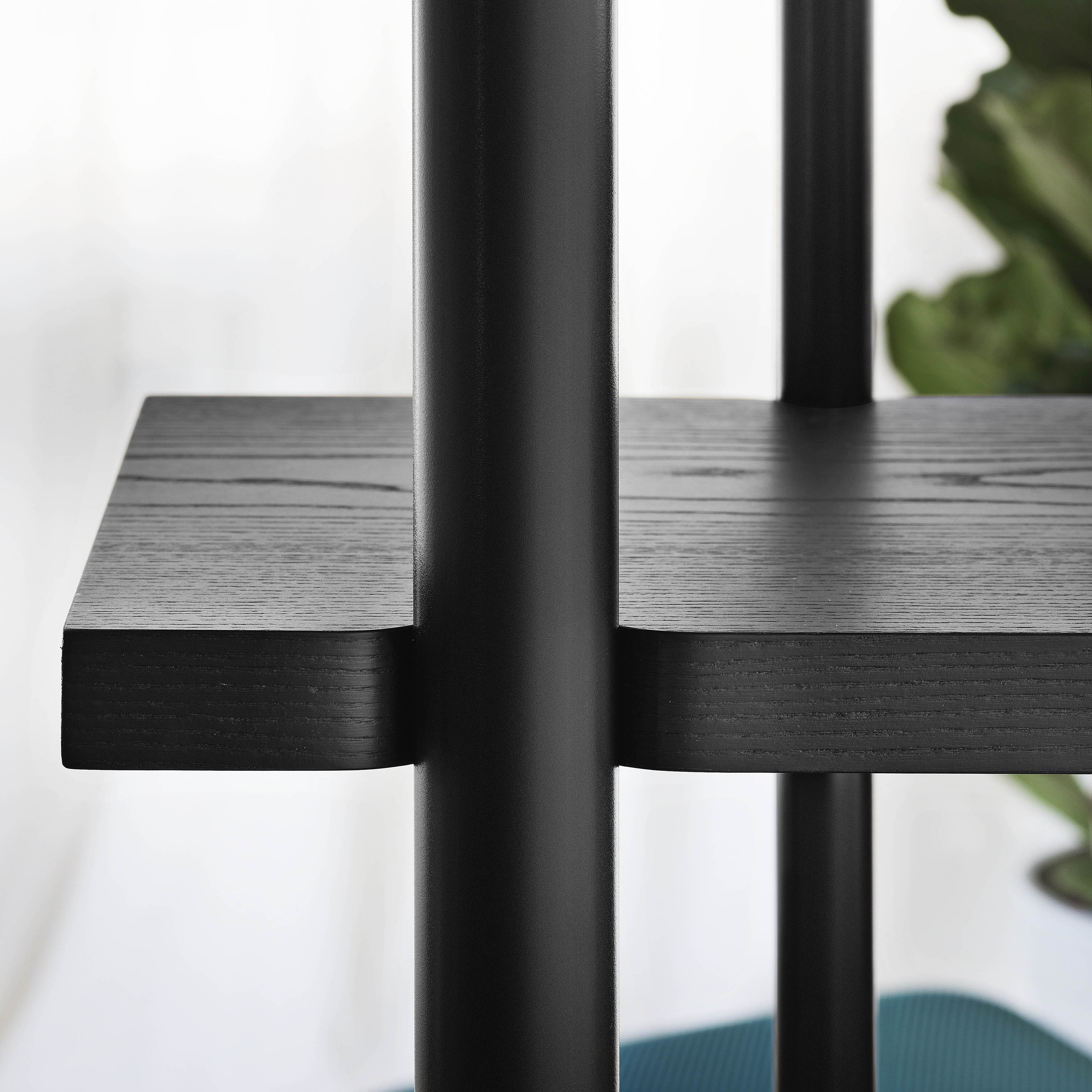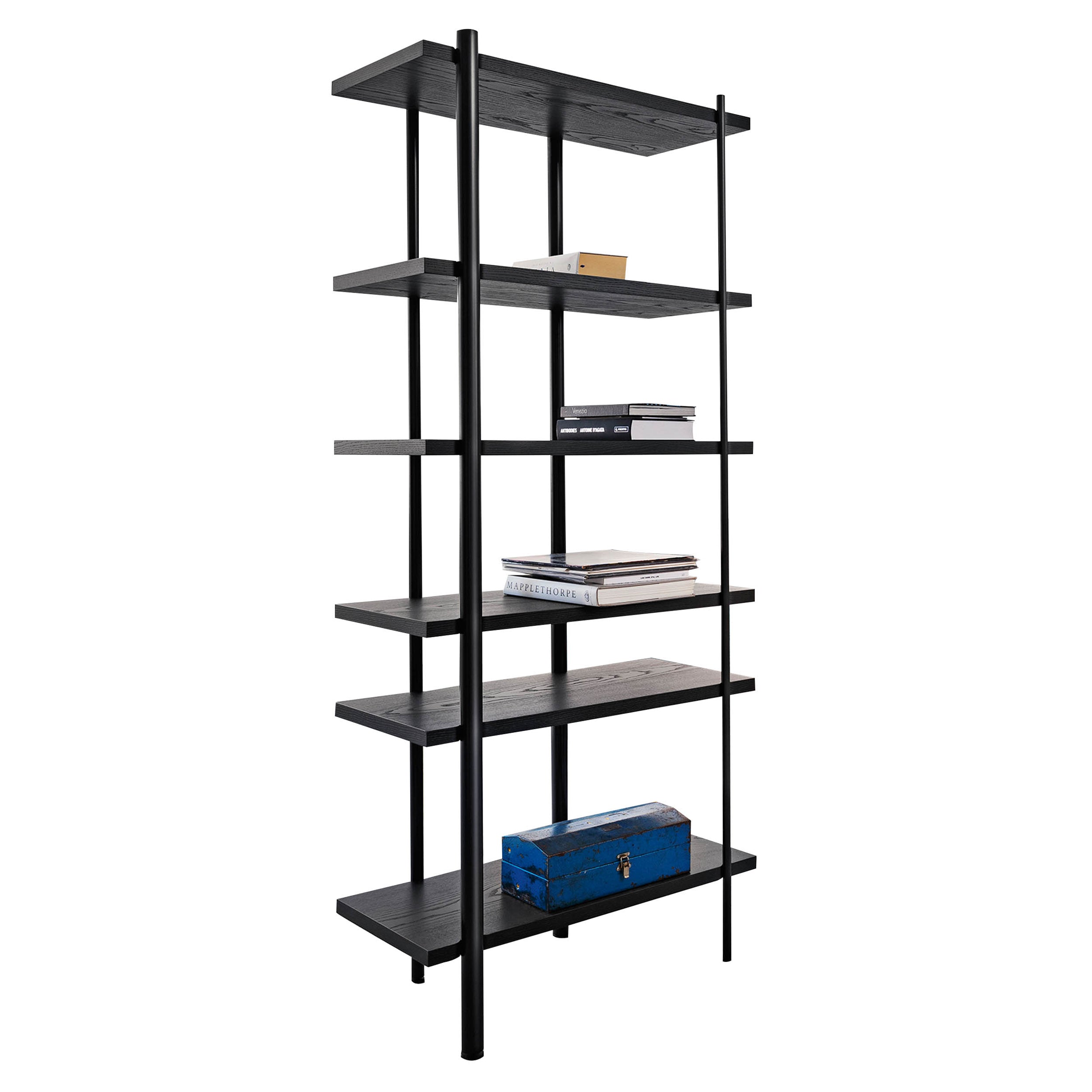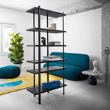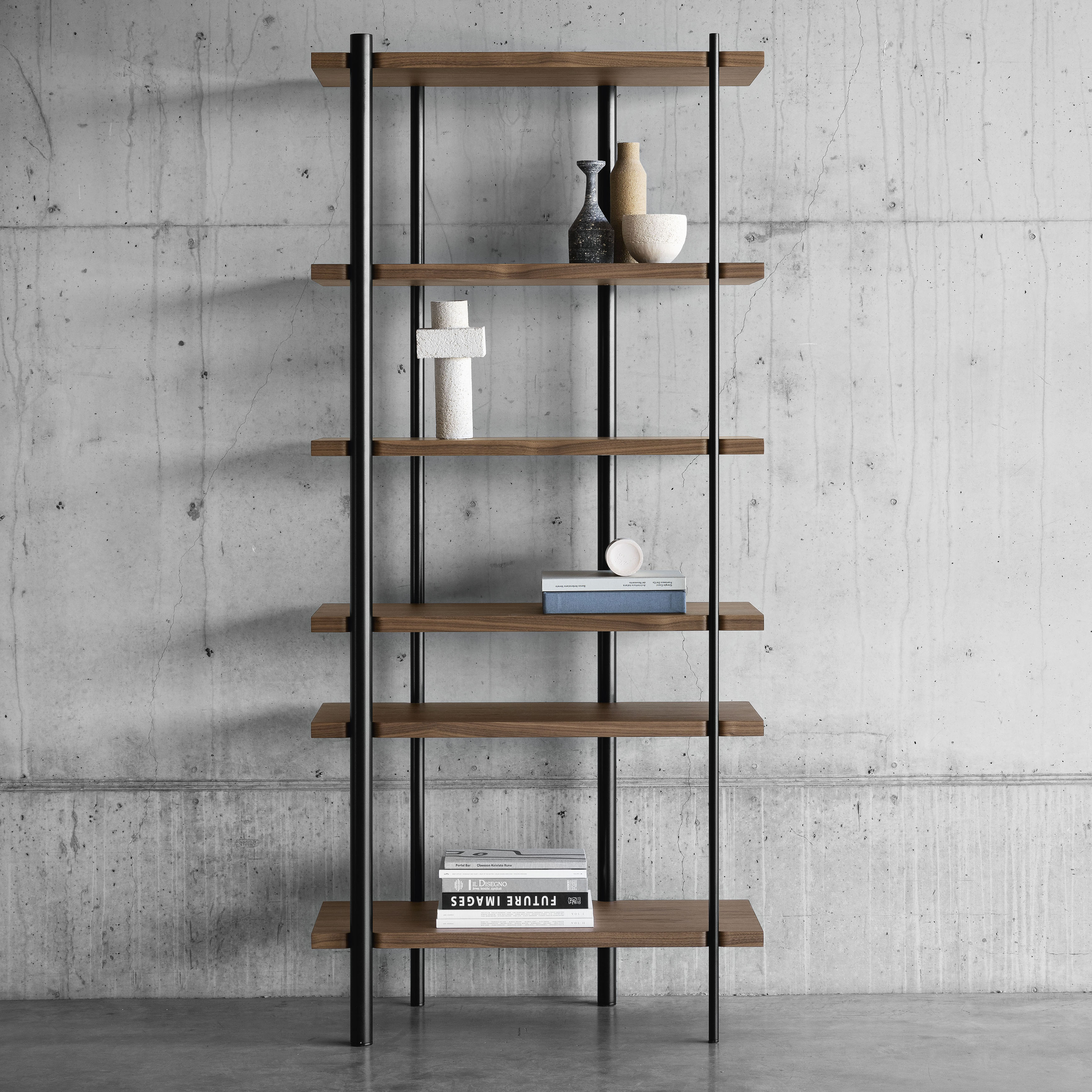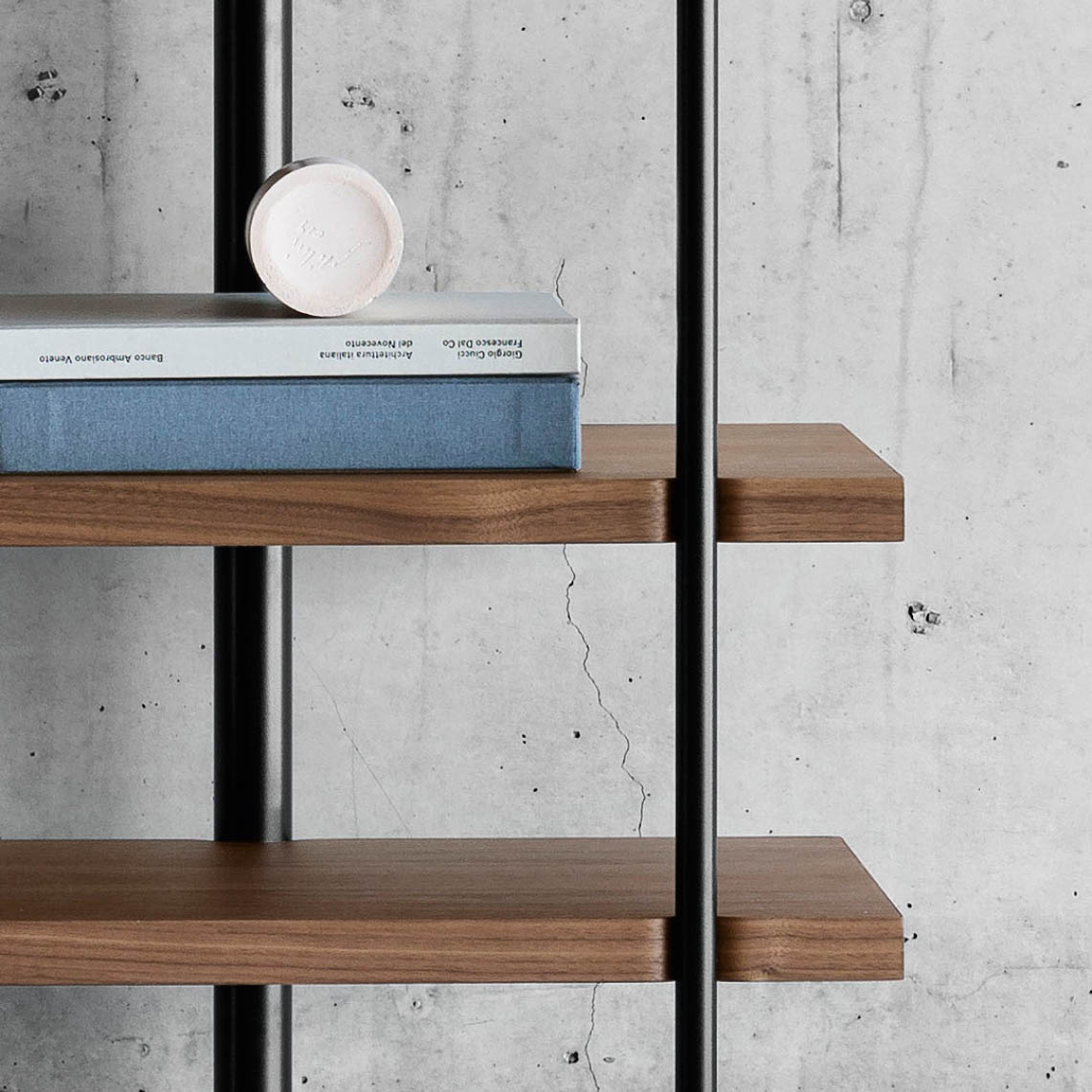 Either as a room divider or, more conventionally, set against a wall, Milonga brings a playful air to organizing a home library or a display of treasured objets. An asymmetrical arrangement of thick and thin tube uprights and varied sequencing of the shelves bring a pleasingly rhythmic appearance to the bookcase. Available in a wide range of custom lacquered colors, the sturdy metal structure also features wood shelves in a choice of timber varieties.