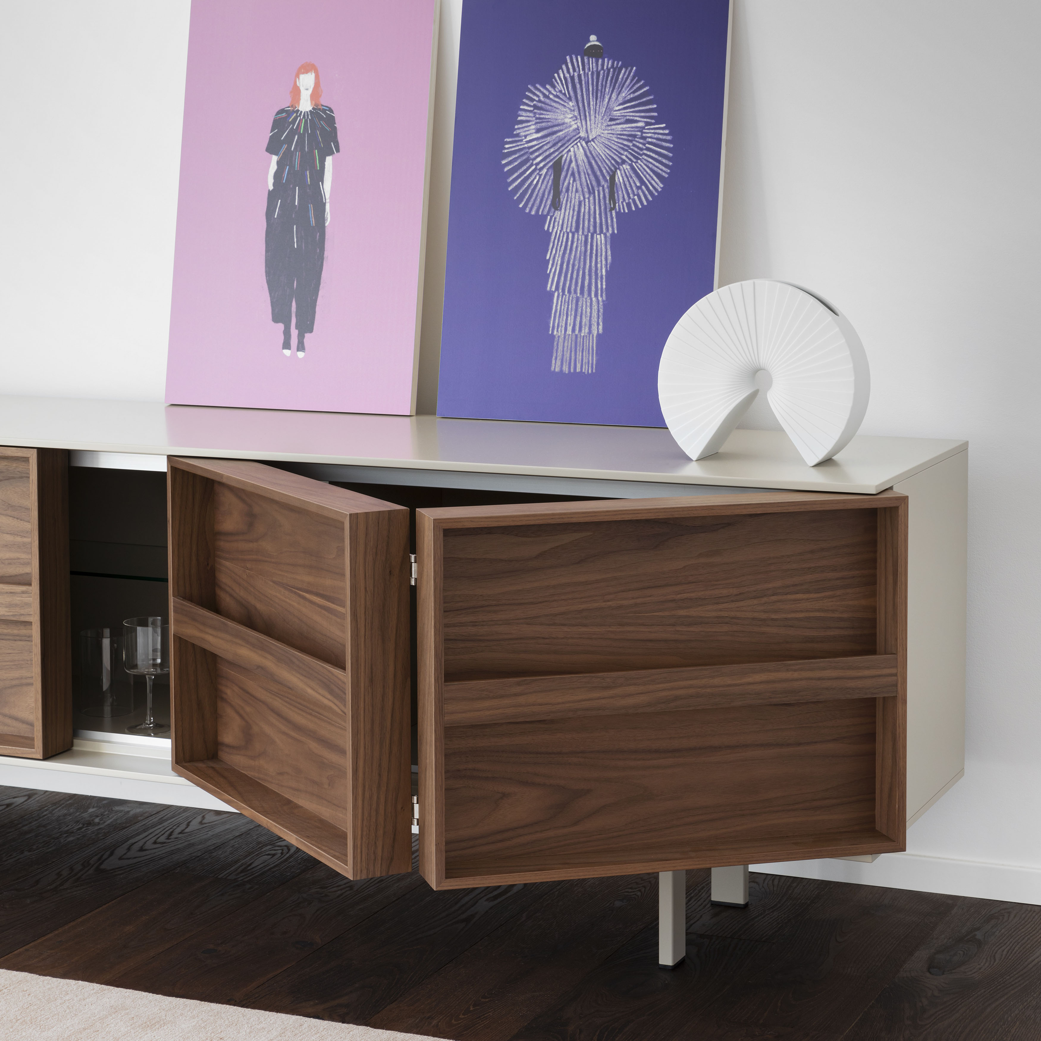 Bibliophiles and those who love them will delight in the organizational flair of Ramblas, a long, low sideboard with a library-style book and magazine rack cleverly integrated into its front. Encased in a slimline wood shell lacquered to match the metal base, the cabinet's hinged doors open on roomy interior storage. Imaginatively conceived by Gaia Giotti and Jonah Scarselli of Florence-based design E-ggs, there are numerous finish combinations with either contrasting walnut or oak doors.