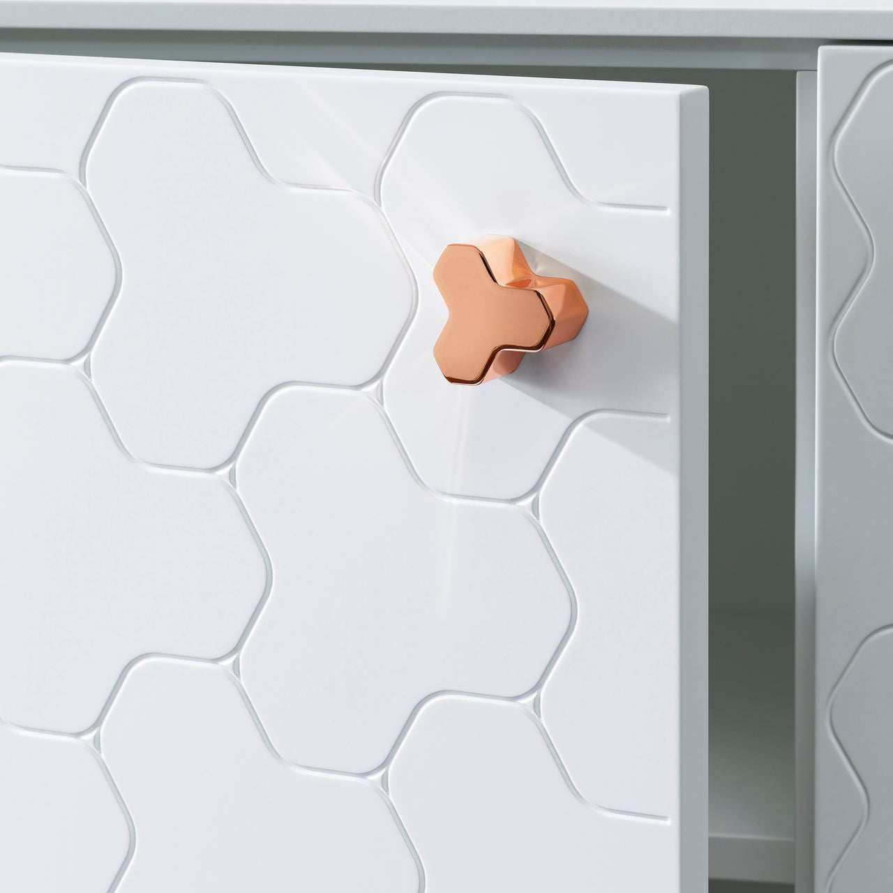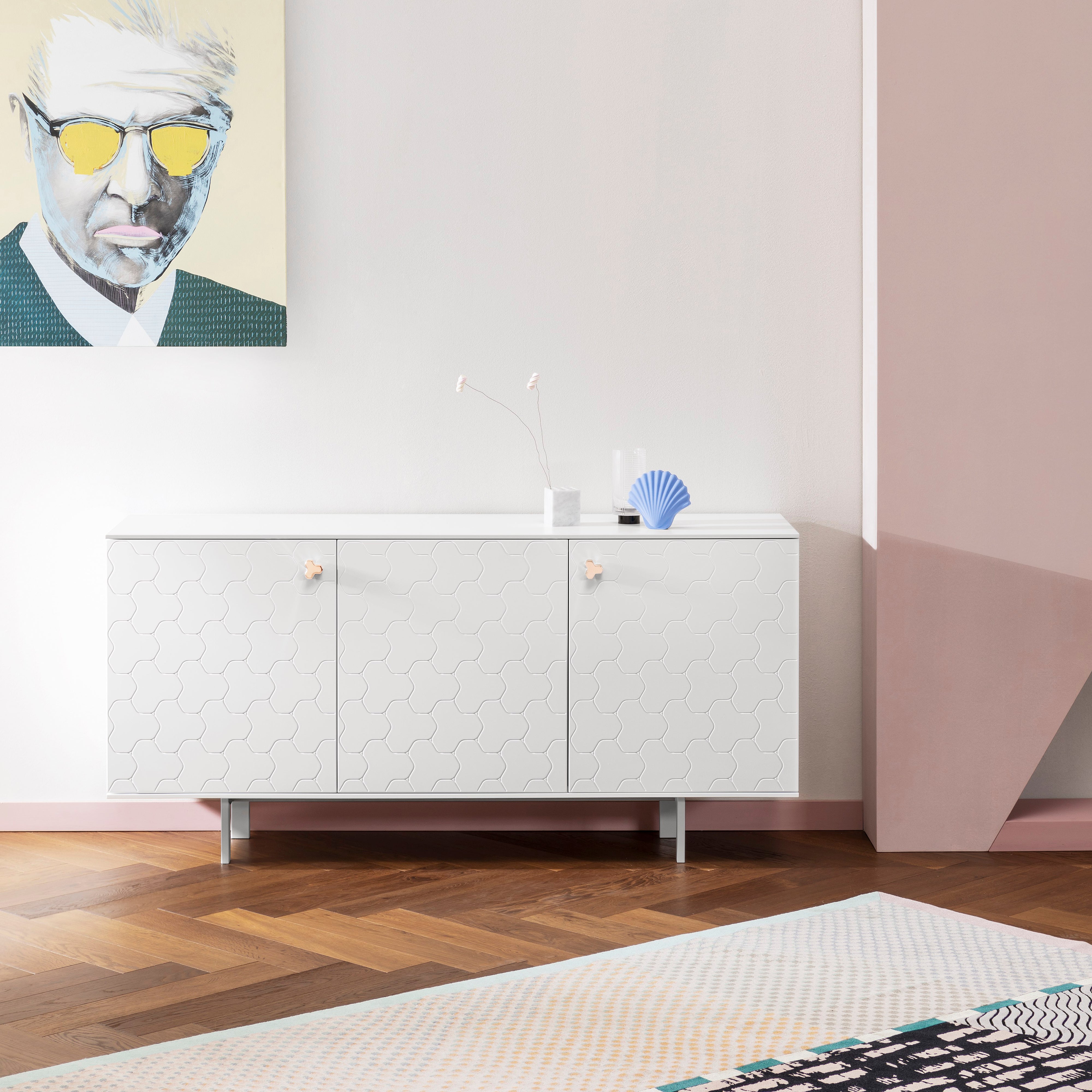 Refined and decorative, Soko underscores Itaian maker Miniforms' flair for unexpected furnishings, here in a tall version of the storage cabinet. A contemporary triangulating allover pattern is engraved on the sides and front doors of the wood structure. In a range of lacquer colors, the piece gets a punctuation point with gleaming copper door handles in the same motif. Customized versions include the addition of an inset vase or a combination vase and "green"-technology air purifier.