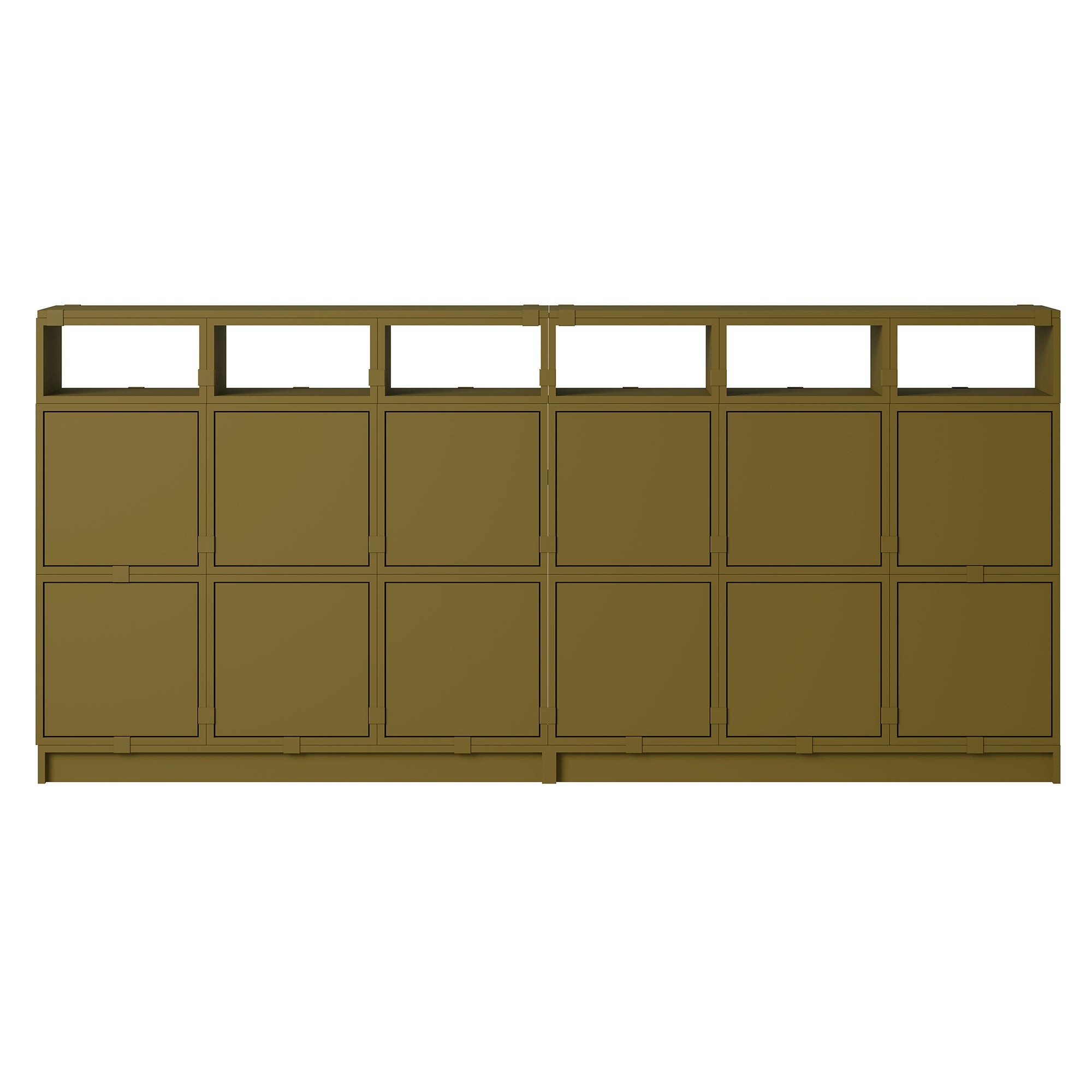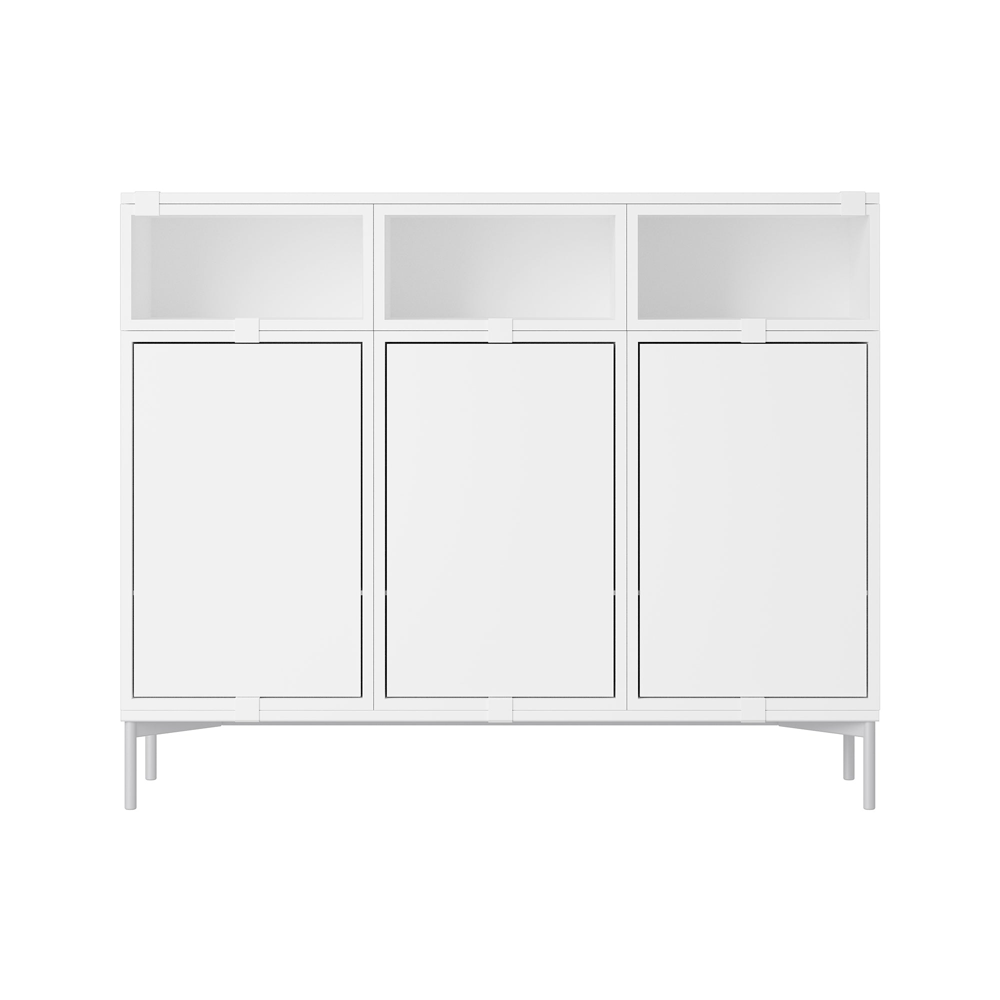 Designed for adaptability, the Muuto Stacked Storage System Sideboards' components are crafted from PU-lacquered MDF or oak-veneer. Available in oak, white, and brown green finishes, and offered in multiple configurations, this sideboard complements a variety of interior styles.