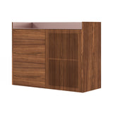 In the same sleek fashion, Stockholm’s higher cupboard version features a flush facade with double doors—a solid and a slatted one—camouflaging a roomy interior with a height-adjustable shelf and cable management for electronics. Designer Mario Ruiz’s series for Punt is realized in rich oak or walnut veneer with the signature contrast of a molded aluminum top to impart a metallic gleam while the cabinet’s plinth-style metal base has a black or bronze epoxy powder-coat finish.
