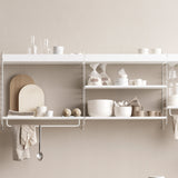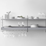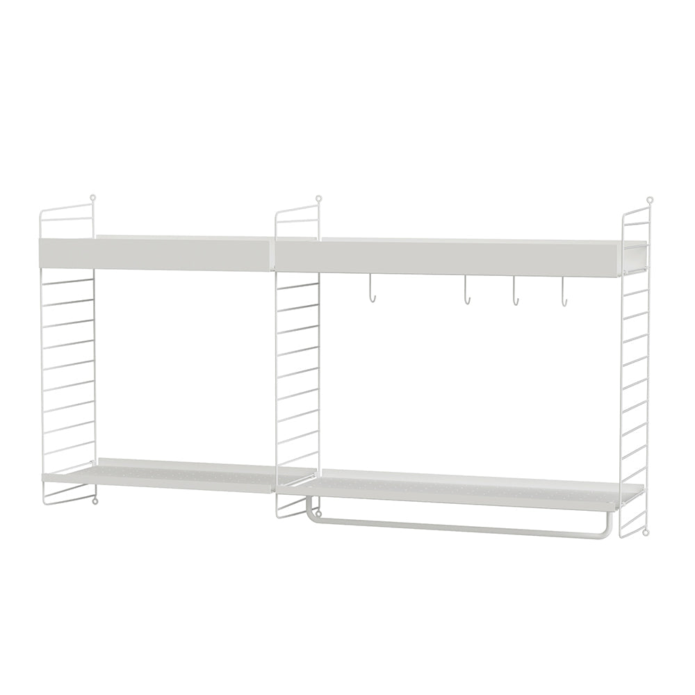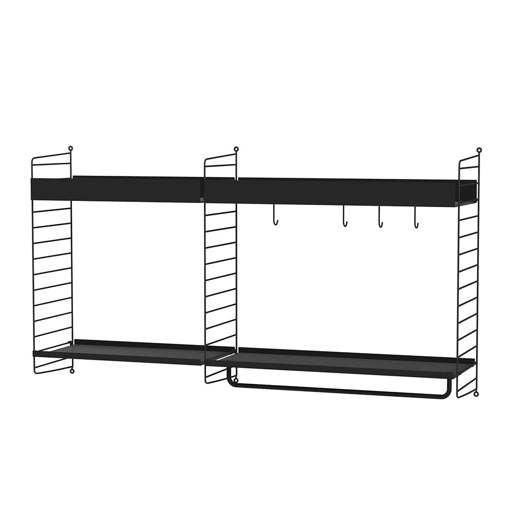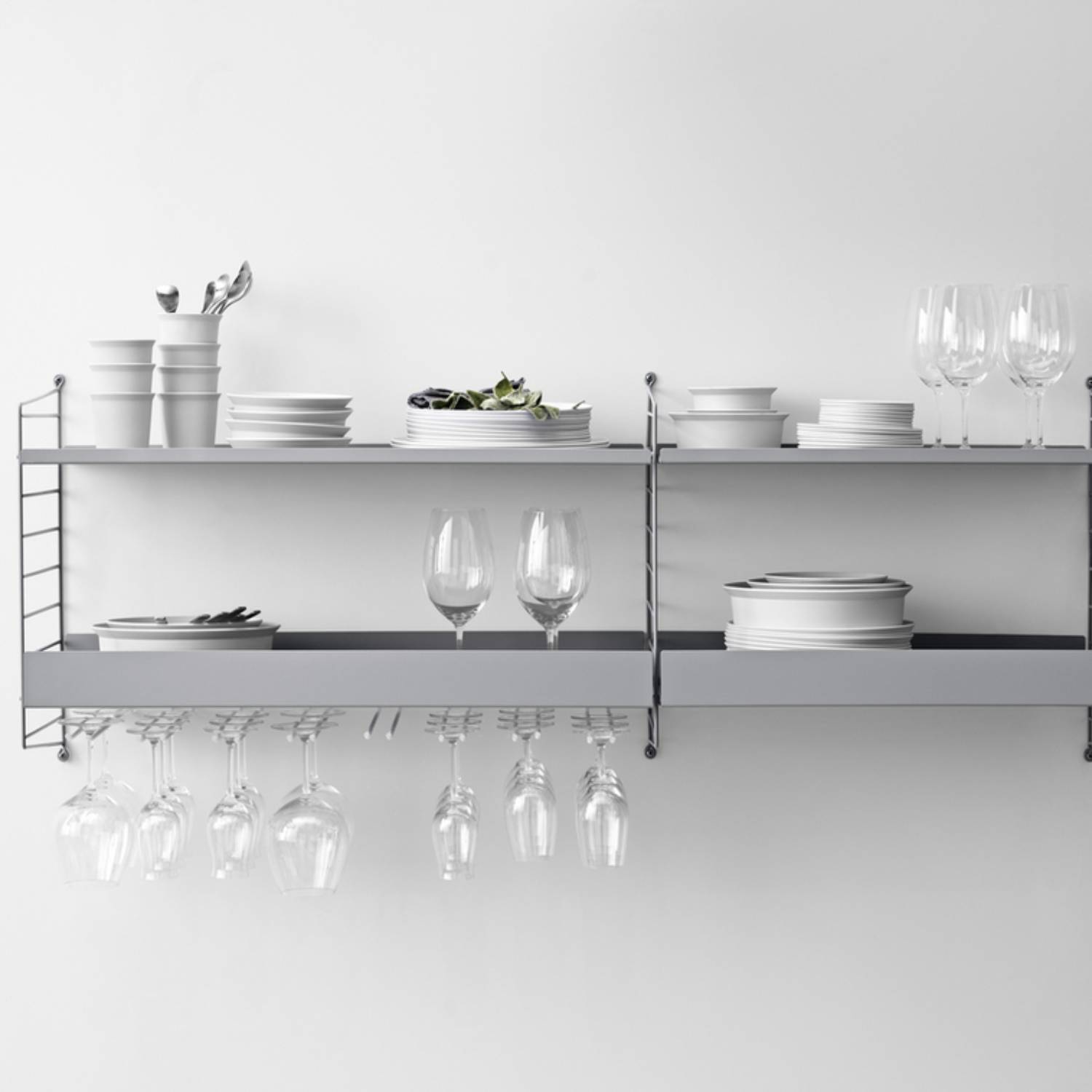 String makes inspired use of precious kitchen space with this complete wall-hung workhorse. The preconfigured double-width unit includes shelves for holding cookware or pantry items as well as hooks and rods for hanging pots and utensils. Customize it with add-ons like bin organizers, a wall grid and bottle tray (also at A+R.) In fine textured metal in a choice of powder-coat colors with the familiar coated-wire framework, String shelving also expands as needs dictate, a feature Nils Strinning foresaw when he debuted his timeless system back in 1949.