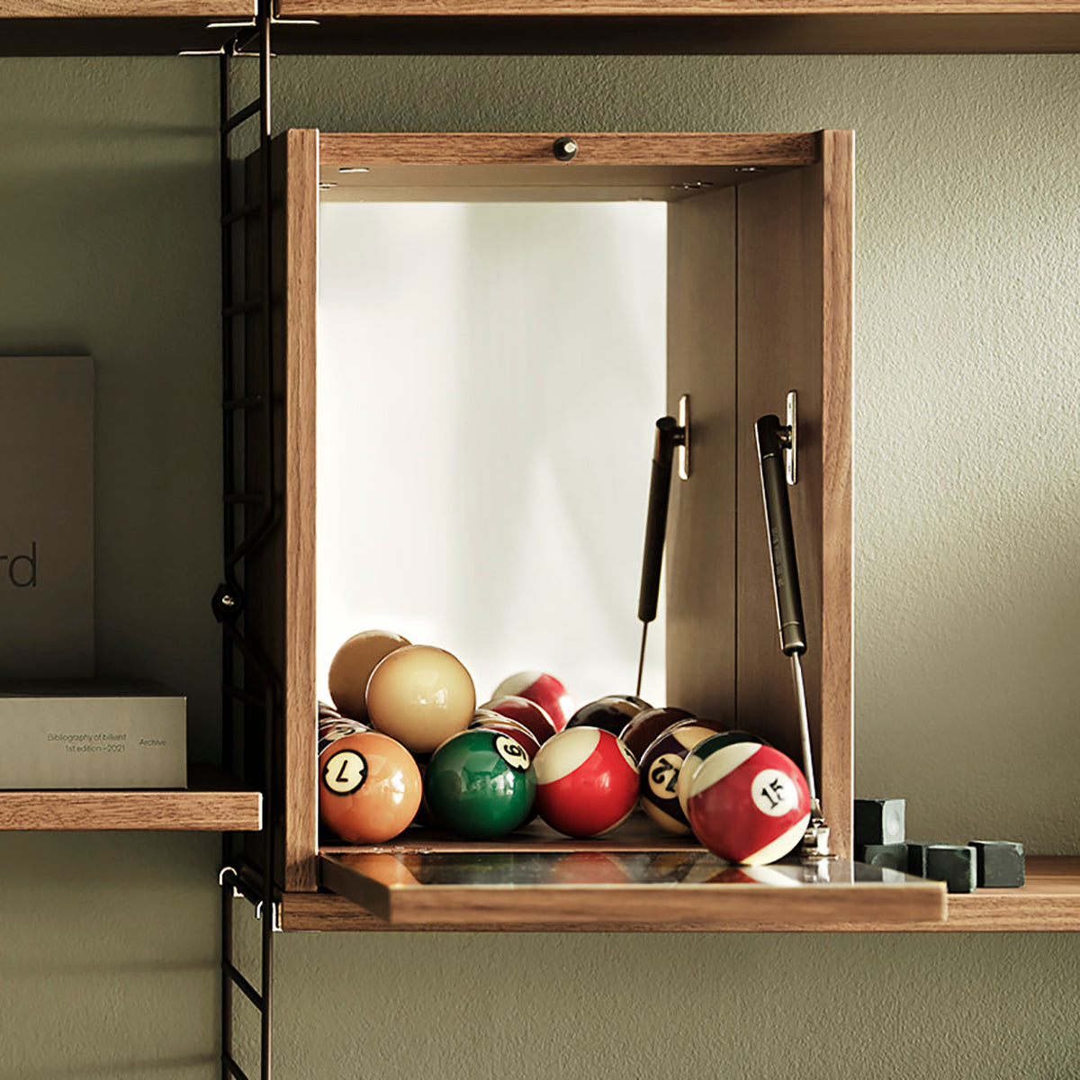Tiny is an elegant little holdall with a drop-down door, sized to fit with all 30 cm deep wire panels from String System. The unit needs to be placed on top of either a wooden shelf or one of the larger cabinets and attached to one of the side's wire panel. Made of lacquered walnut veneer, the inside of the cabinet's lid is surfaced in brushed stainless steel—handy for holding a drink if it's used as a bar compartment. And the back of the cabinet has a reflective mirror for easy retrieval of items.