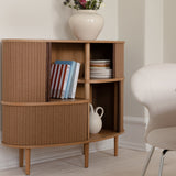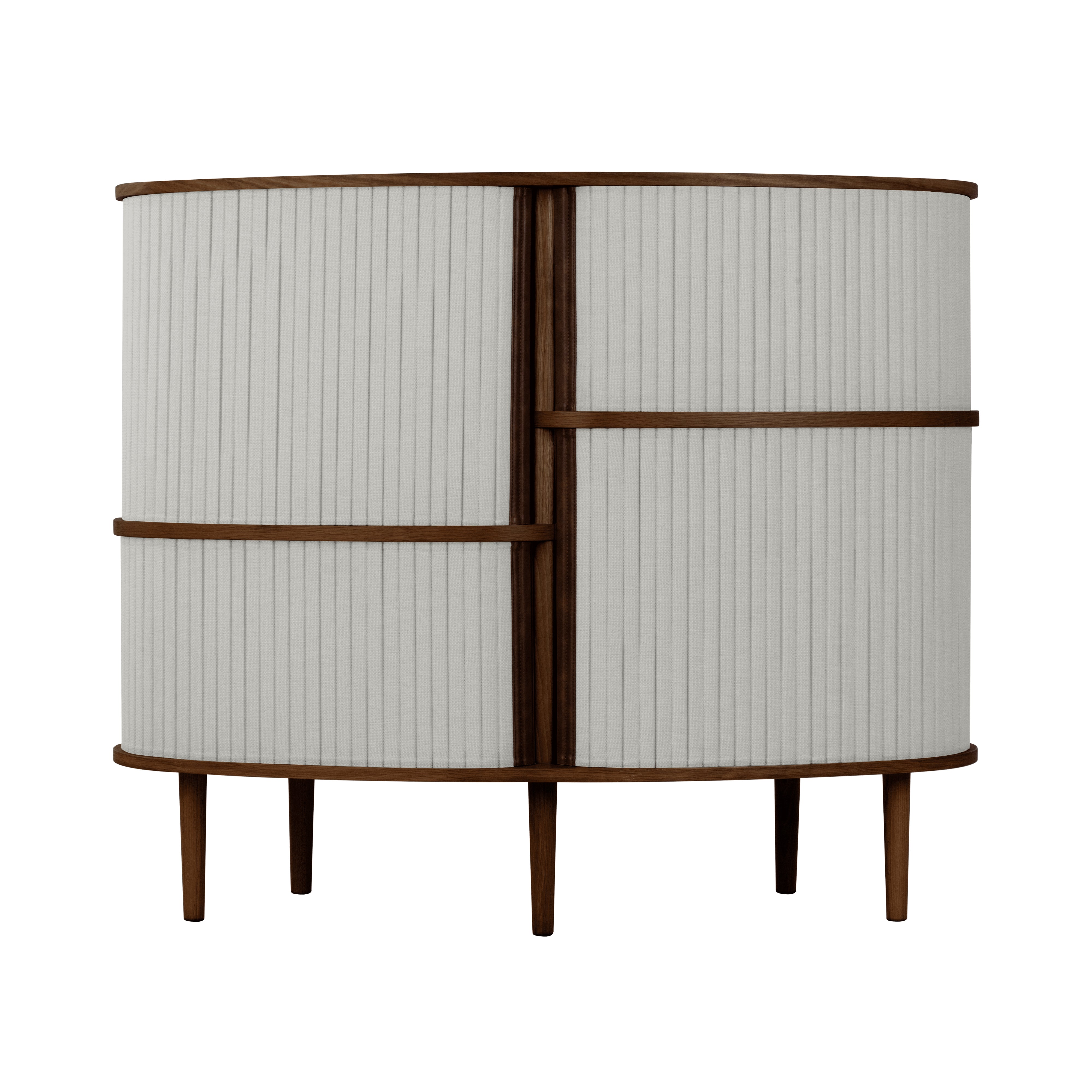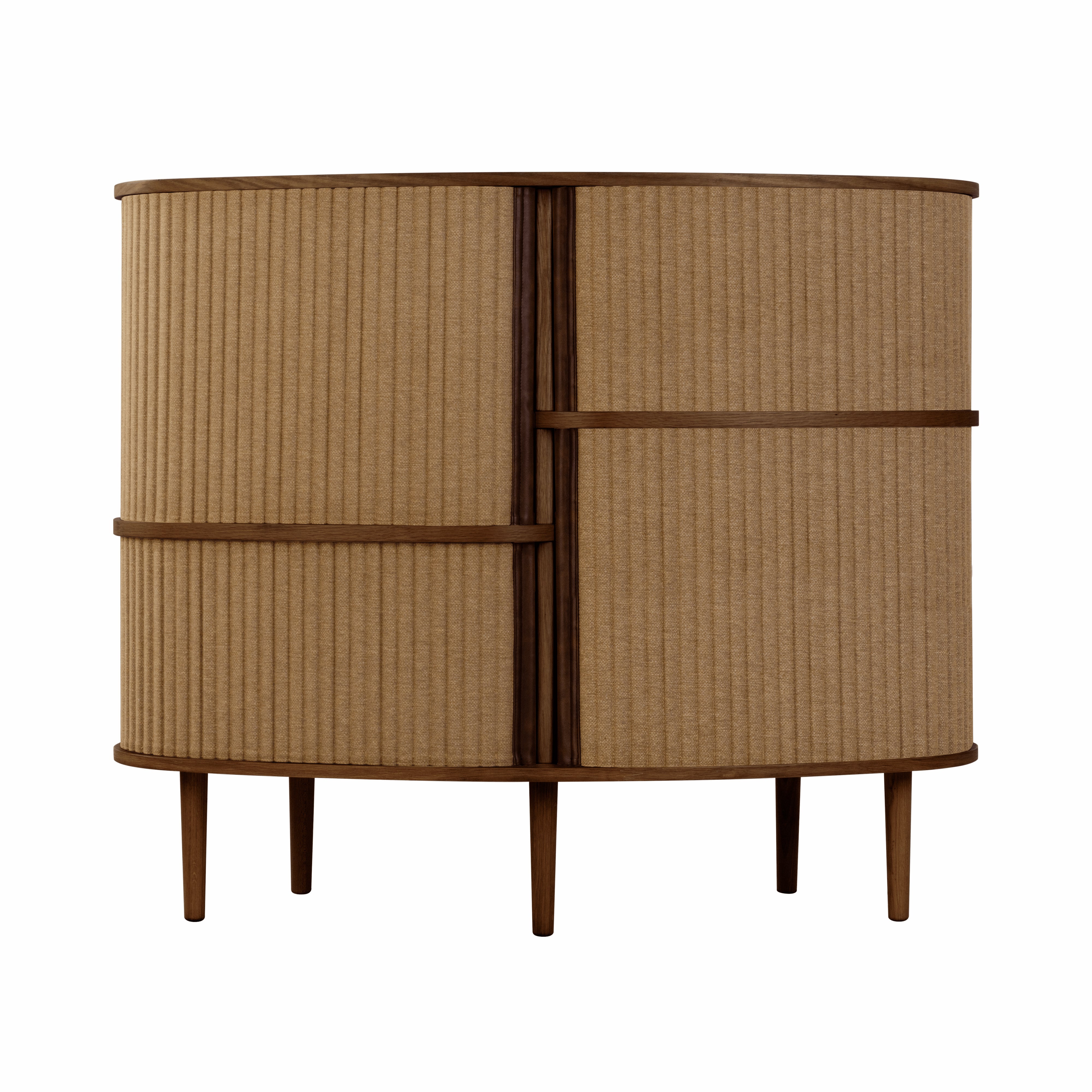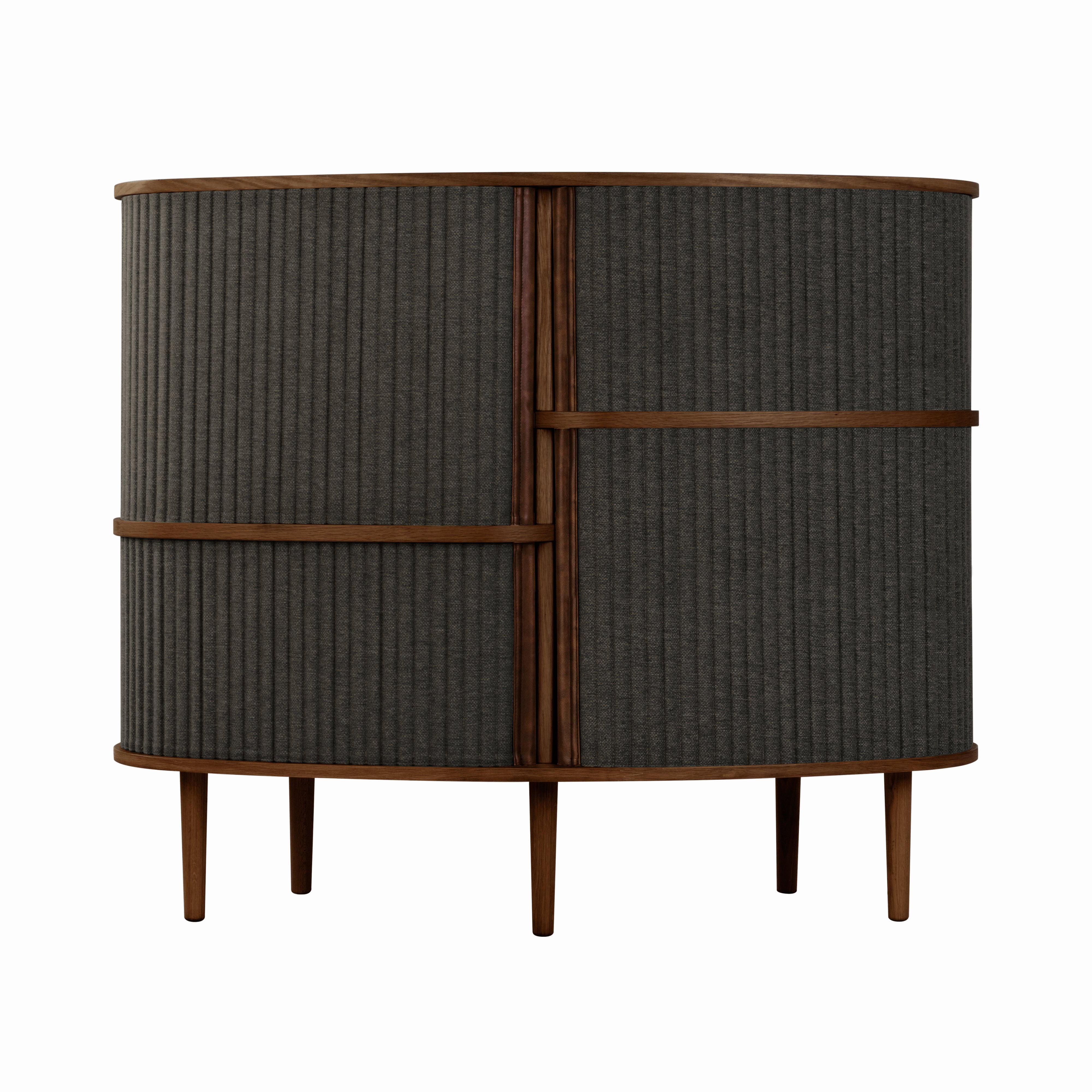 The Audacious Highboard Cabinet features sliding fabric tambour doors that allow you to choose how much of the interior to display. Designed by Jonas Søndergaard, it includes 2 shelves spacious enough to store tall vases, fine liquor, plates, ceramics, or board games. The tambour doors are easily interchangeable, enabling you to refresh the cabinet's appearance without replacing the entire piece. Available in oak and dark oak finishes, with door options in 4 colors of 100% recycled Horizons textile.