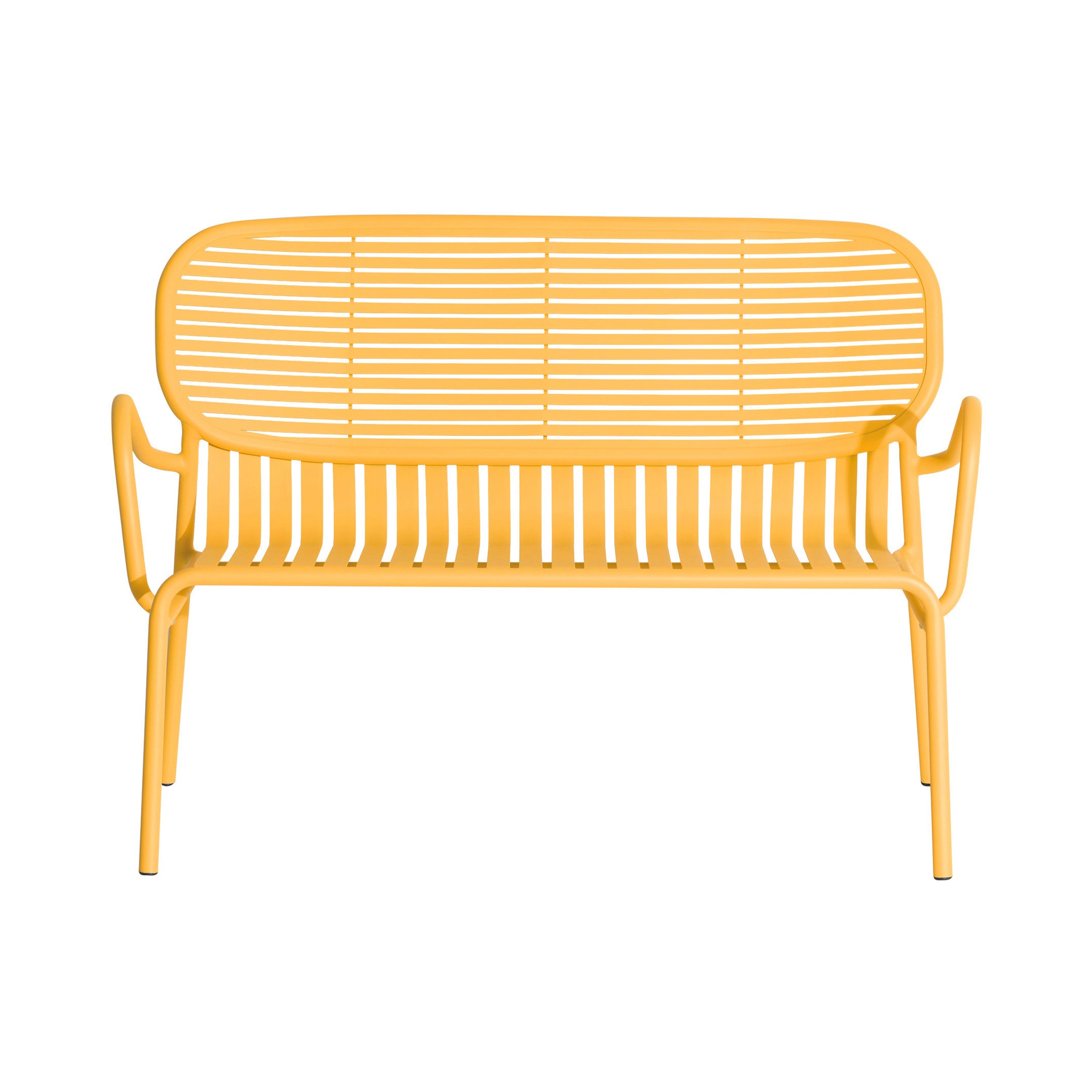 A generously proportioned 2-seater sofa helps create a complete garden room in Studio Brichet’s outdoor Week-End collection. Fully stackable to boot, the seating’s graphic slatted construction includes a high back and comfortable armrests. Fashioned in lightweight but durable aluminum, it comes in an appealing range of 8 powder-coat colors with an anti-UV matte finish.