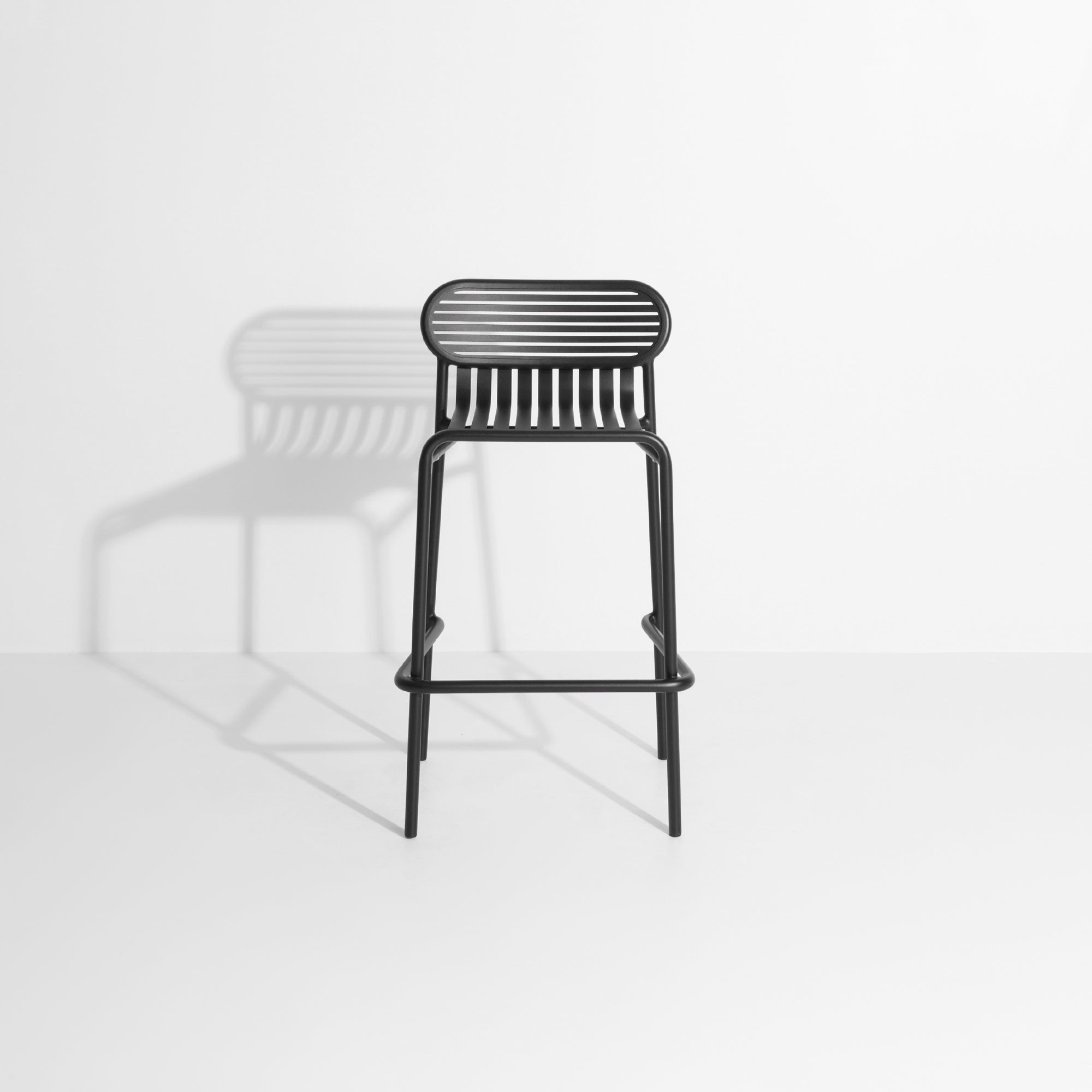 Week-End collection’s signature slat-motif seating adds a stackable high stool to pair with its corresponding bar table. Studio BrichetZiegler repeats the series’ familiar oval backrest and graphic mix of horizontal and vertical “stripes” fashioned in lightweight but durable aluminum. Also in the mix: Petite Friture’s delectable range of colors in an anti-UV powder coat with a matte finish.