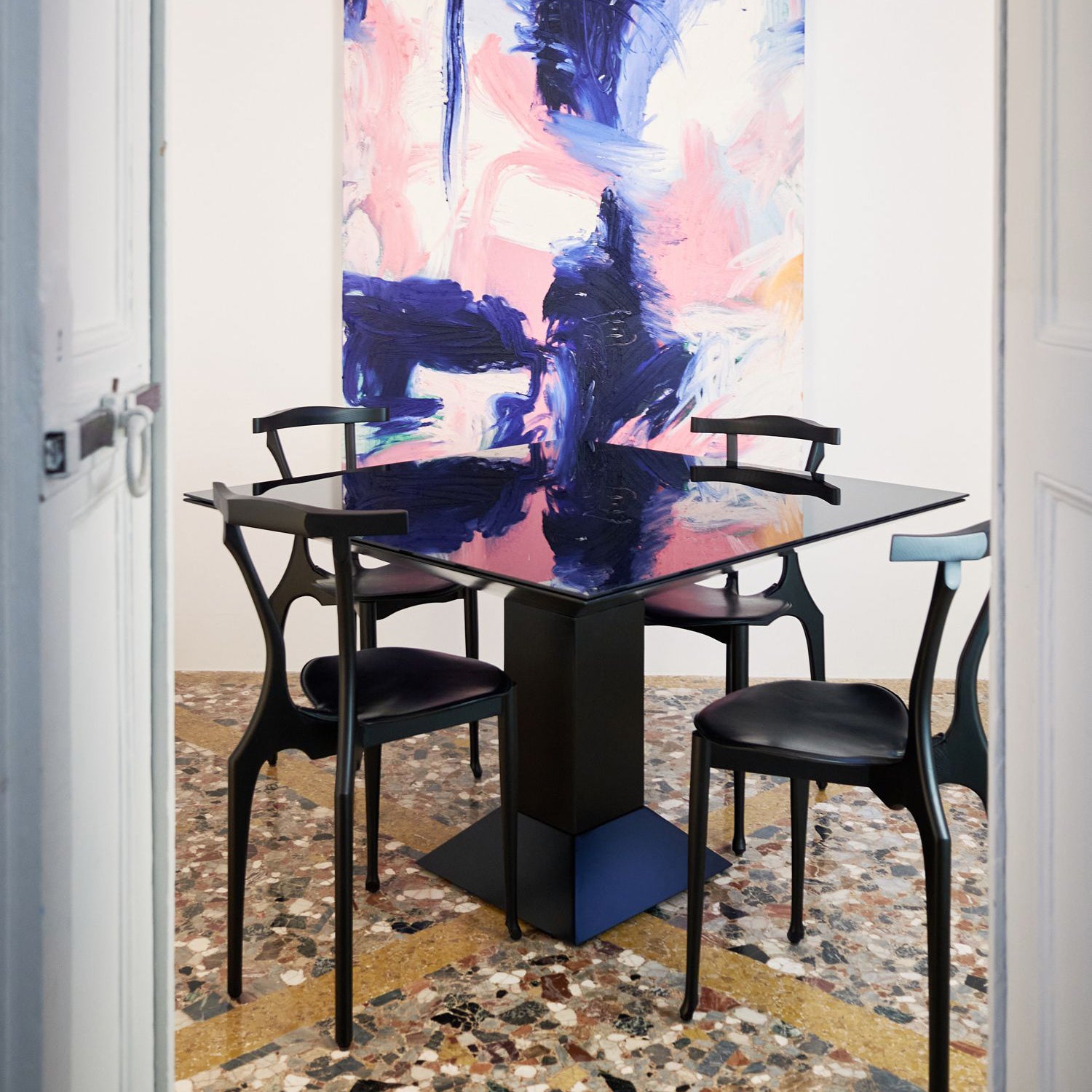 The Mettsass Table makes a bold statement with its striking geometry and vivid red color. Constructed from flat steel sheets, the base narrows like an inverted pyramid, offering stability and a sculptural look. The glass top, painted to match the base in RAL 3001 red, blends seamlessly with the structure, creating a cohesive, gem-like design. This table exemplifies Sottsass’s early, avant-garde style, vibrant red finish, and unified form that draws attention through its bold geometry and color.