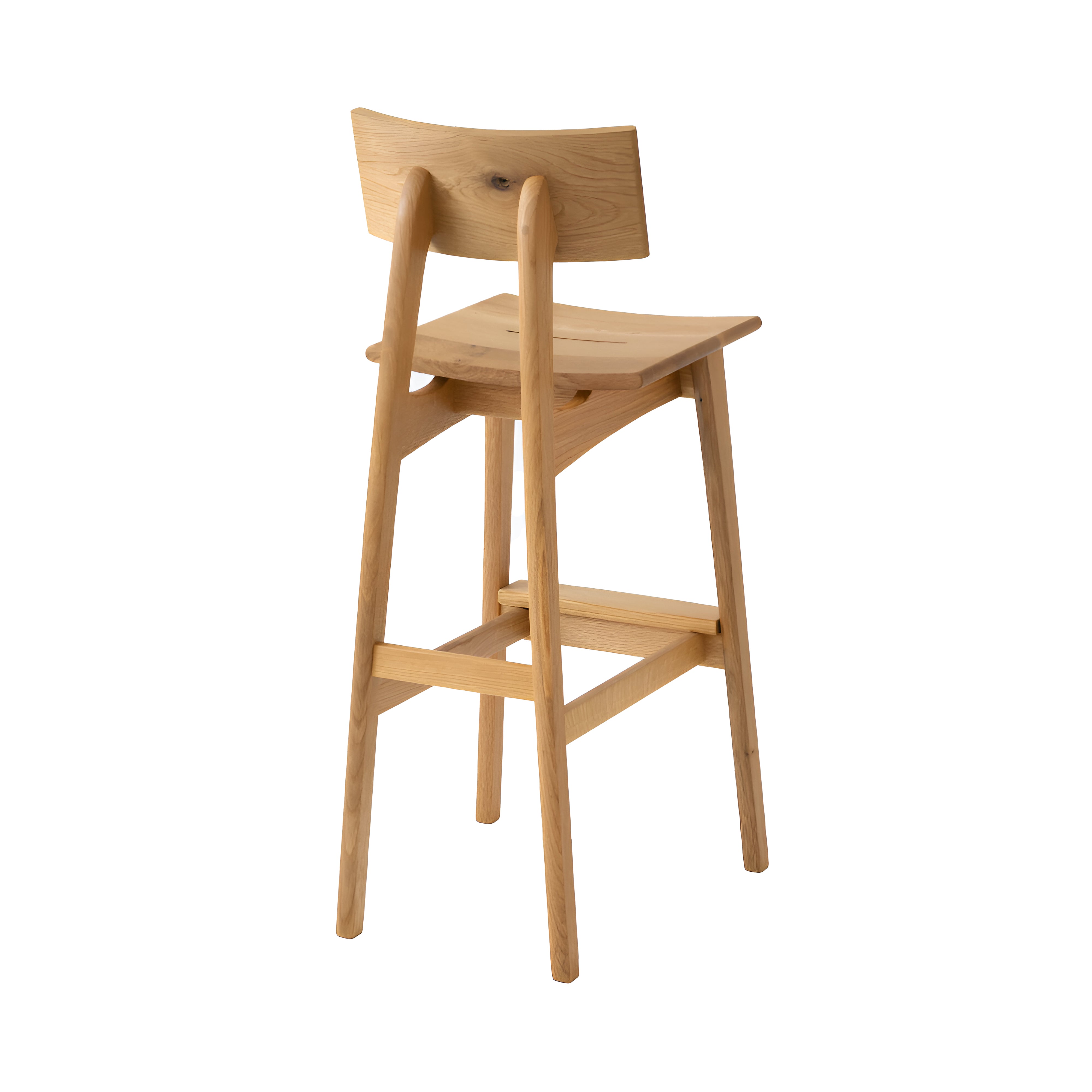 The Words from Forest Counter Chair highlights the natural beauty of Japanese oak, showcasing its unique knots and grain patterns. This approach not only brings out the wood's character but also supports sustainable forest resource use. The chair has a wooden seat and is designed to fit well on counters. Its simple design allows it to complement different interior spaces.