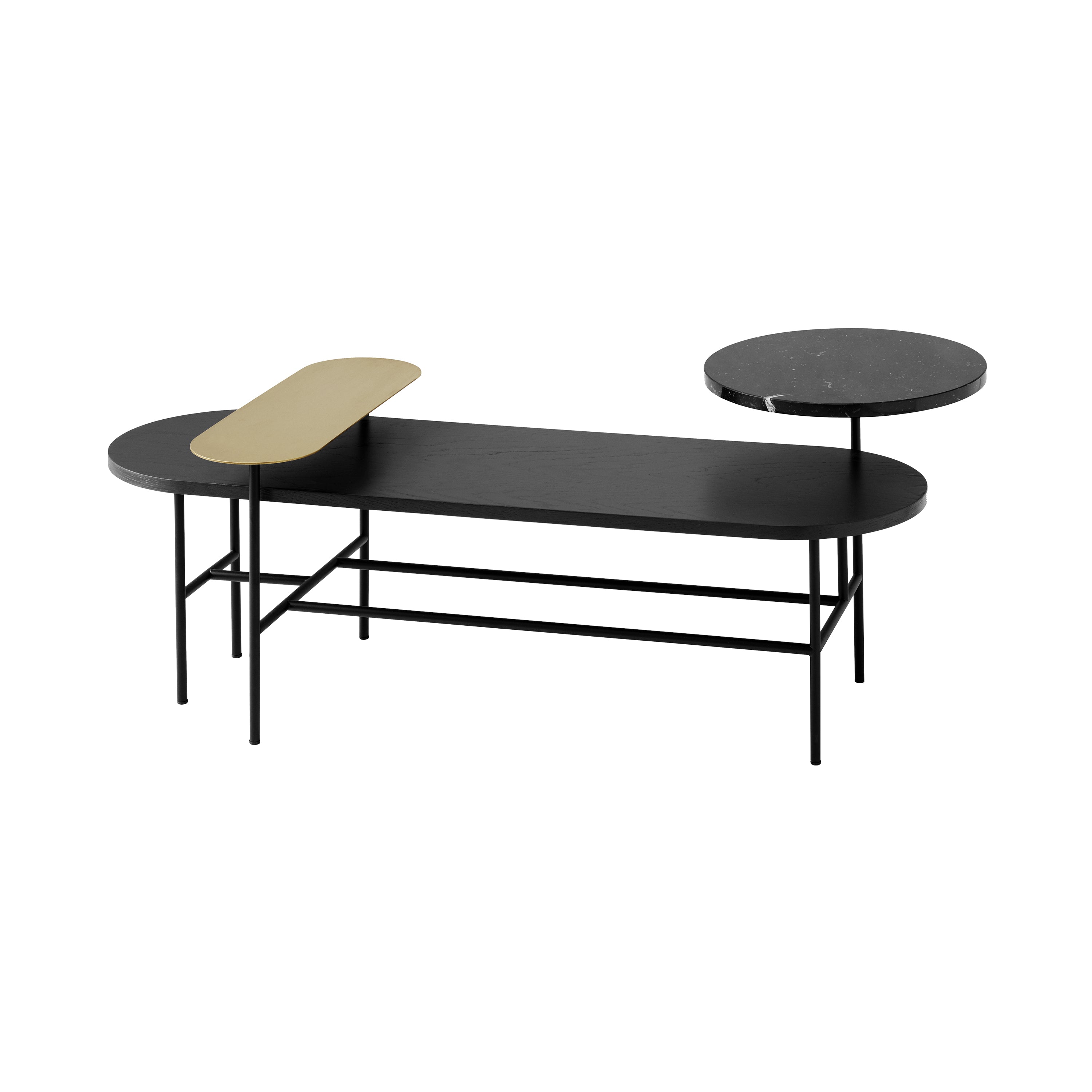 Base made from welded and powder coated steel tubes, table tops made from laser cut satin polished brass, polished marble and stained ash veneer