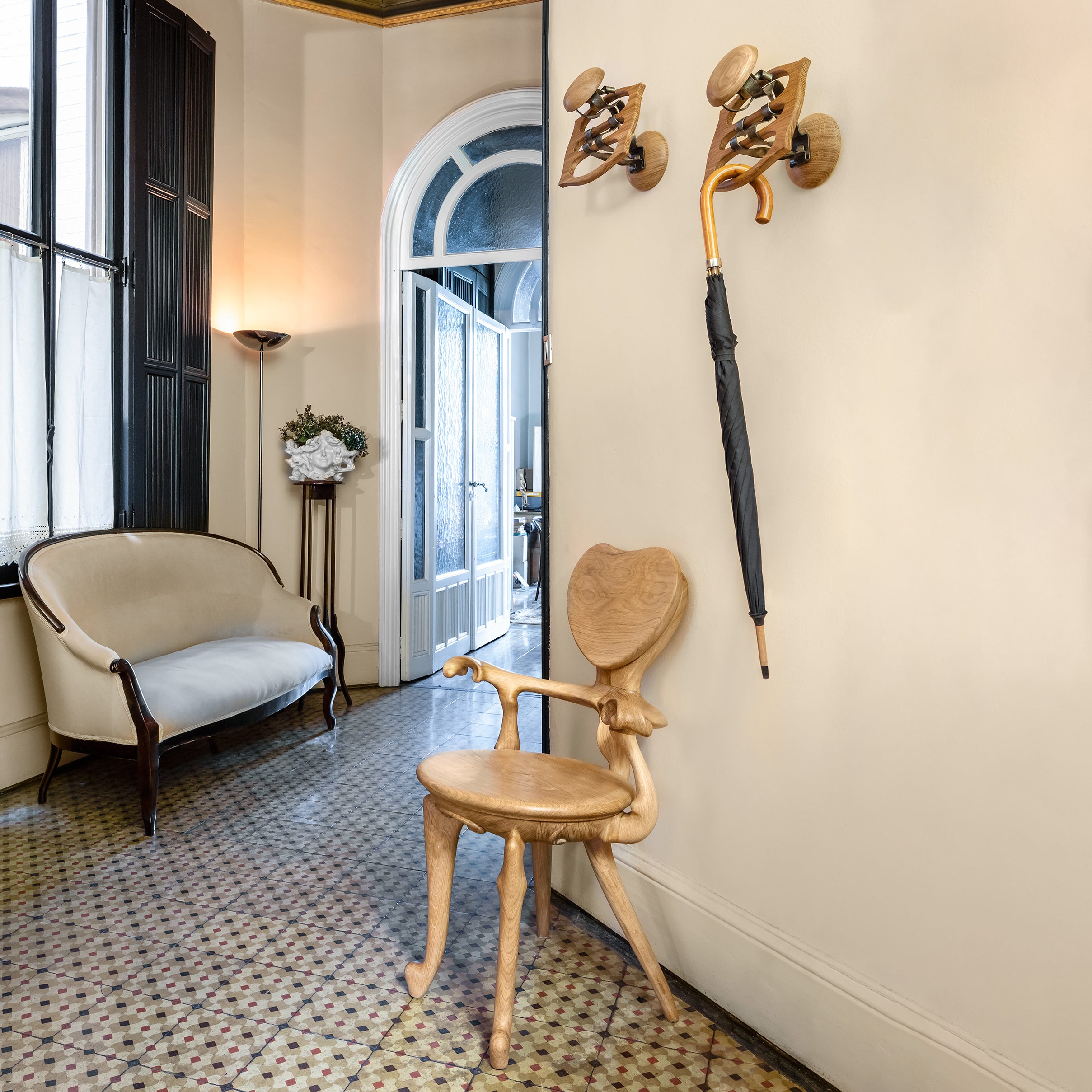 The Hanger is a compact, artistic piece designed by Antoni Gaudí, showcasing his signature organic lines and sculptural style. Made from waxed solid oak, it features curved ribbons of burnished steel that extend from a wall-mounted base to support a floating wooden rod. The steel components, finished in copper or bronze tones, give the impression of weightlessness despite the hanger's sturdy build. It includes three elongated slots, ideal for hanging umbrellas or garments. Reflecting Gaudí's architectural vision, this intricate design merges practicality with artistic craftsmanship, standing as one of his smallest yet most charming creations.