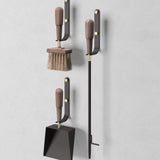 Eldvarm adds a space-saving, wall-hung set to its stylish Emma line of fireplace accessories. Intelligently designed, it includes a blow poker which also doubles as a bellow, a fireplace brush in a durable blend of horse hair and tampico (the root of the agave cactus) and a shovel with a deep blade to avoid spilling ashes. The grouping contains 3 wall hooks and the tools in powder-coated steel to match, with wood handles in beech or walnut (chosen to complement each hue) and detailing in solid brass. The Cinq version in brushed stainless steel with tool handles in oiled walnut can be used either indoors or outdoors.