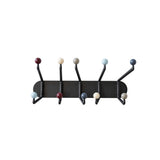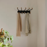The Capture SC76 Hanger is a wall-mounted hanger with ten swinging arms made of powder-coated aluminum and lacquered oak knobs. It is suitable for hanging towels, coats, or bags in bathrooms, kitchens, or entryways. Available in graphite with oak or multicolored knobs.