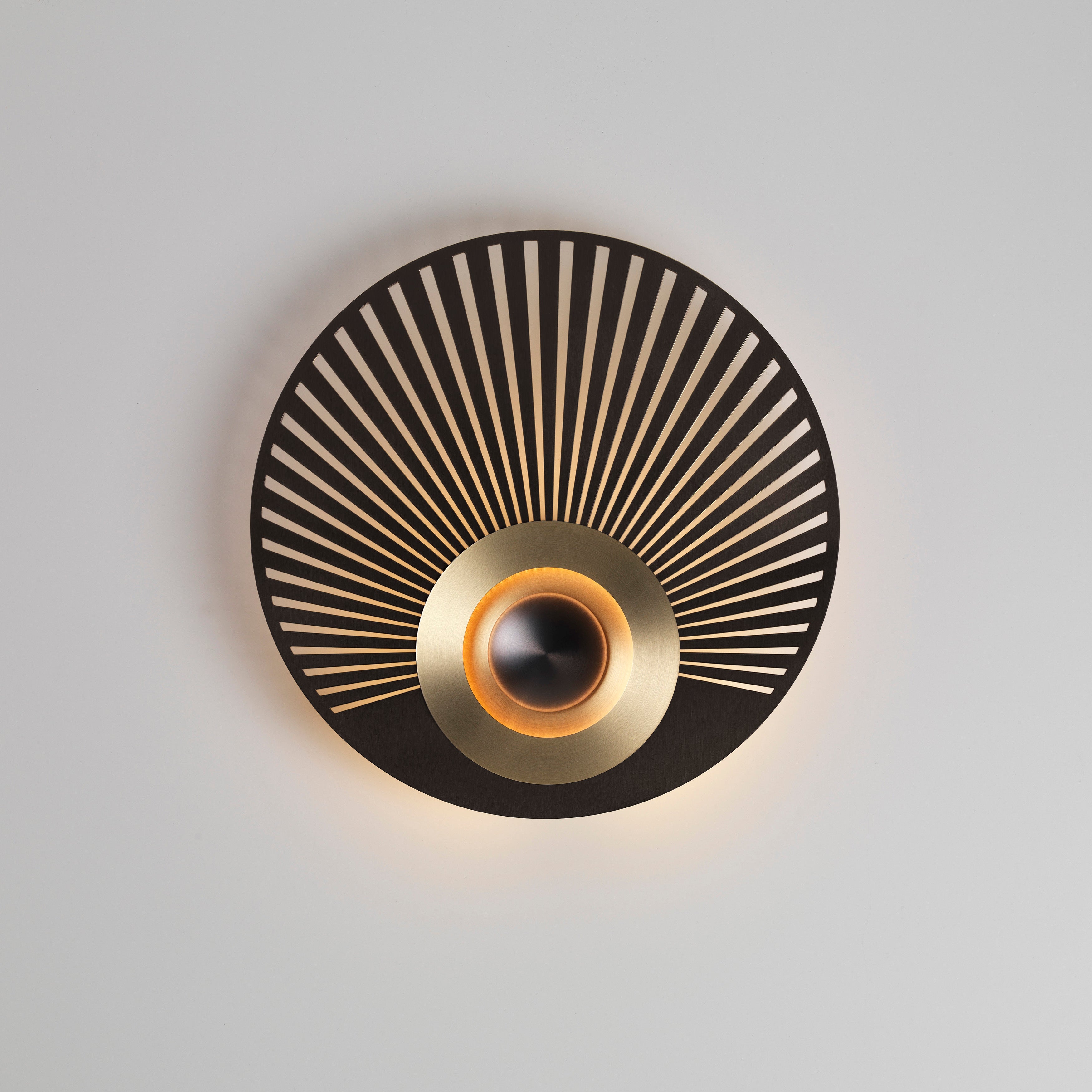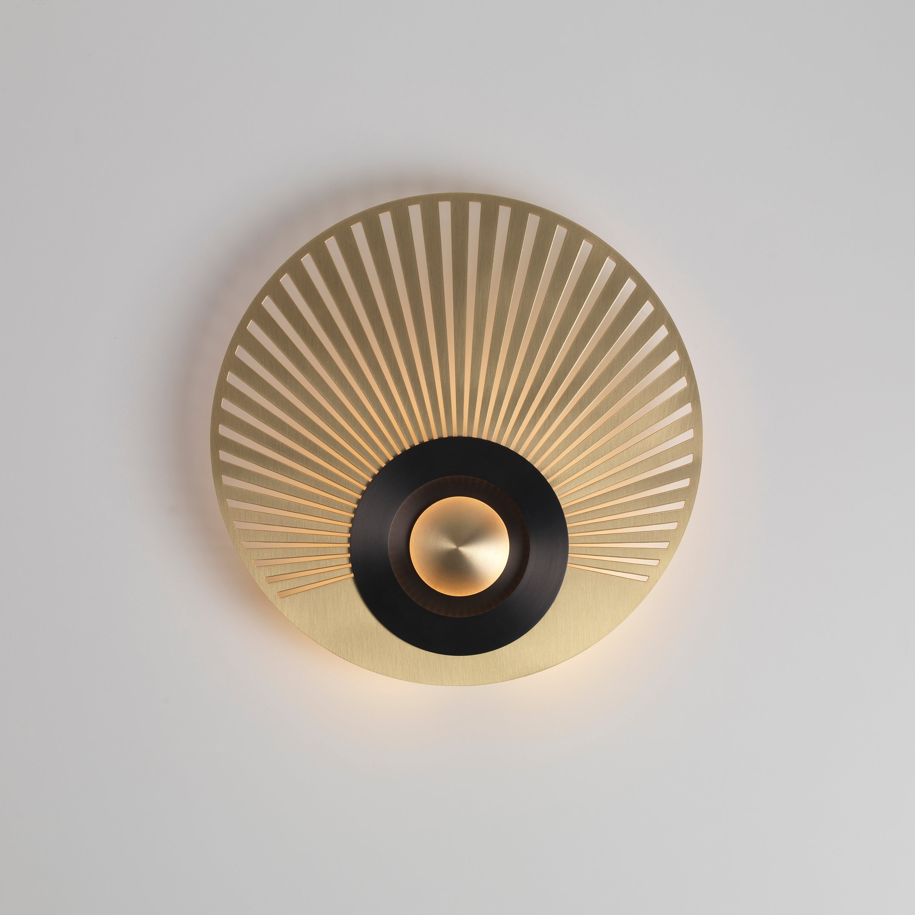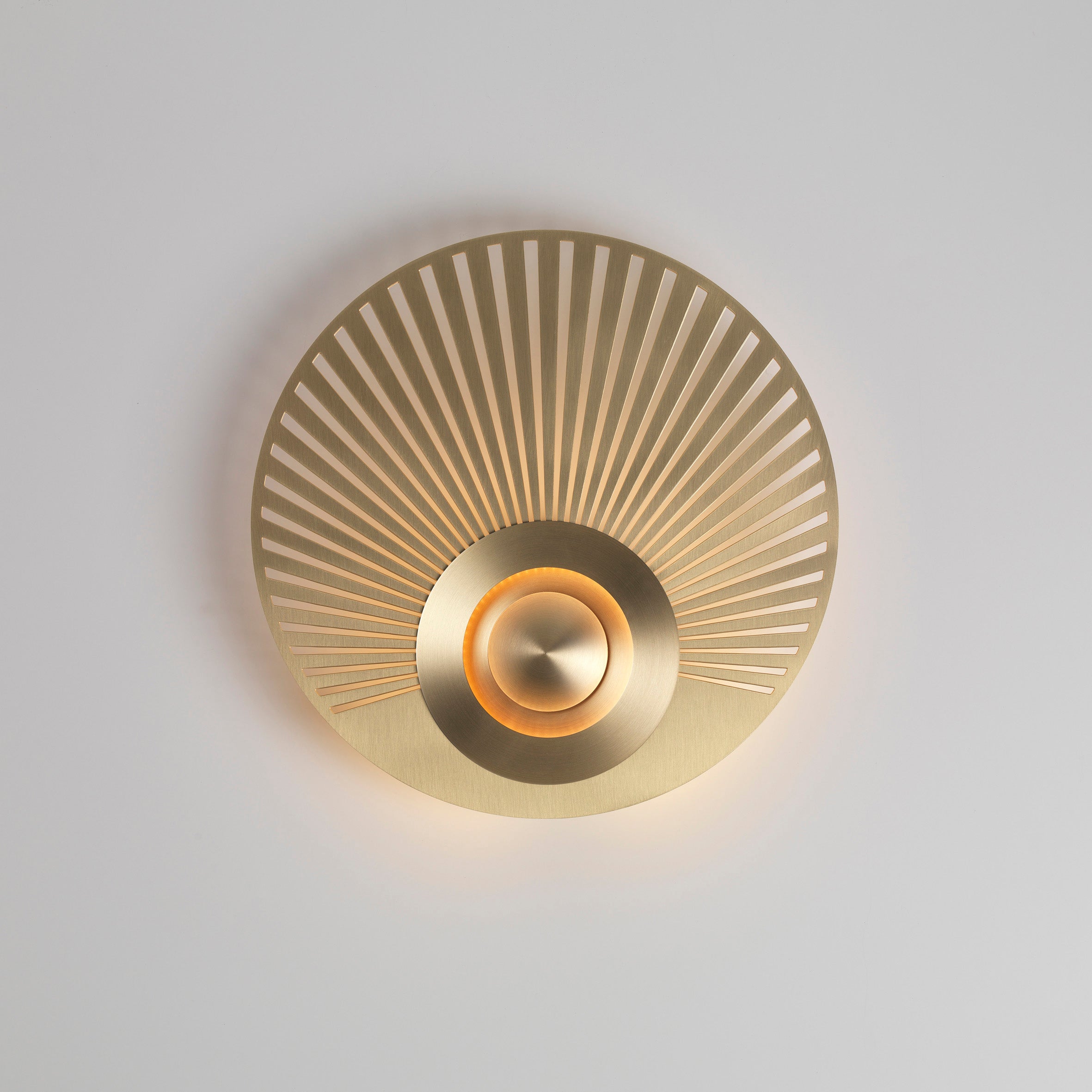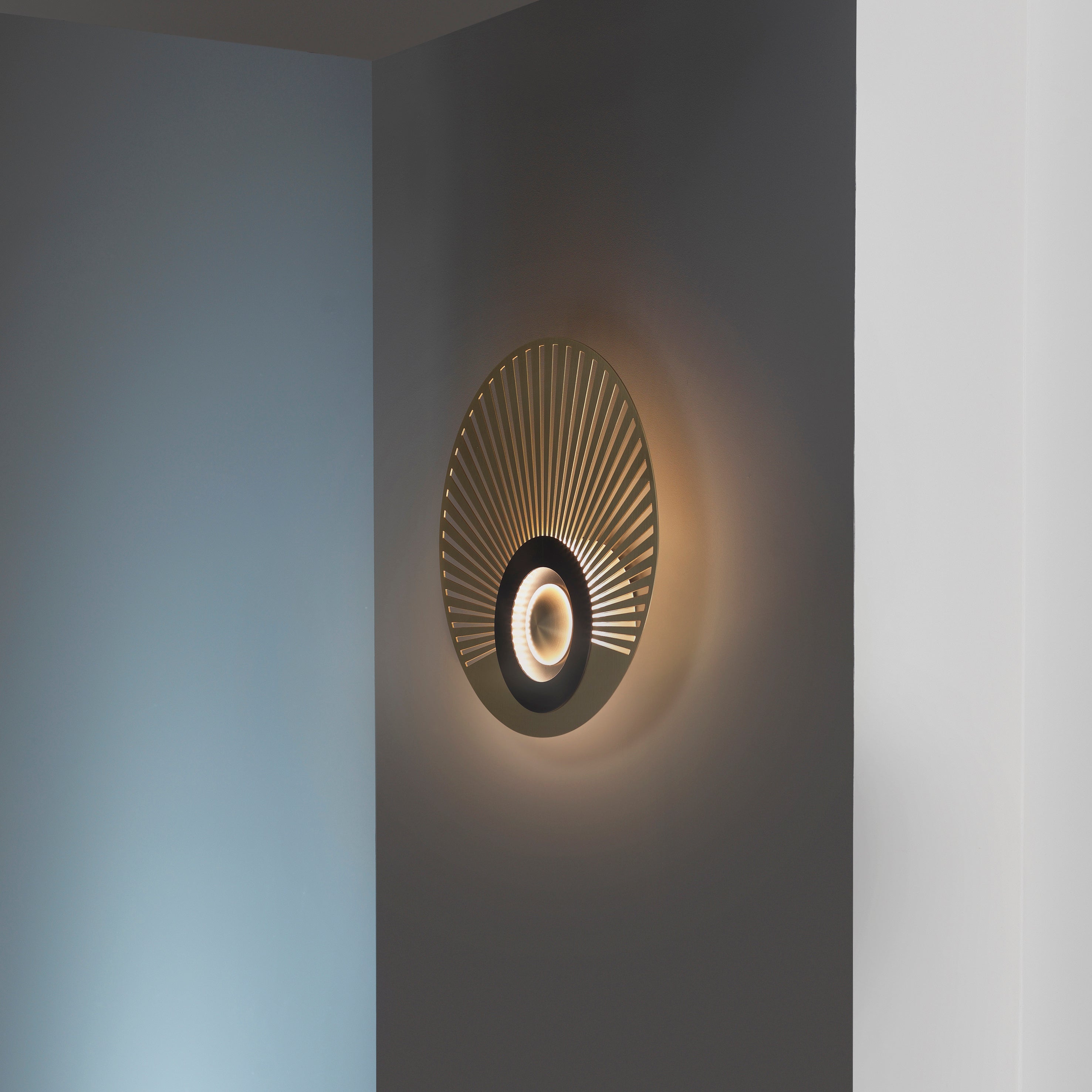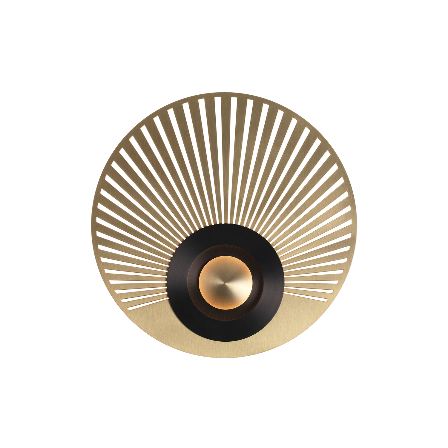 Radian delights with a sunrise motif revealed in its pierced-metal shade, from CVL’s stunning wall light series Earth. The French maker finesses an off-center placement to emphasize the character of Émilie Cathelineau’s design. Rendered in solid brass, the lit openwork complements the shade’s overall softening the effect on the central LED light source, spreading its warm illumination evenly.