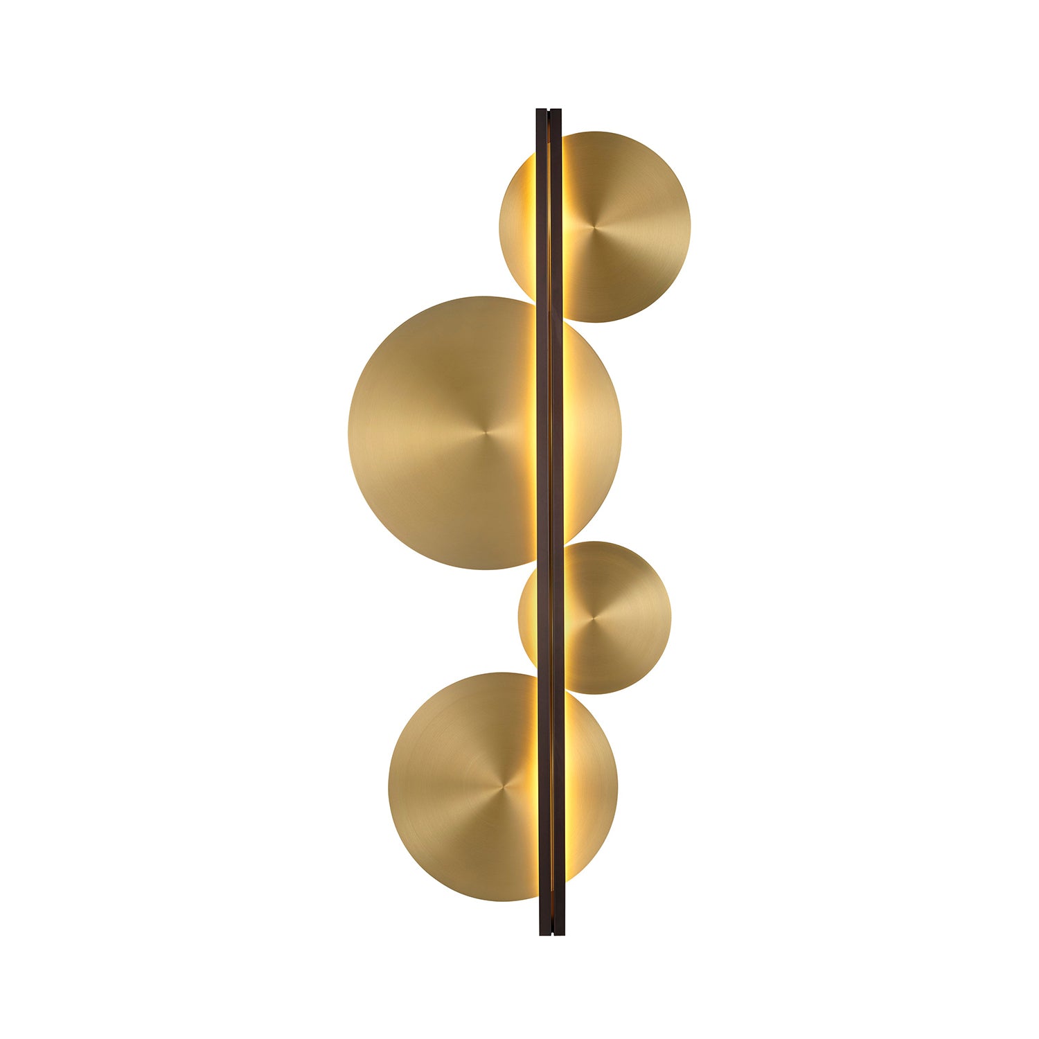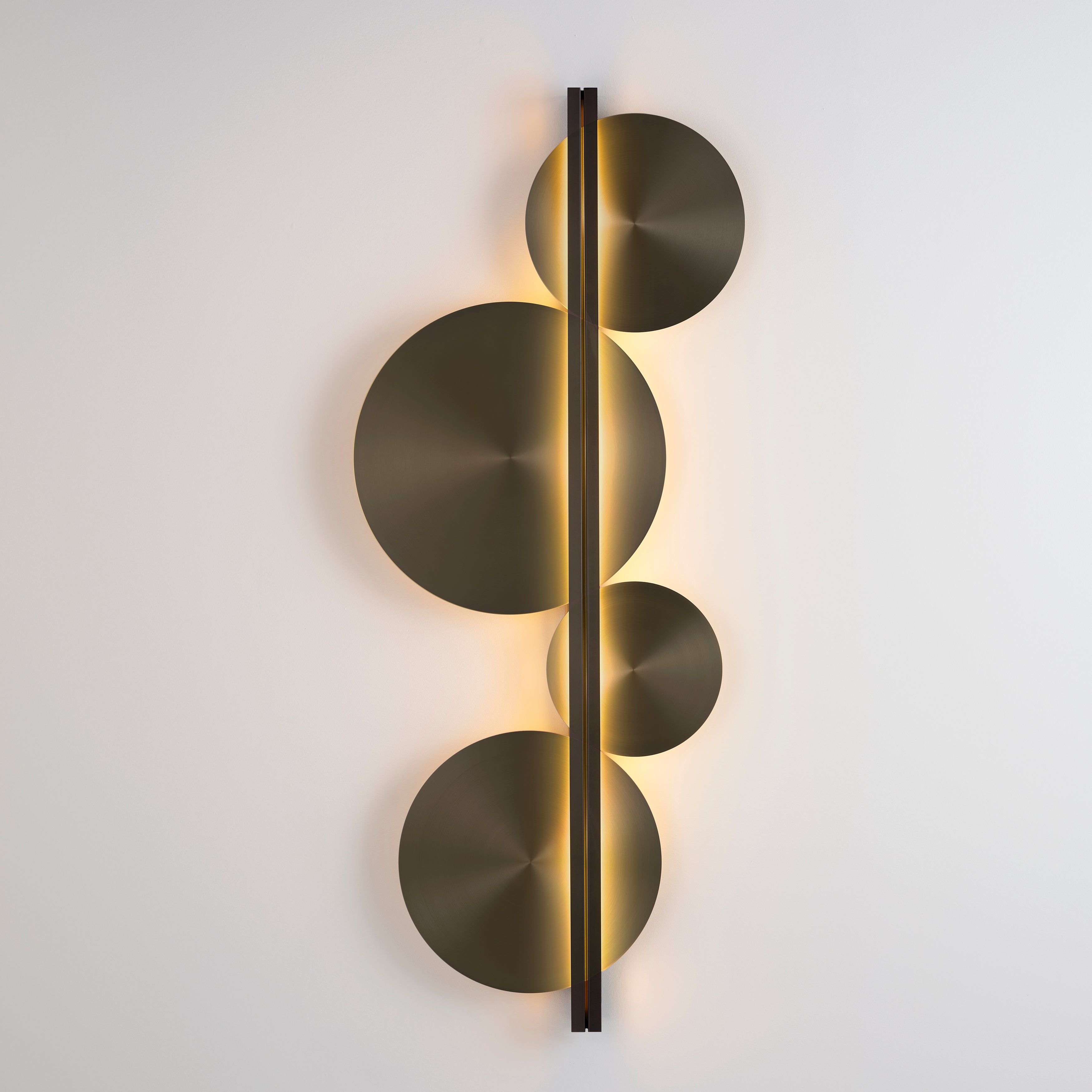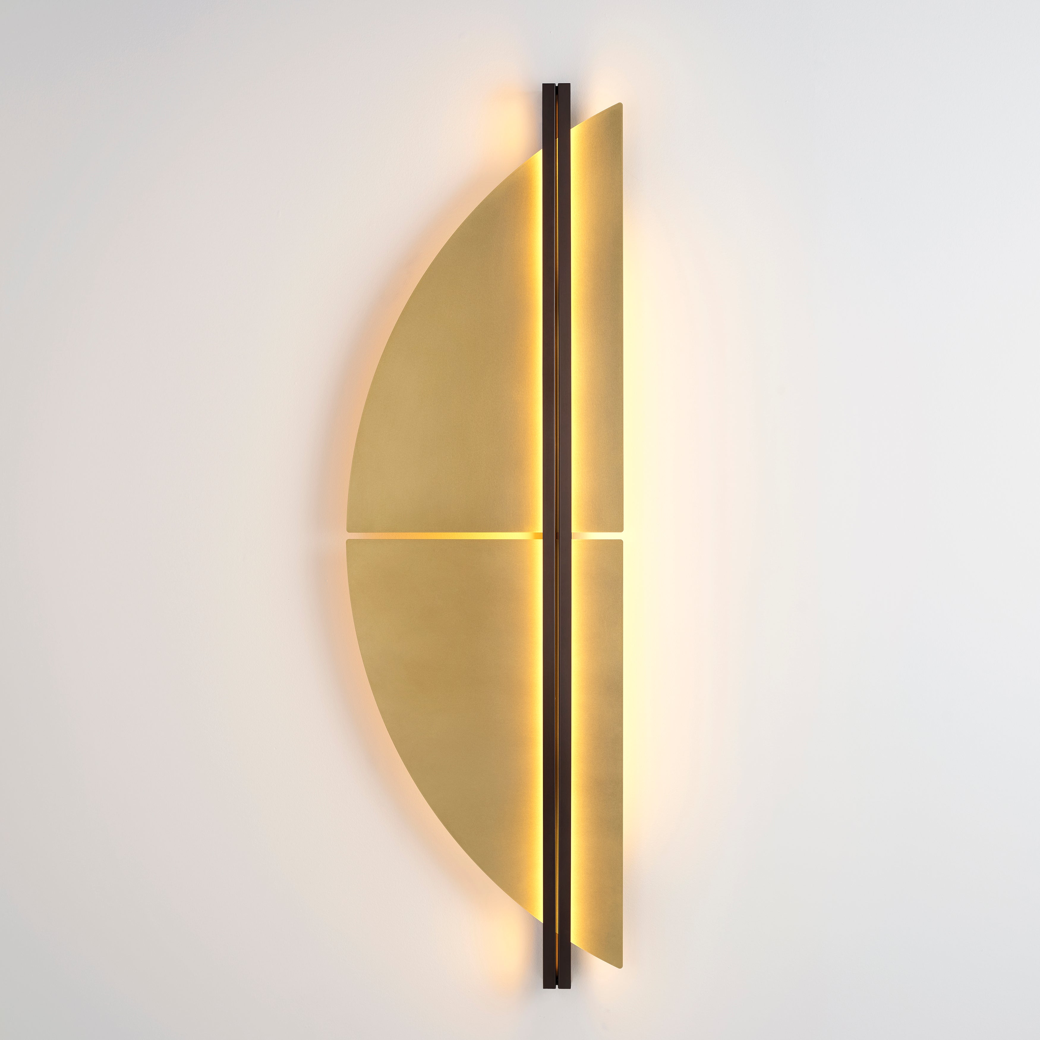 A fabulous focal point in any setting, Strate takes form as a grouping of abstracted shapes linked by a luminous line. CVL’s Émilie Cathelineau tips between wall light and authentic sculpture with multiple stylistic variations of the piece, each to be oriented either vertically or horizontally. Warmly diffused illumination from the integrated LED is reflected in the solid-brass structure handcrafted in France with varied satin finishes of brass, graphite, nickel and copper.