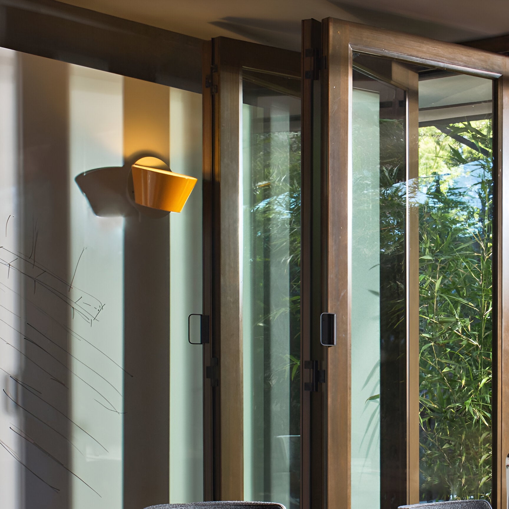 Also throwing a little shade—the Tam Tam A. This wall mounted single-shade fixture complements the eye-catching cluster pendant from Barcelona-based Marset and Berlin designer Fabien Dumas. In a choice of colors set on a white base plate, the shade can be rotated 360 degrees. Aim it downward, sideways or upward to reflect off the ceiling. Shade made of lacquered aluminum with an opalescent methacrylate diffuser over the open end to soften the light.