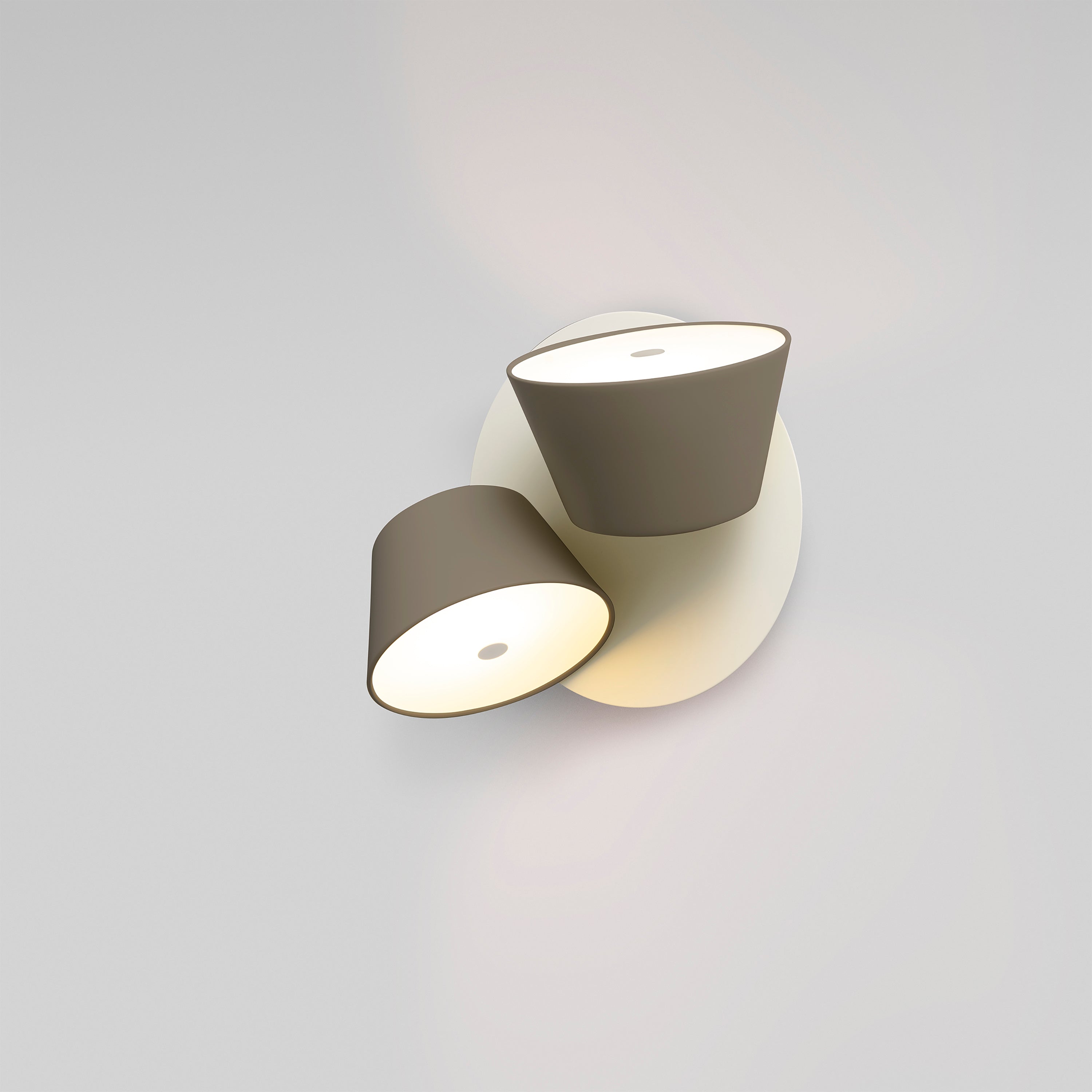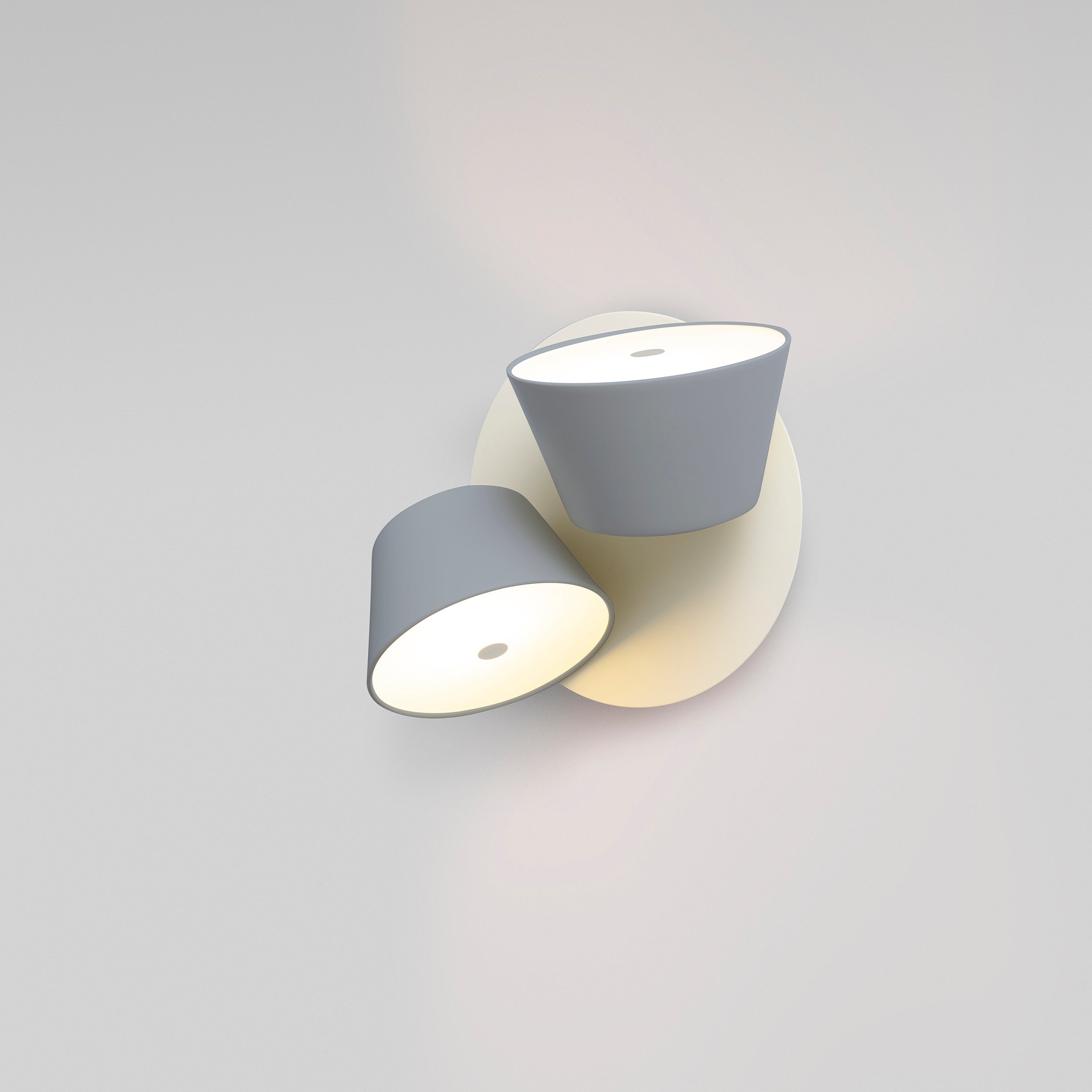 Throwing double the shade—the Tam Tam A2. This wall mounted dual-shade fixture complements the eye-catching cluster pendant from Barcelona-based Marset and Berlin designer Fabien Dumas. In a choice of colors set on a white base plate, shades can be rotated 360 degrees. Aim each one downward, sideways or upward to reflect off the ceiling. Shades made of lacquered aluminum with opalescent methacrylate diffuser over the open end to soften the light.
