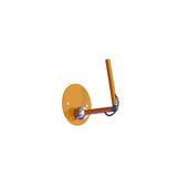 A pivoting head and articulated arm allow this wall-mounted lamp to direct focused light with precision. Two slender cylindrical stems are connected by a pivot, enabling flexible orientation of the light source. Finished in glossy lacquered tones scarlet red, mustard yellow, and satin black nickel.
