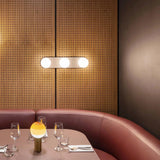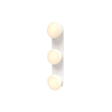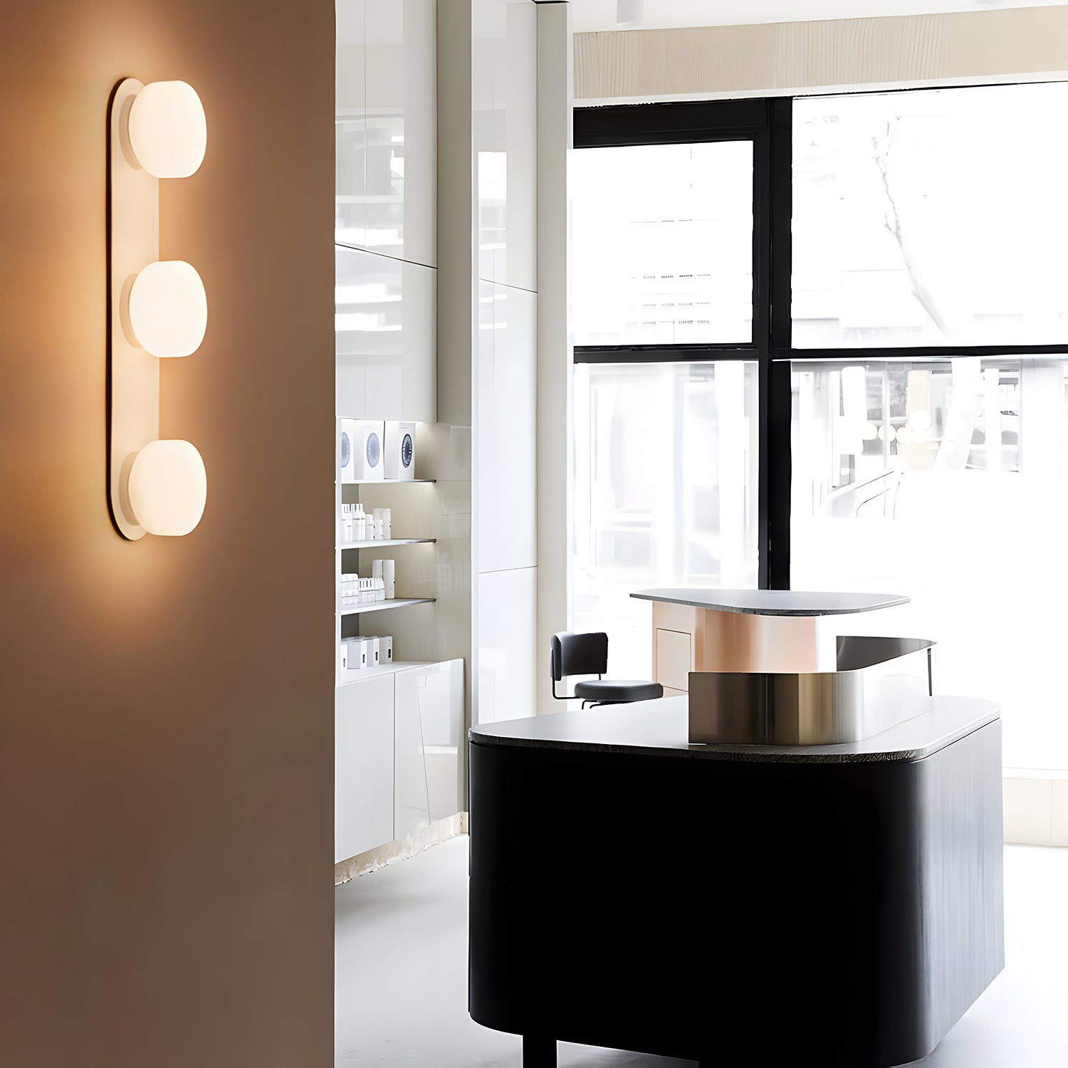 This wall-mounted fixture features three opal‑glass discs arranged linearly on a metal backplate, providing broad, even illumination suitable for mirror-side or vanity use. Made from opal glass and a steel or aluminum plate. The glass discs are available in droplet, faceted, or ribbed textures, and the backplate comes in 7 finishes.
