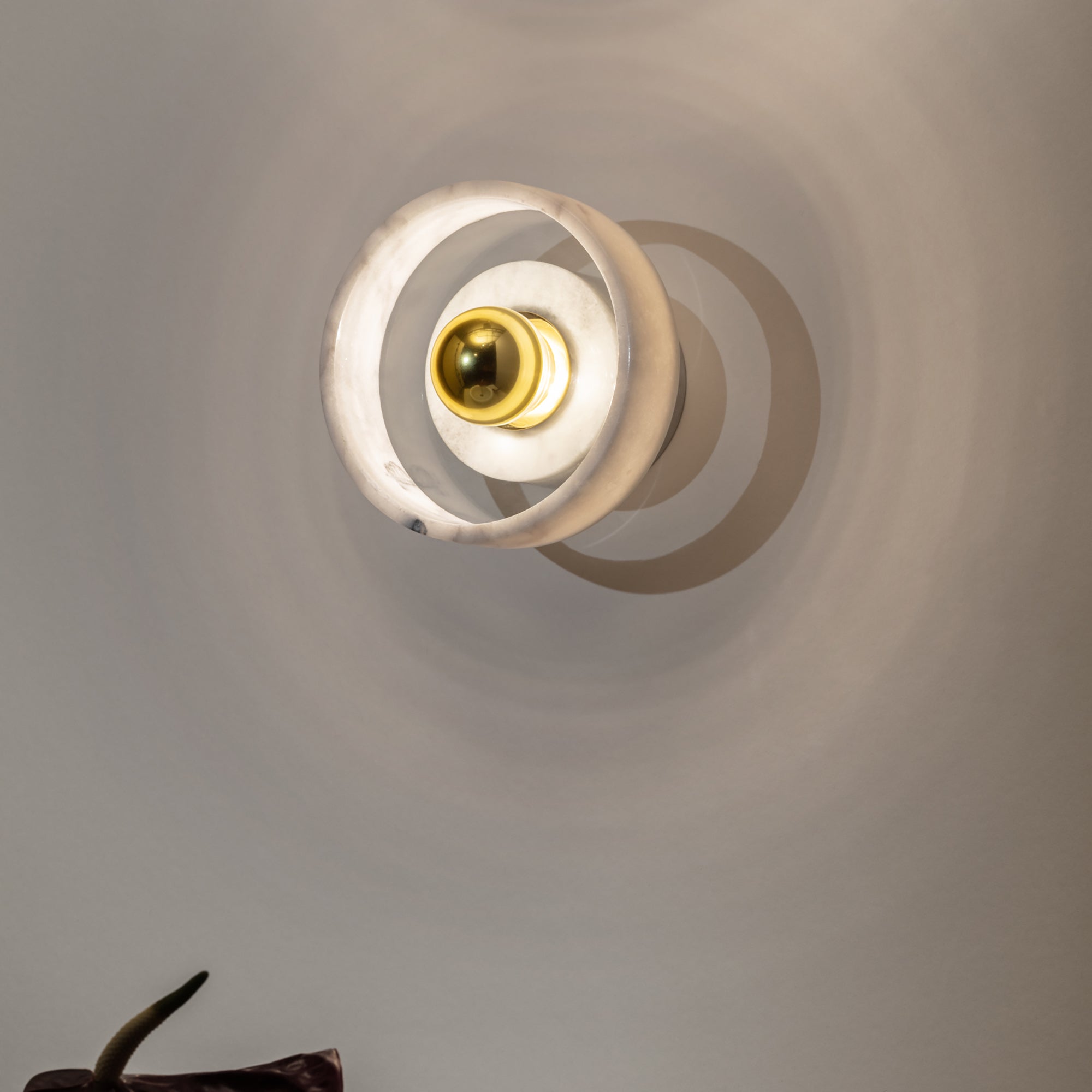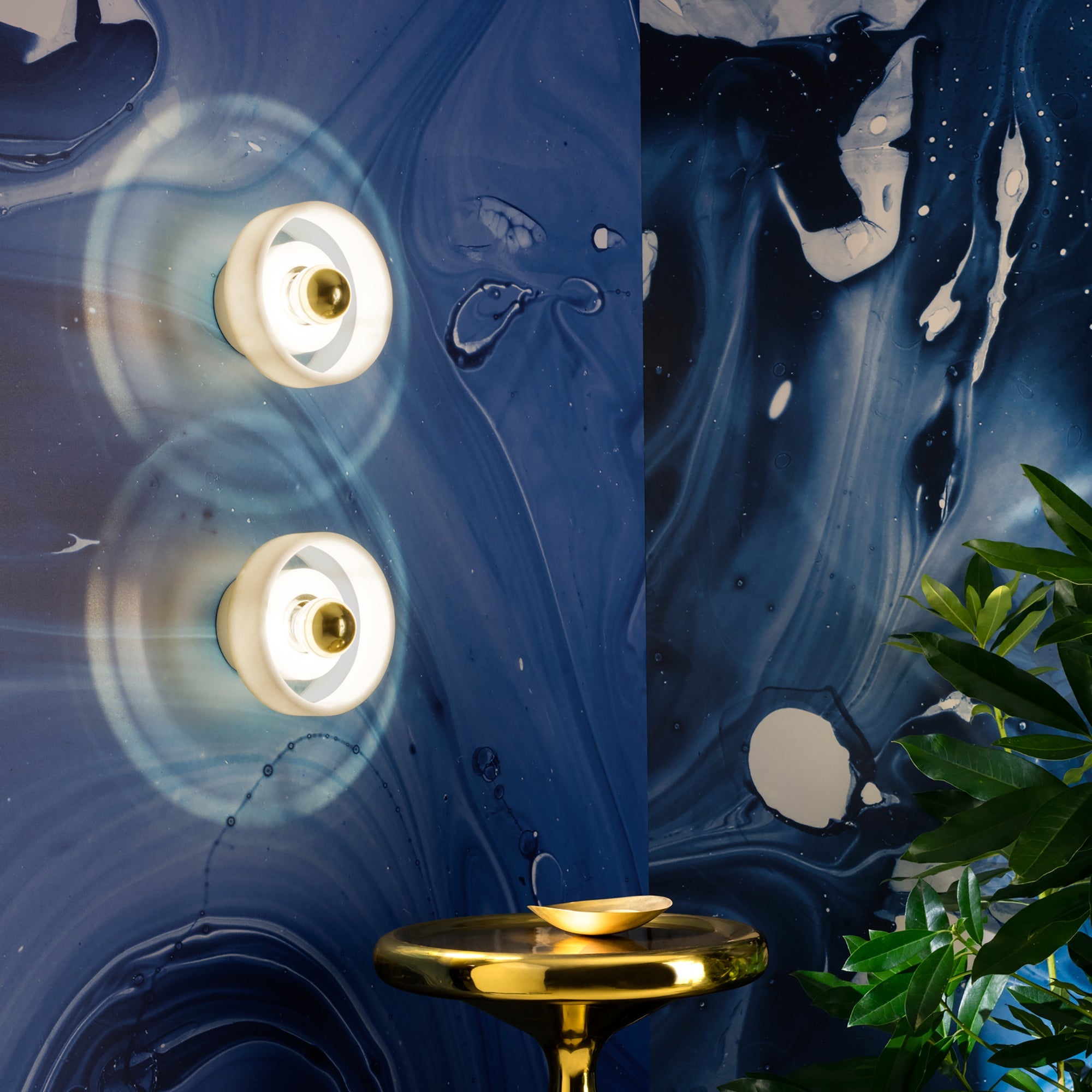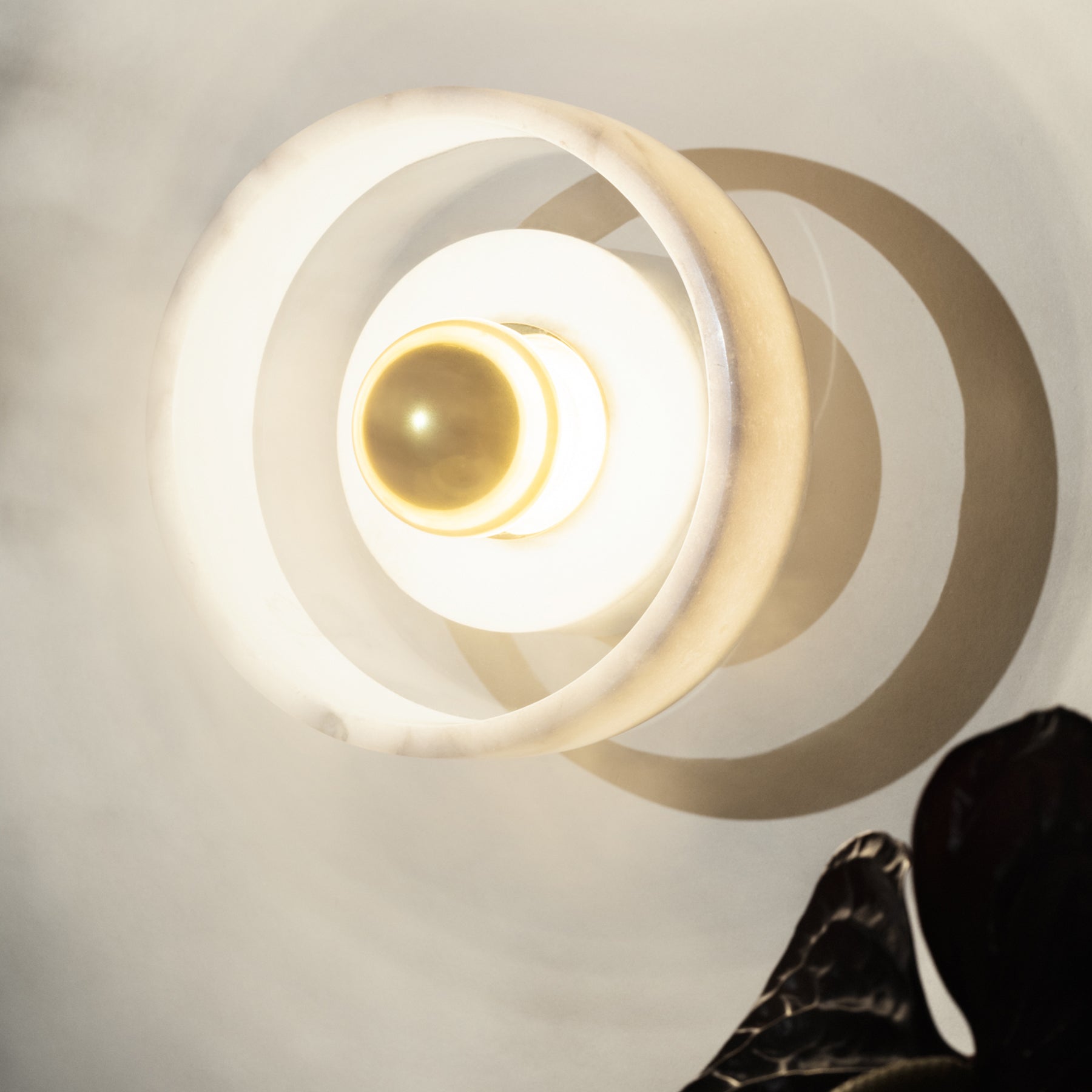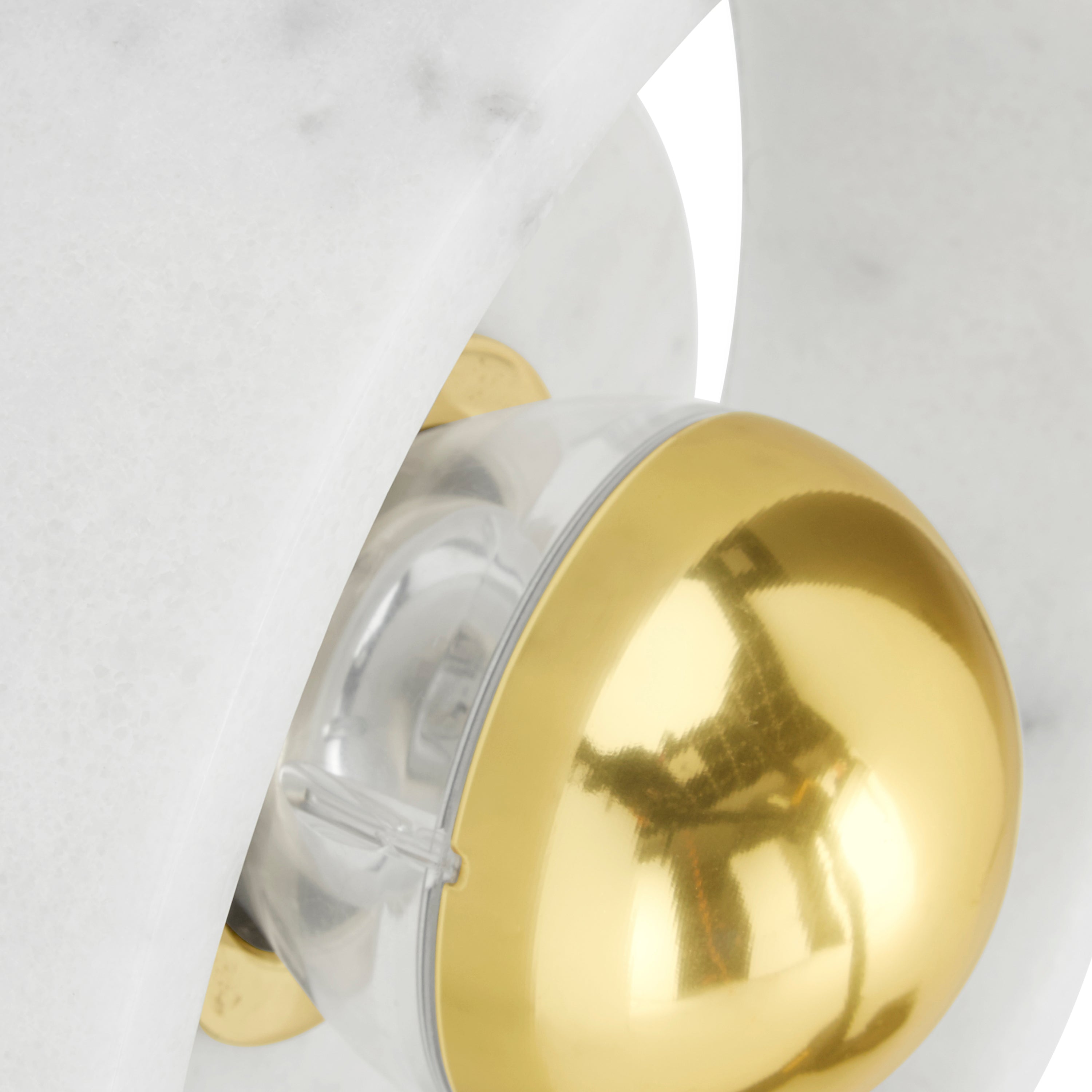 OBE-honored British design star Tom Dixon adapted Stone Wall Light from his earlier standout housewares. With its Morwad marble "halo" mounted on a glass plate, the steel-tipped bulb appears to float in the center. Cut to the thinnest possible depth, the semi-translucent stone reveals its patterned surface while also casting circular reflections on the wall behind. Steel-capped bulb sold separately.