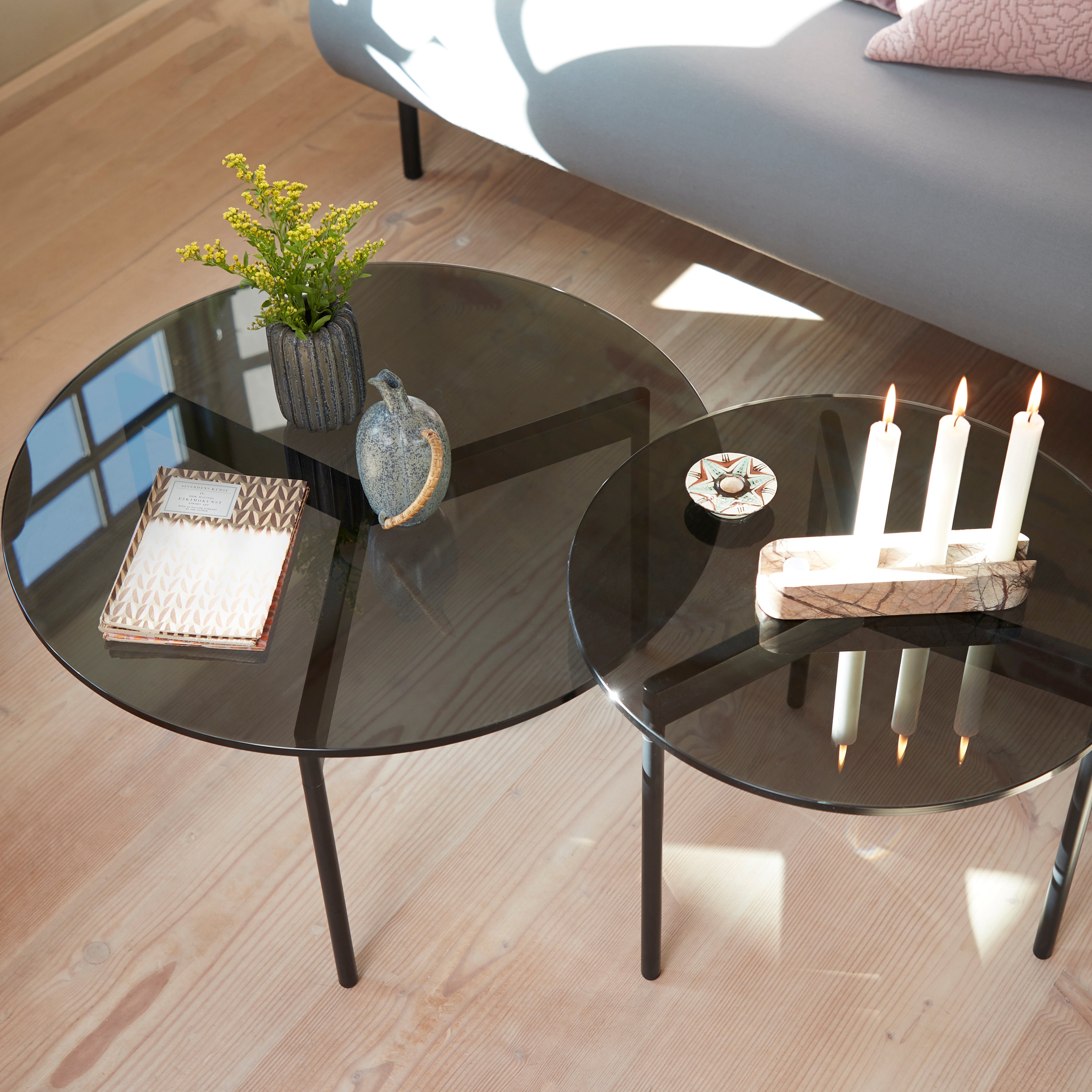 A transparent glass round tops From Above, highlighting the graphic simplicity of the coffee table’s triangulated steel base and making a bold statement from designers Morten & Jonas. Choose between 2 different sizes, with the frame in warm white or select Warm Nordic colors, and the option of either clear glass or smoky variants.