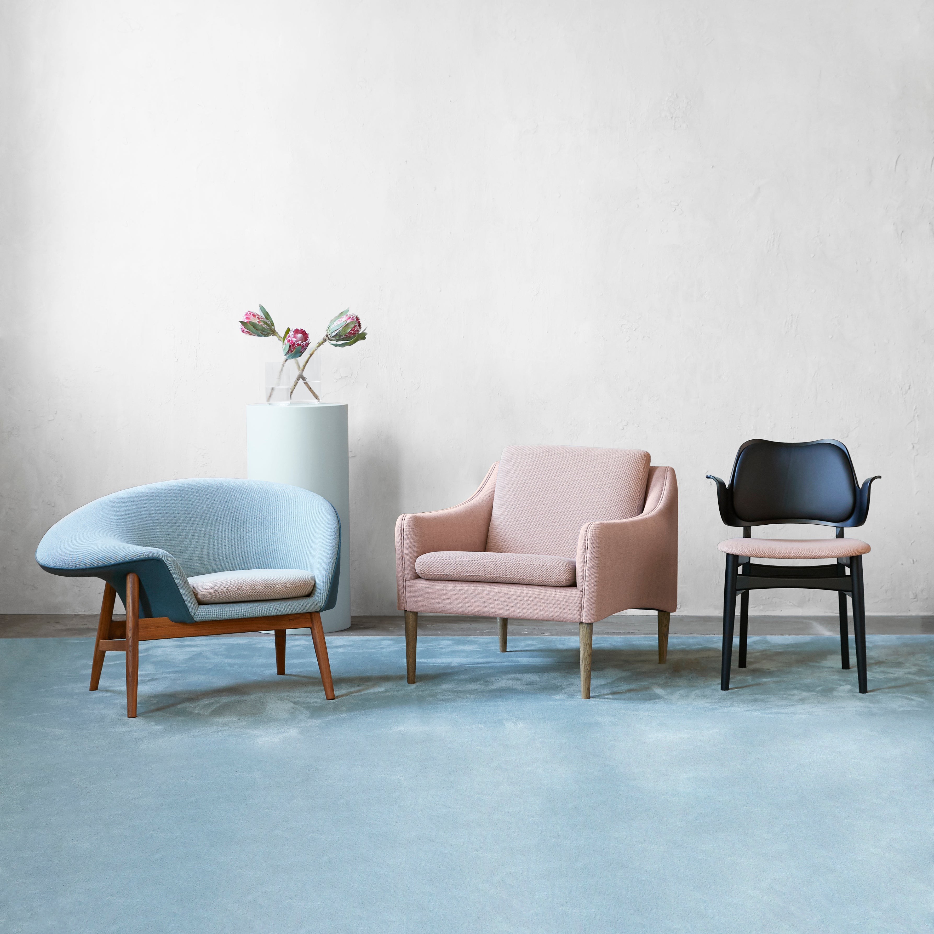 The Mr. Olsen Lounge Chair is a refined piece of Danish design history, originally crafted by renowned architect Hans Olsen in 1958. This chair is celebrated for its slender, organic form, which stands out from other mid-century classics due to its lightness and elegant lines. The soft, curved armrests and tapered wooden legs contribute to its graceful appearance. Its sturdy frame is complemented by solid oiled oak or smoked oak legs, and the upholstery is supported by a foam and spring system for lasting comfort. This timeless design brings a touch of classic mid-century elegance to modern interiors.