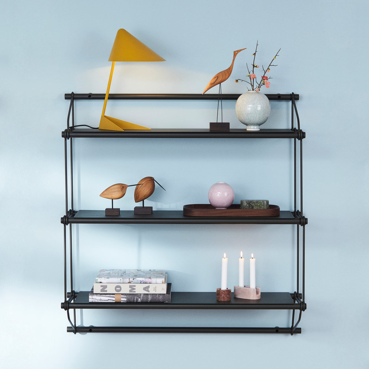 Suggested by elegant hat racks on passenger trains, designers Mortan & Jonas devise an updated storage option with either a 3-shelf bookcase or single-shelf units. Parade also makes a beautiful frame for displaying favored objects or daily necessities in the living room, entry or kitchen, with a range of appealing color choices to choose from.