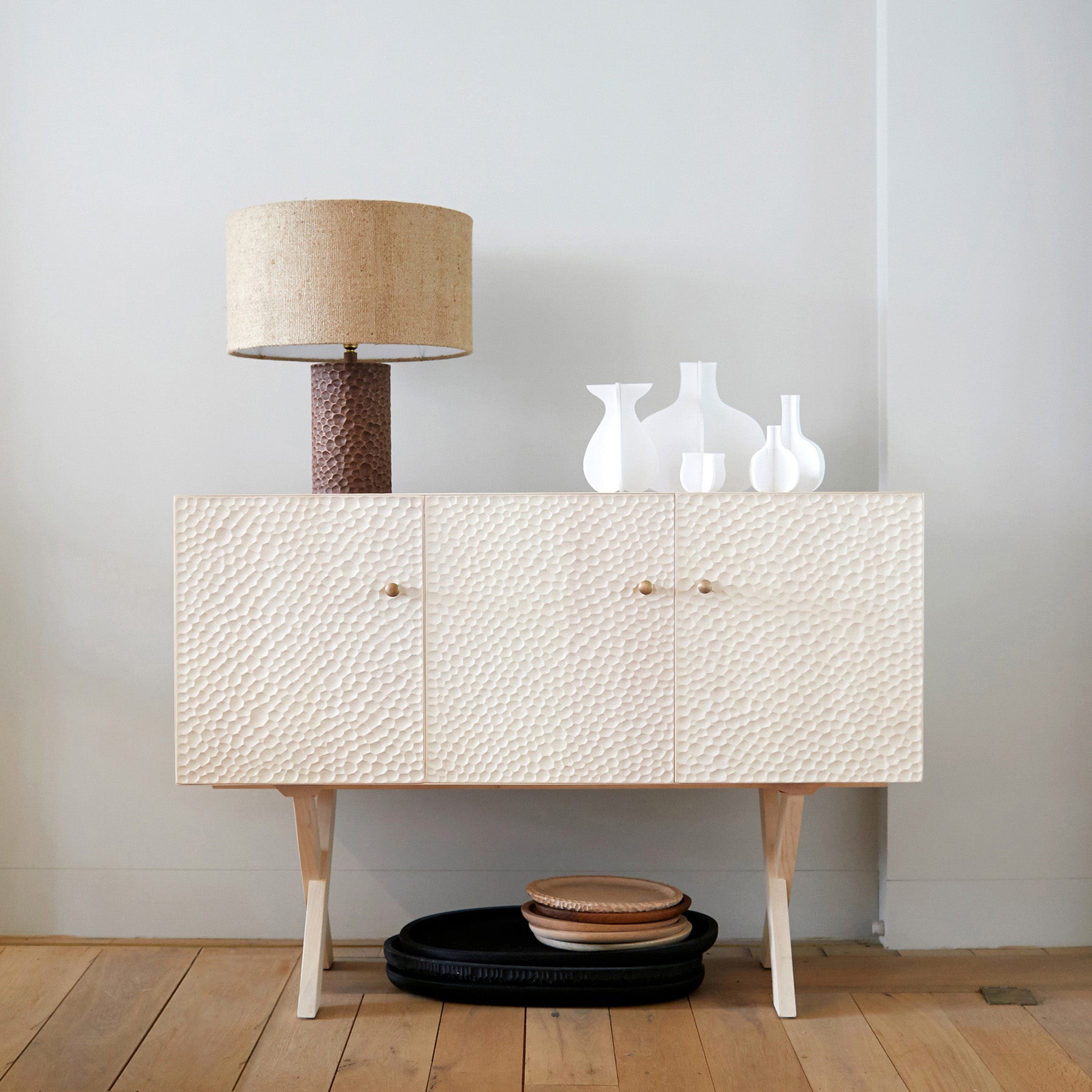 With clean lines, a classic X-base and the intrigue of hand-carvings on the front, Zanat’s furnishing makes an indelible impression. Each Touch Sideboard is unique, taking 3 days for the craftsmen to chisel the surface decoration freehand. London's Studioilse collaborated with the Bosnian brand, cited by UNESCO for its artisan heritage, on this solid-wood masterwork in a range of sustainably sourced varieties. Thoughtfully, a separate storage compartment with a removable tray-like shelf lies behind each door.