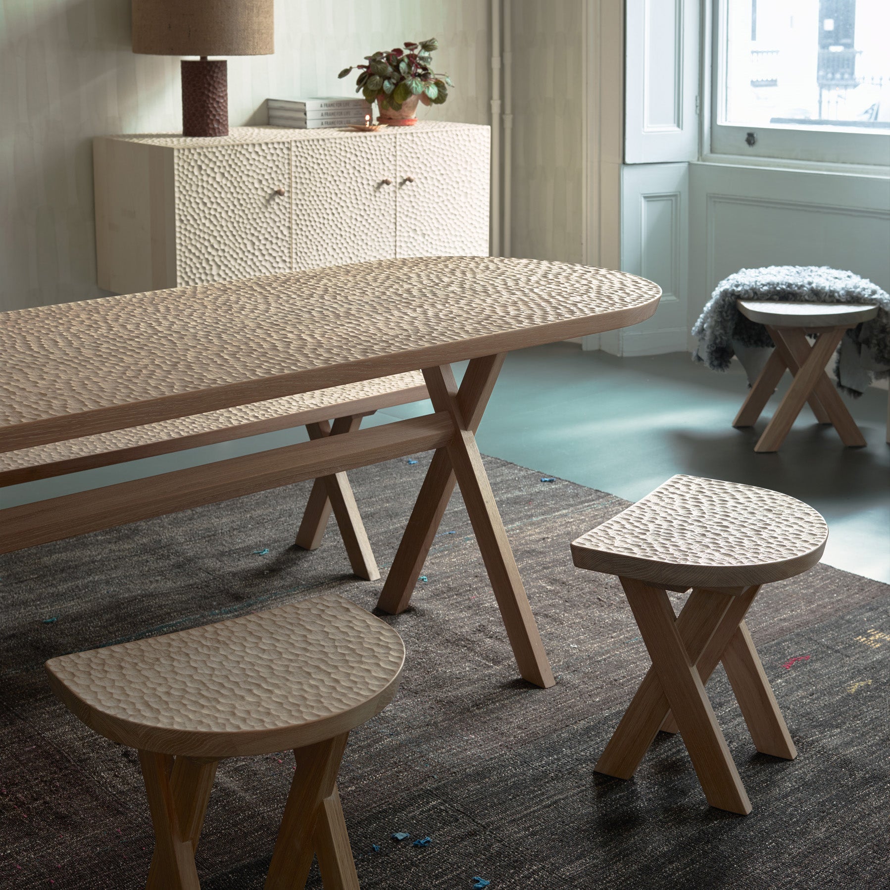 Ilse Crawford of London's Studioilse expands her Touch collection for Zanat in a solid-wood stool with a hand-carved seat in a range of sustainably sourced timbers. Incorporating the handcrafted heritage skills of the Bosian brand, each piece is unique since the craftsmen carve the pieces at random, without drawings. In both Pill and Half Moon versions, the stool can be used in a multitude of different settings—for casual seating, around a dining table or even as a small side table.