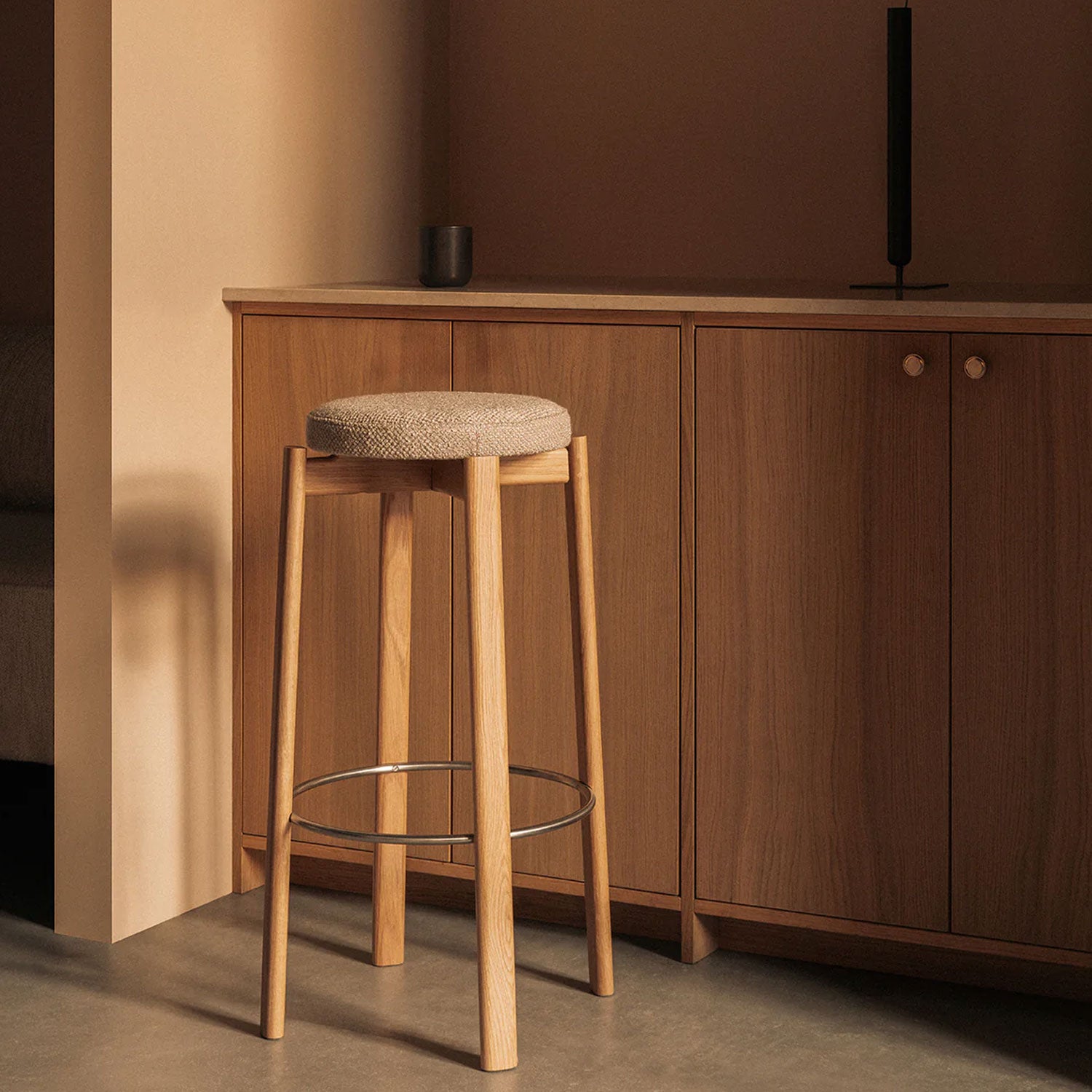 The Passage Bar and Counter Stool showcases Danish woodworking traditions with its solid oak or walnut construction, ensuring durability and natural warmth. The stool includes an upholstered seat available in a range of fabrics for personalized comfort. A well-placed foot ring, offered in black, brushed brass, or steel, provides added support for extended seating.