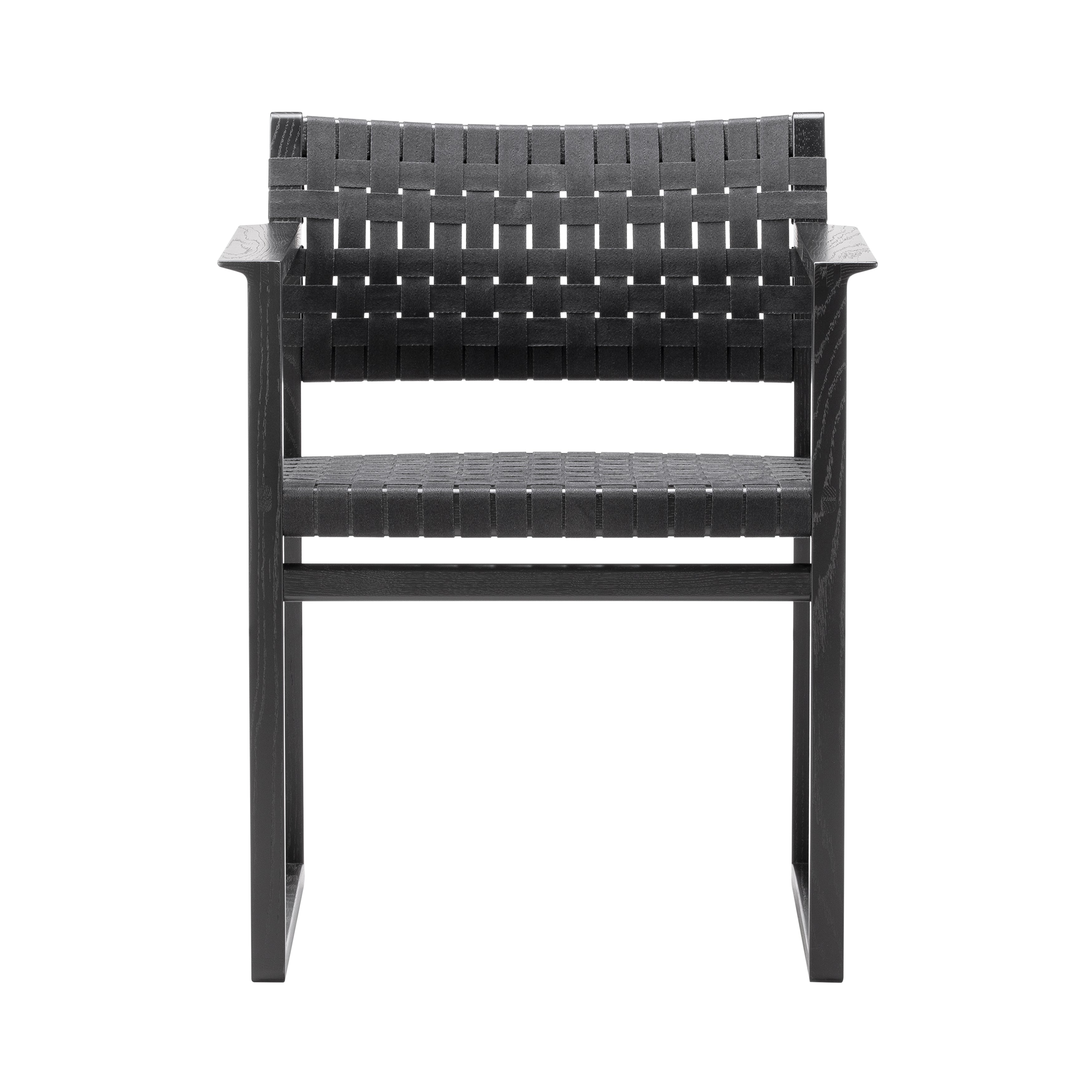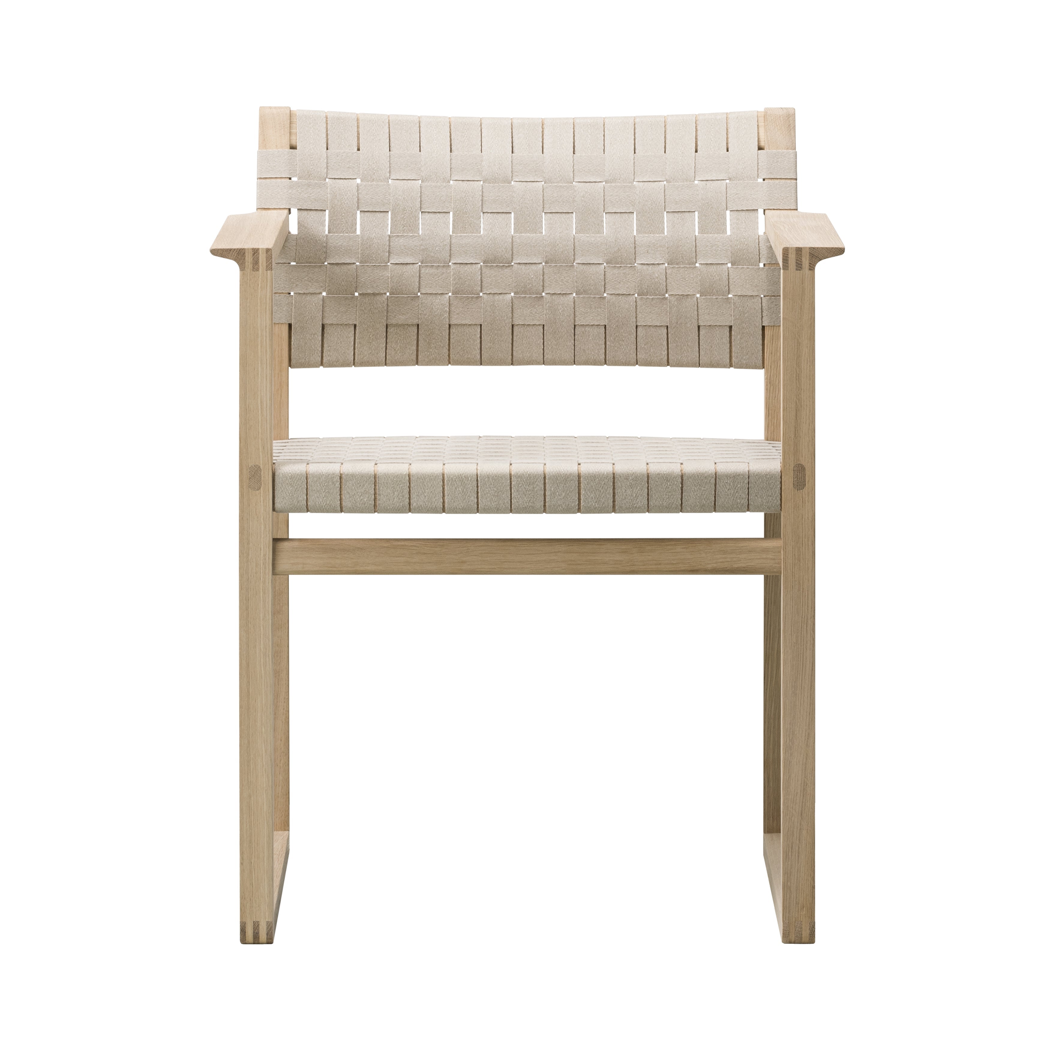 Linen webbing for the seat and back teamed with a solid-oak frame signal a clean-lined elegance in Børge Mogensen's slim and sturdy 1958 dining chair, available as the armless BM61 or armchair BM62. With the structure in solid oiled or lacquered oak and webbing in either natural or black, the seat comfortably angles precisely where optimal support for the back is needed while the lower section supports the small of the back. Finely crafted elements include exposed finger joints and runner legs that make it particularly suitable for use on carpets or with included gliders on floors.