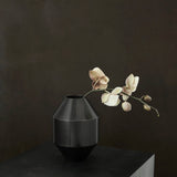 A dark, oxidized brass surface lends this vase a sculptural presence, echoing the form of ancient Greek vessels. Crafted through traditional sand-casting techniques in a Portuguese workshop, the solid brass construction develops a unique patina over time. Also available in a clear glass version and in 2 sizes. Waterproof and suitable for fresh arrangements, the vase exemplifies a balance between material presence and form.