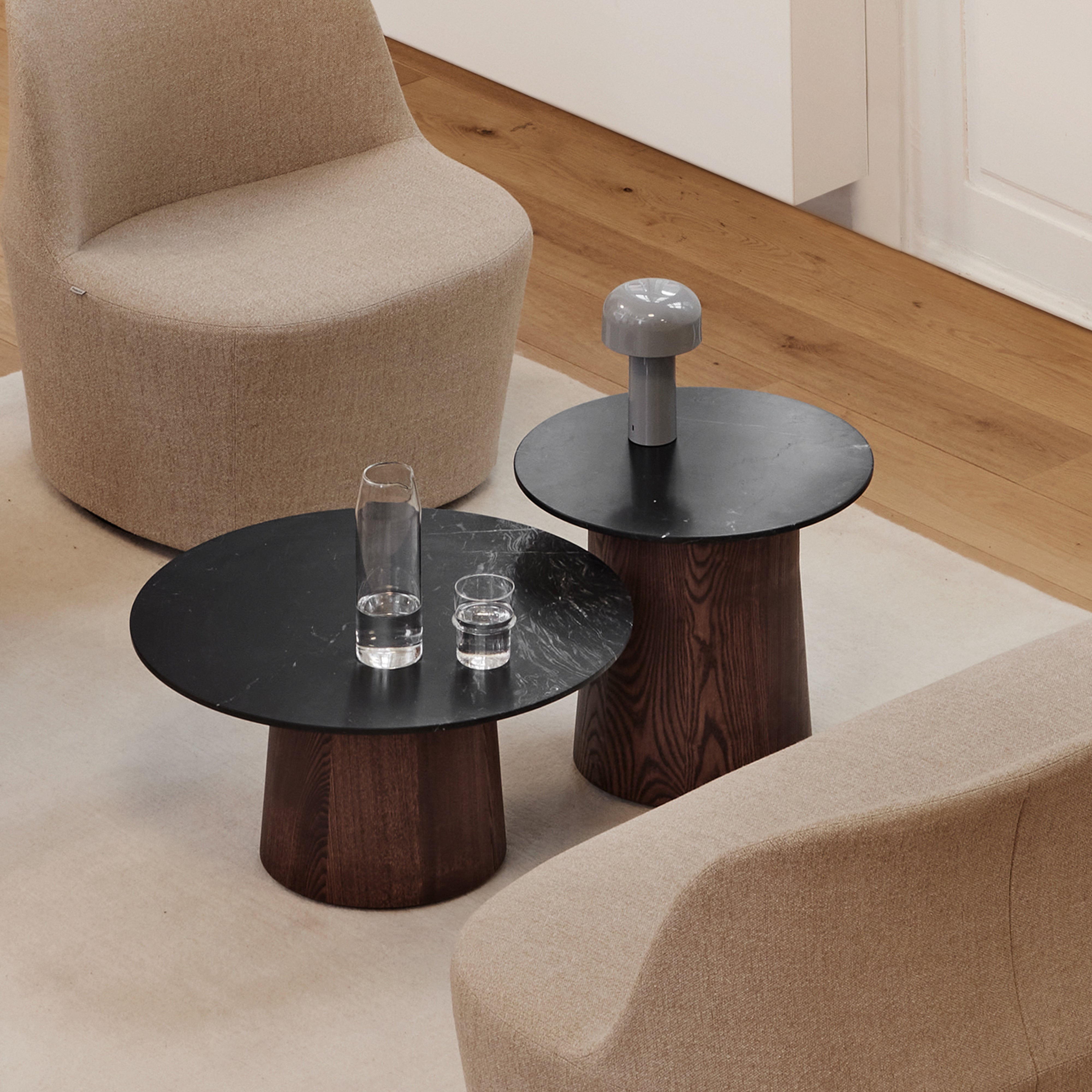 The Niveau Coffee Table pairs a smooth marble top with a lightweight, open ash wood base, creating a sense of balance between solidity and lightness. The table’s circular surface is set in contrast with the warmth of wood, emphasizing the tactile qualities of each material. With a variety of sizes and heights, the pieces can stand alone or be grouped to create layered arrangements.