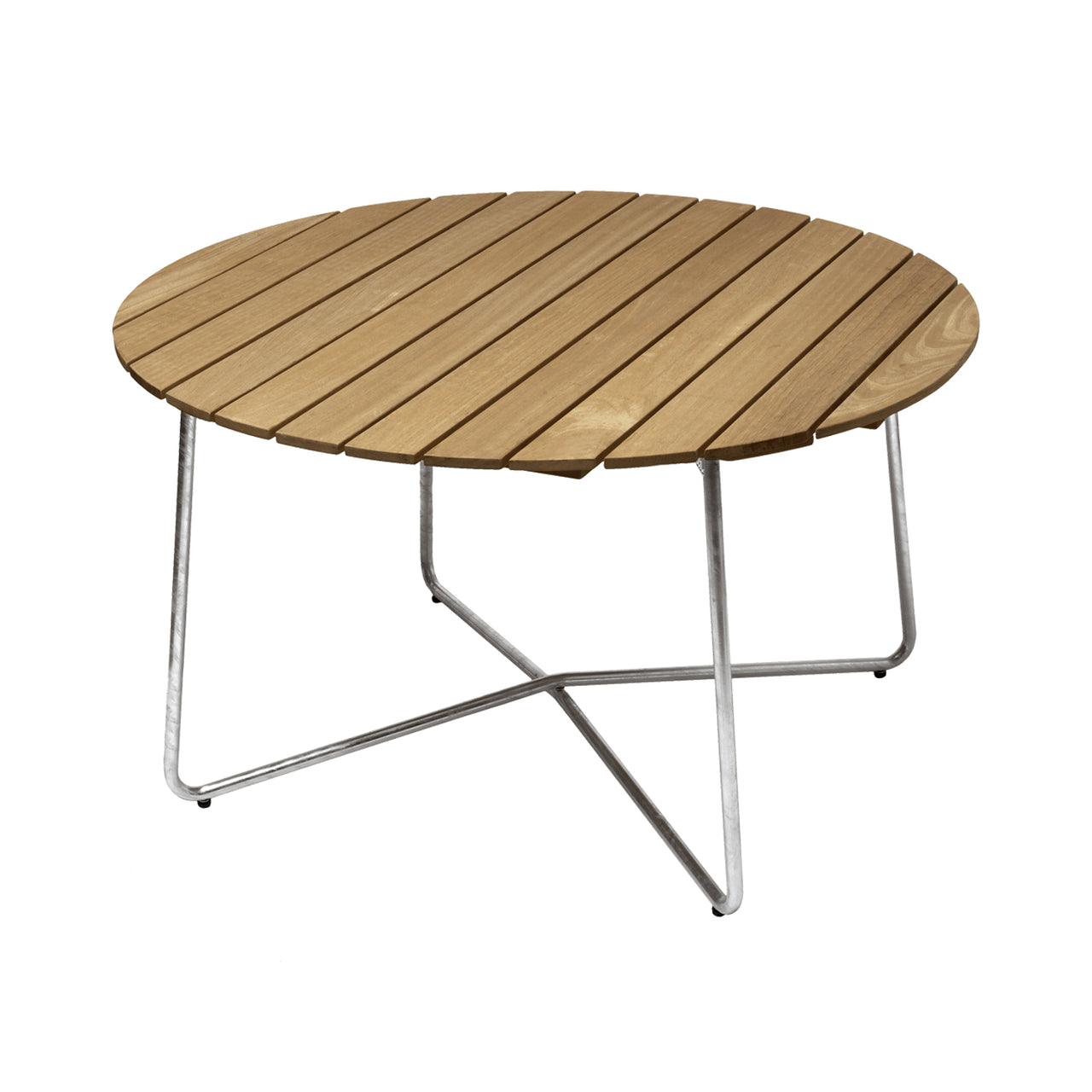 Part of the Classic series, originally designed by Artur Lindqvist in the 1930s. This table features a durable steel base paired with a round wooden top, available in variants such as untreated teak, oiled oak, oiled pine, and white lacquered oak. It is designed for outdoor use, ideal for settings like terraces or gardens. The table’s removable and collapsible base allows for easy storage and transport. Over time, the steel base acquires a matte finish, while the teak develops a silver-grey patina.