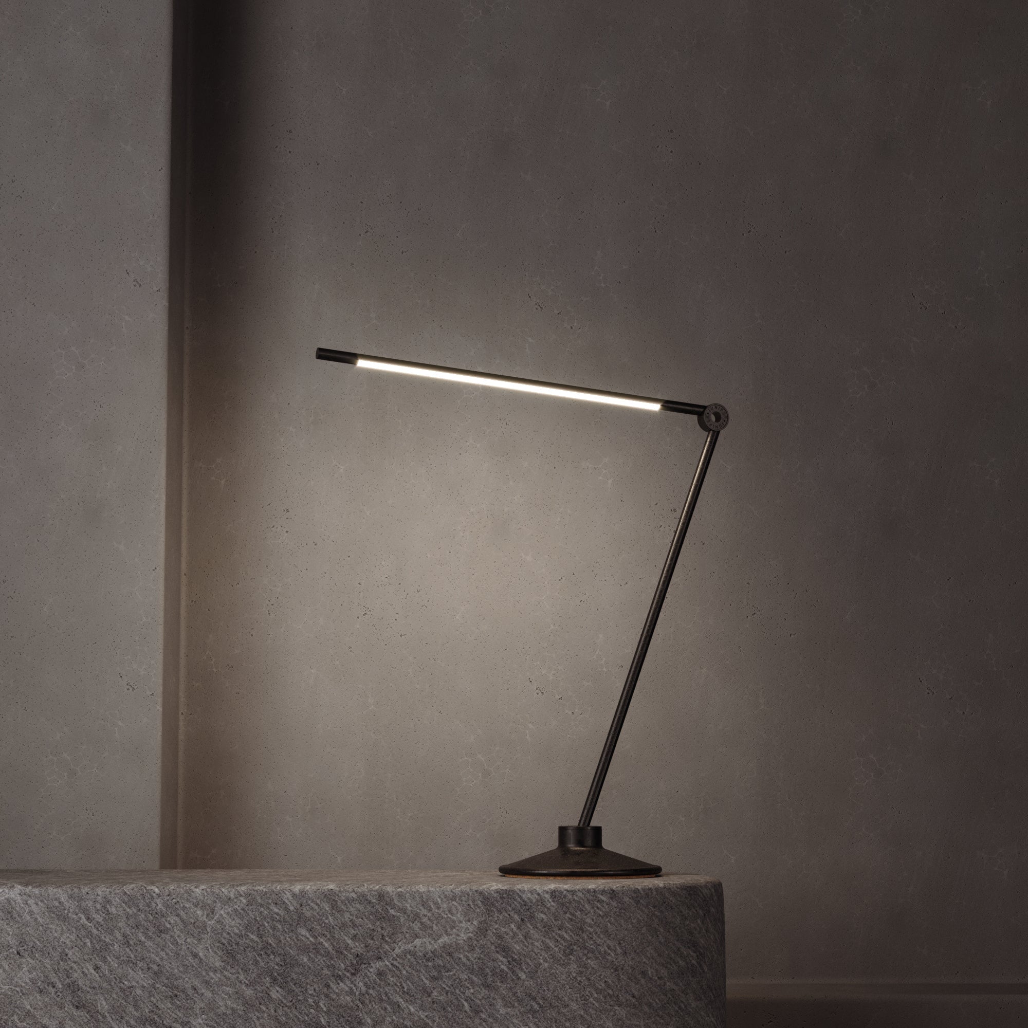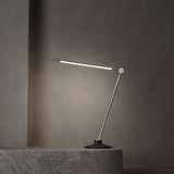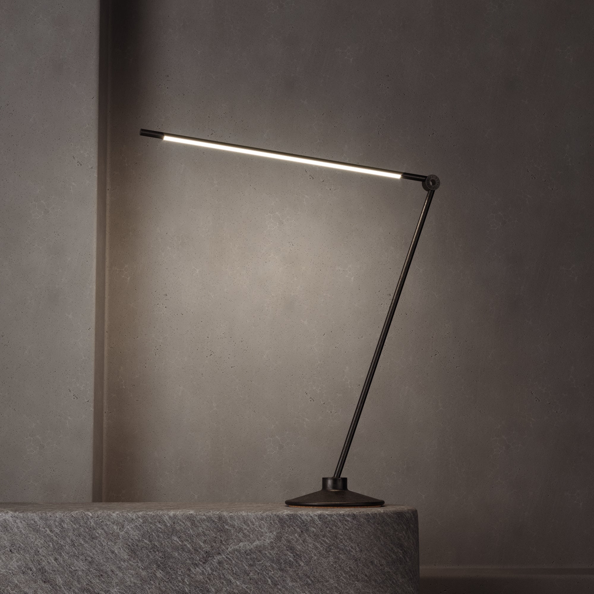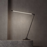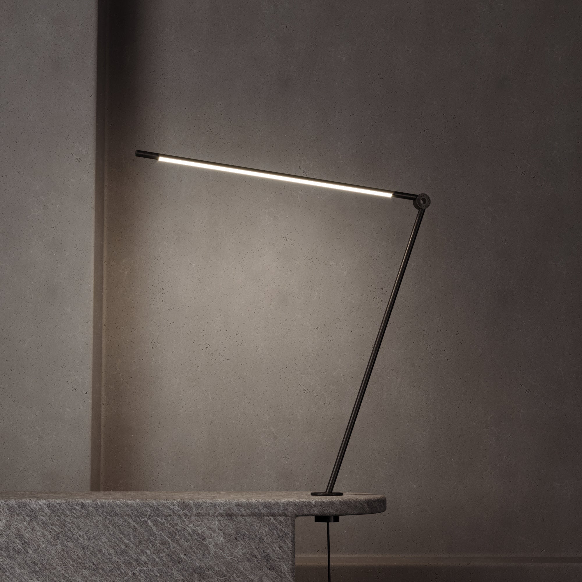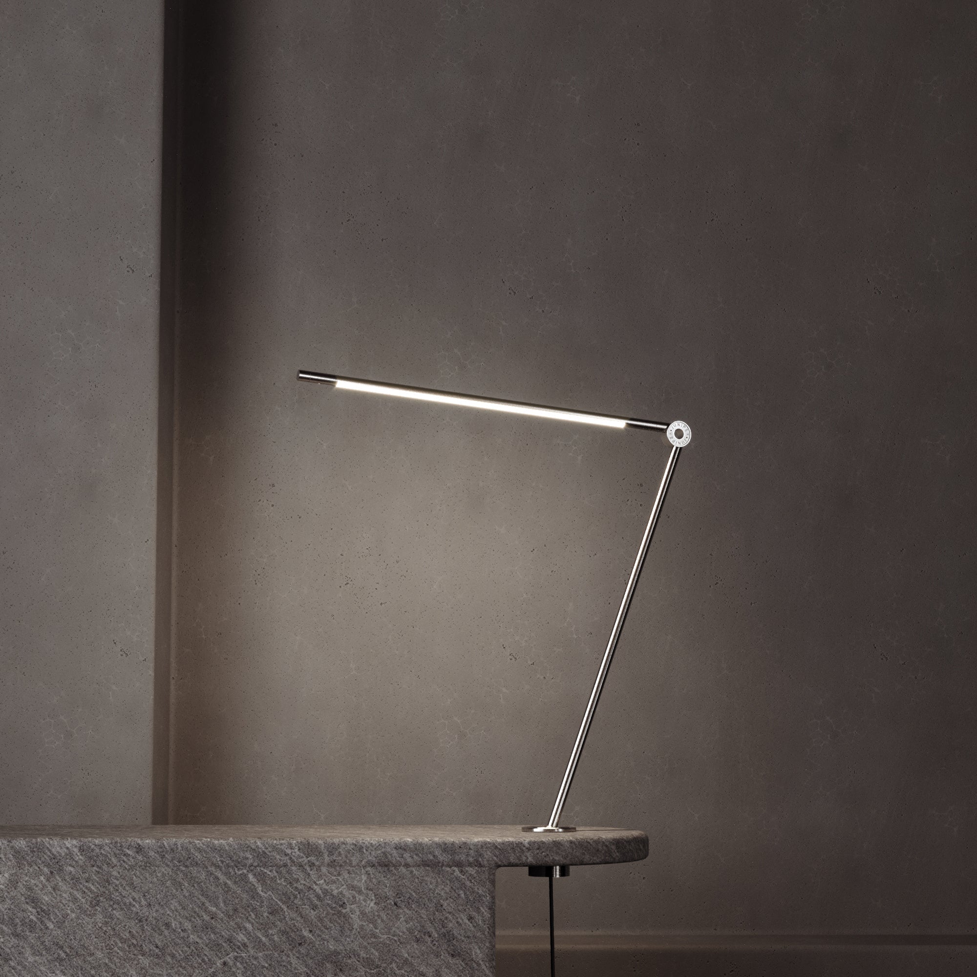 In this case, Thin really is in! By narrowing down form to the nth degree, LED technology triumphs in Thin, an innovative task light. This lithe light stylishly hews to their dicta of efficiency in both space and energy consumption. A folding ultra-thin wand of light—only 1/2 inch!—is mounted on a ball joint that allows for multi-directional movement. Angle and extend arm to 3 feet to stretch over any work surface. This sleek wonder produces an awesome 500 lumens of warm white light, powered by 33 high-powered dimmable LEDs. Turn knob at the end of the light tube to elegantly dim.
