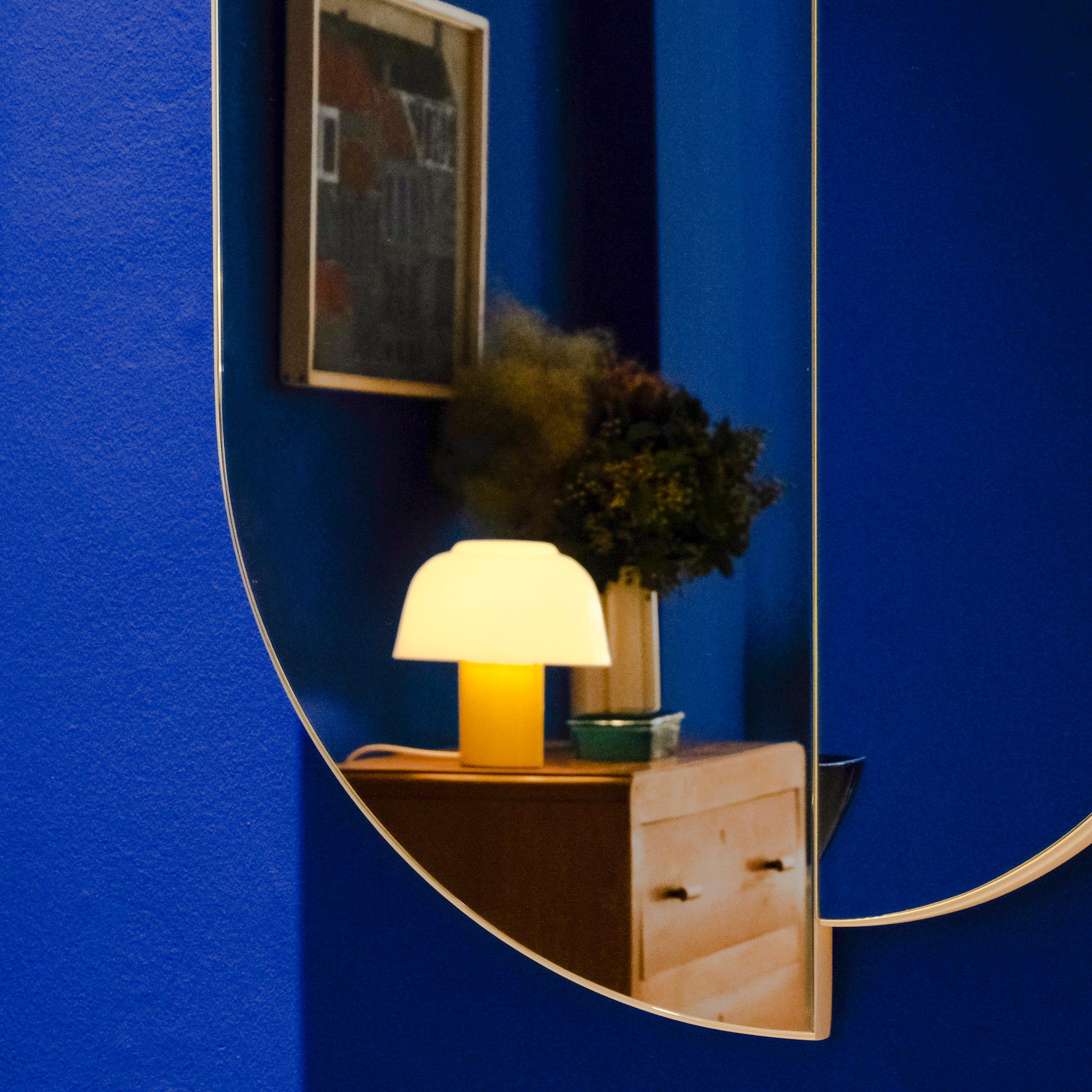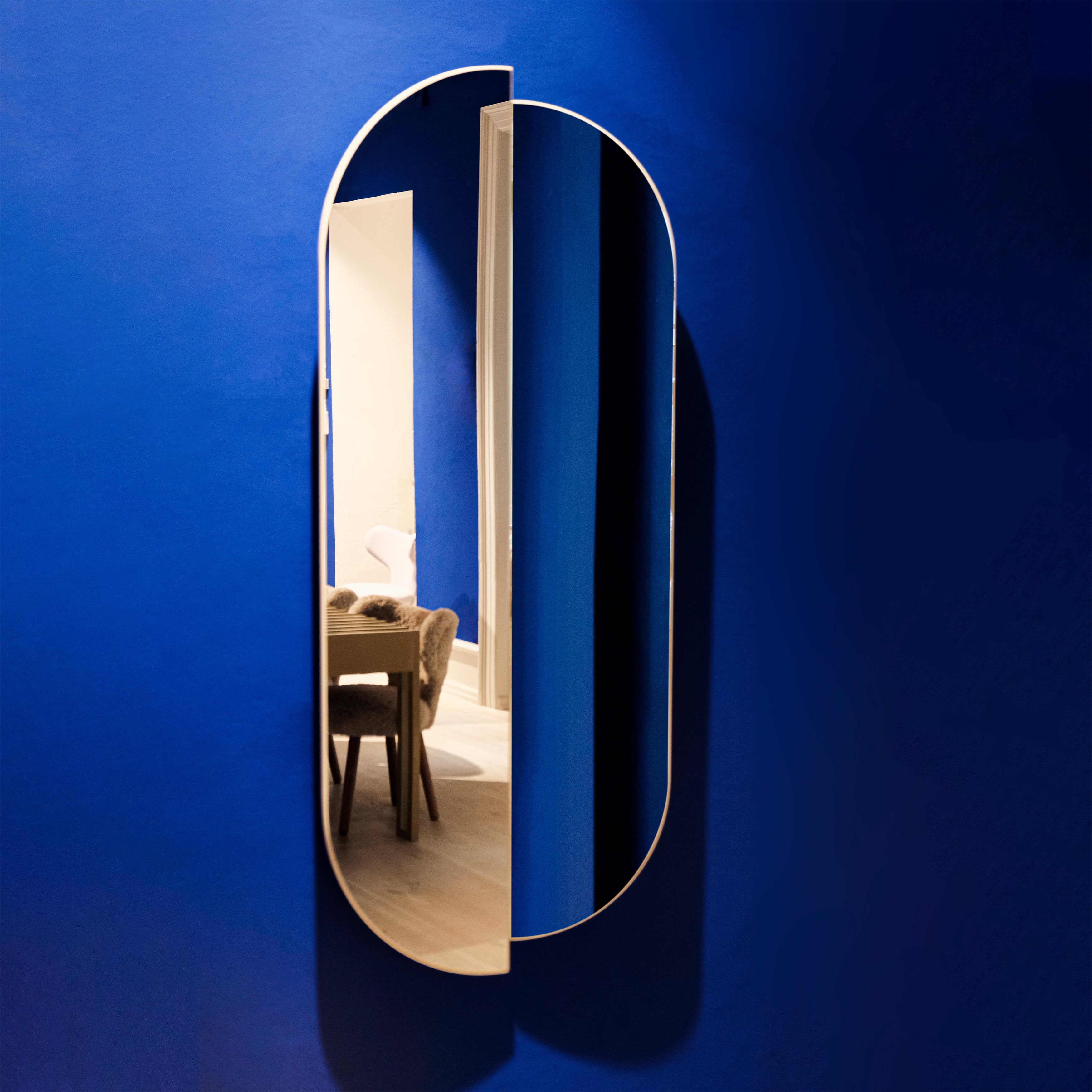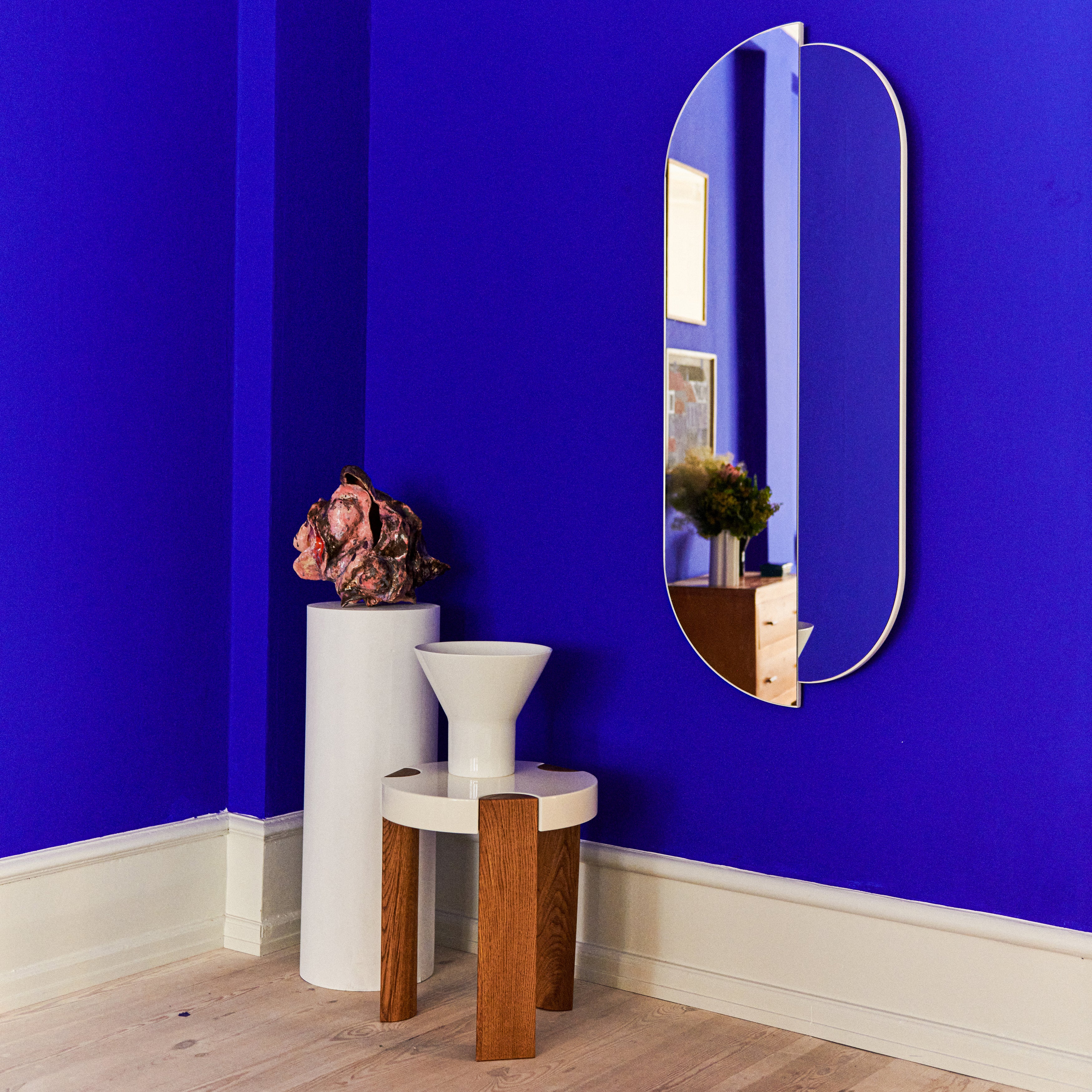 The Rae Mirror, created by Jessica Vedel, elevates the traditional mirror into a sculptural interior piece, crafted from MDF, solid wood, and glass. This full body variation comes in White, Dark Red, and Ivory. The Rae Mirror plays with reflections by sculpturally combining two mirrors at different angles into one piece of functional decor.