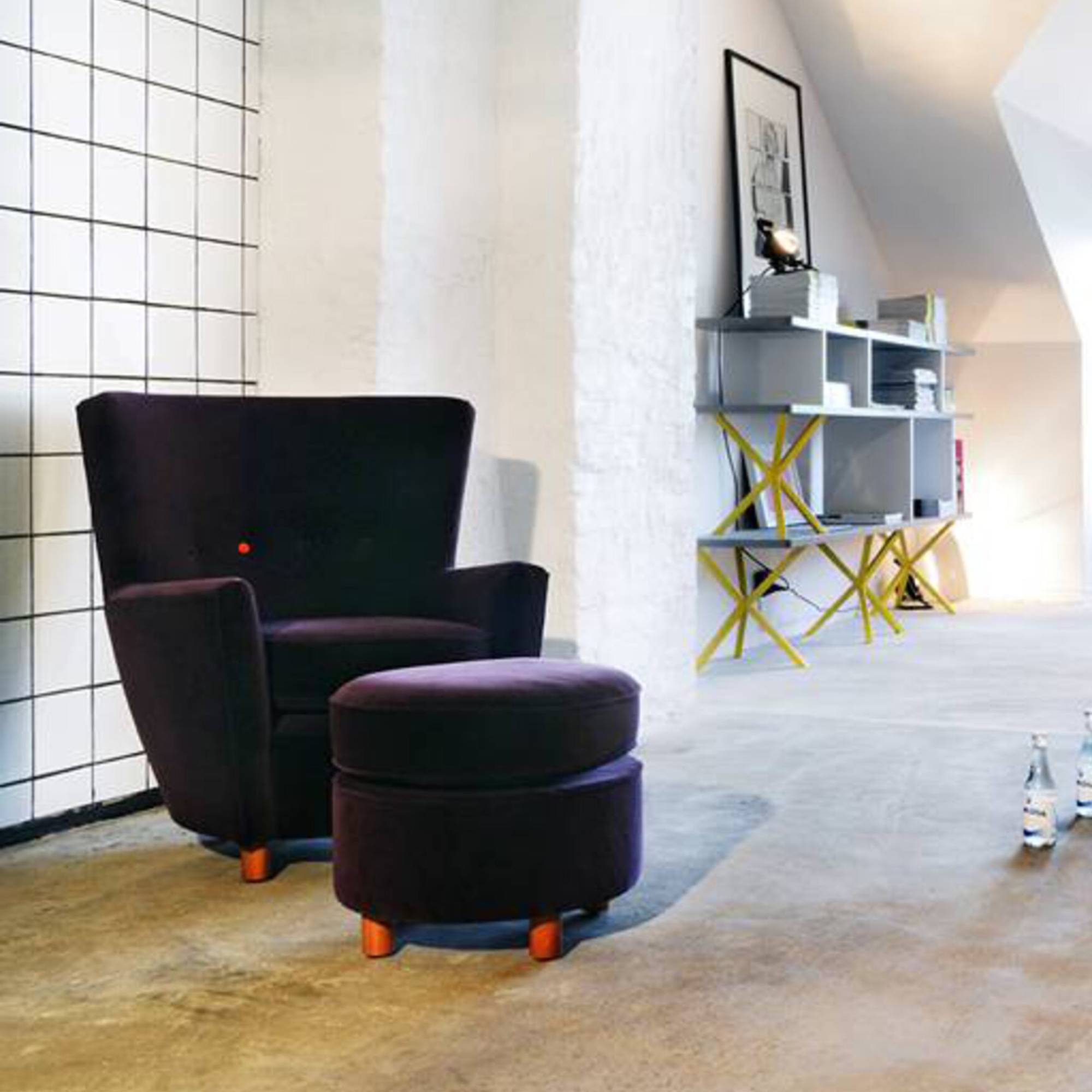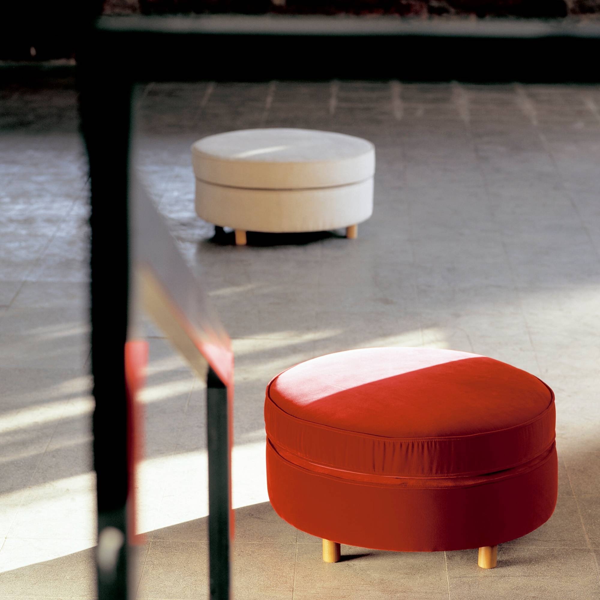 Stretch out in comfort with Santa & Cole's rounded ottoman to pair with its similarly contoured Moragas Armchair (also at A+R). Noted postwar architect Antoni de Moragas Gallissà designed only a few pieces of furniture in his lifetime and all are now considered classics. The footrest also doubles as an extra seat for guests, with hand-finished upholstery in a range of fine fabrics to match the chair.