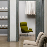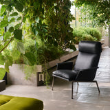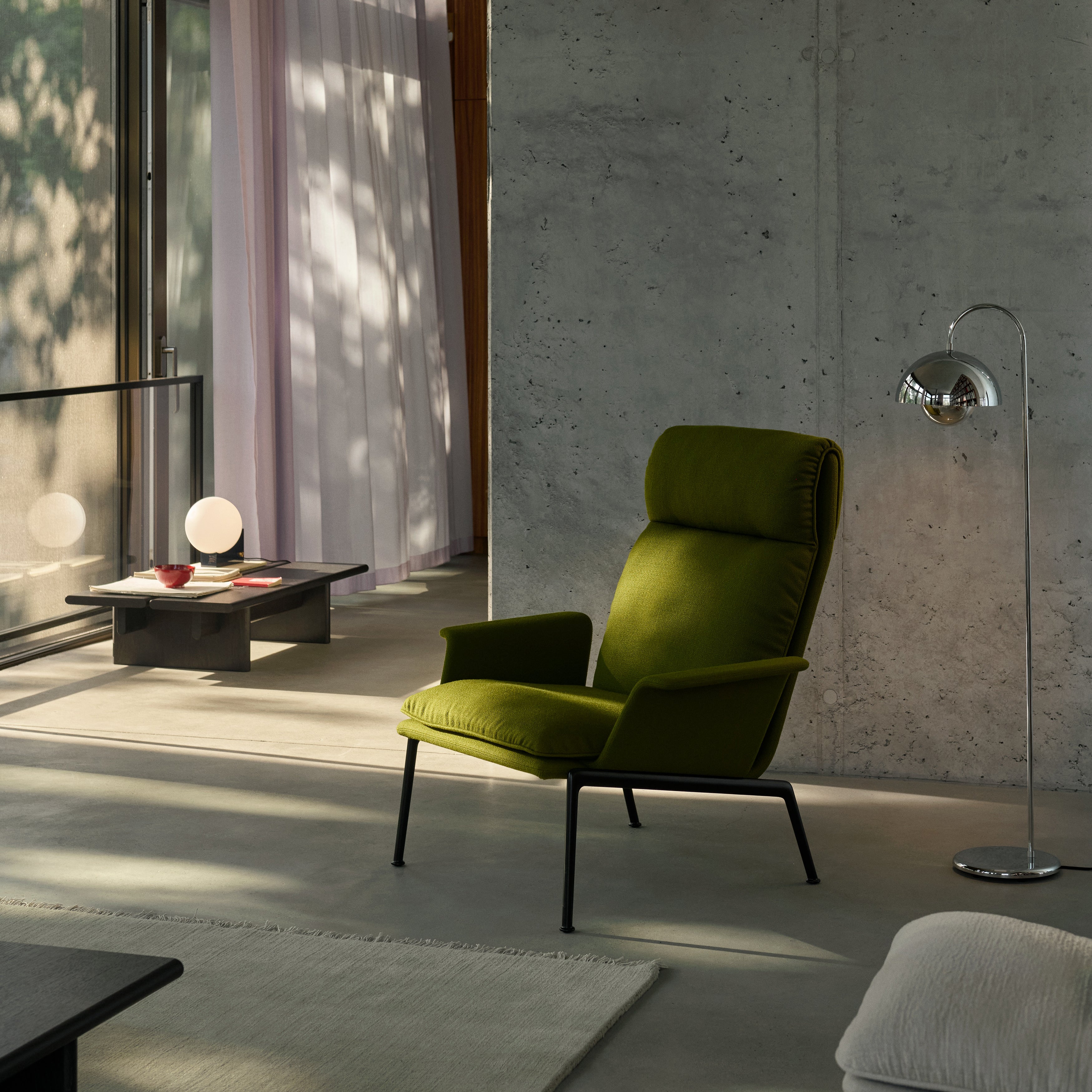 A tall backrest and angled base offer supportive seating designed for extended rest. Built with a form-pressed plywood frame, high-resilience foam, and polyester wadding, the chair is constructed for long-term use and everyday comfort. Cast aluminium legs in dark chrome or warm black finishes provide a stable foundation.
